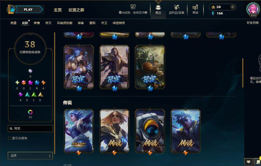 163英雄/38皮肤/1神话/8限定/16炫彩/4传说/4史诗/黄金账号等级:252/