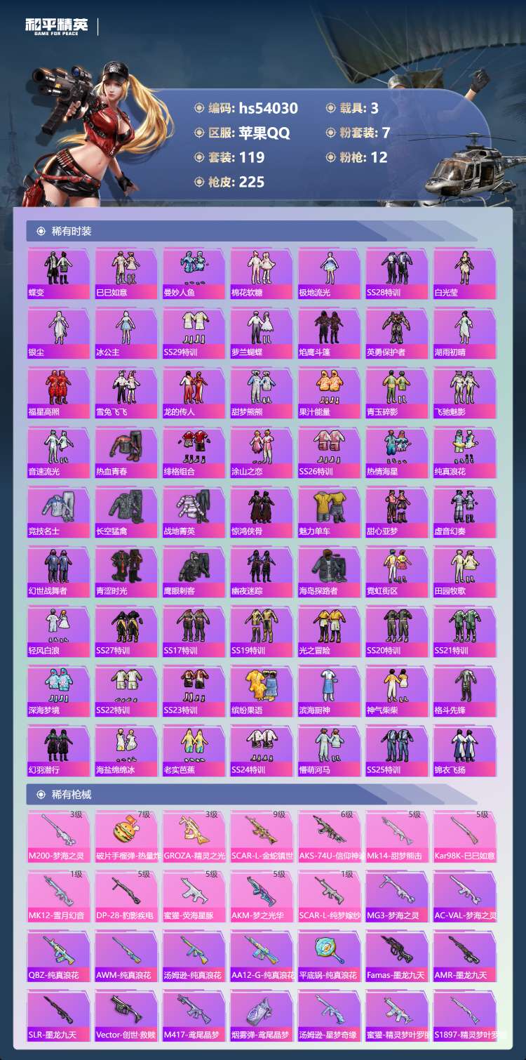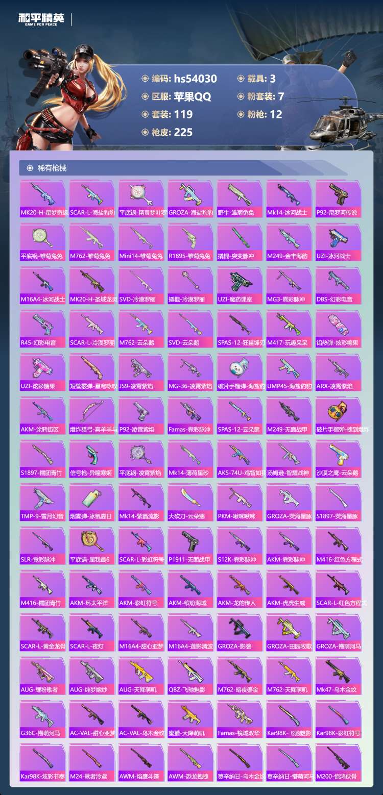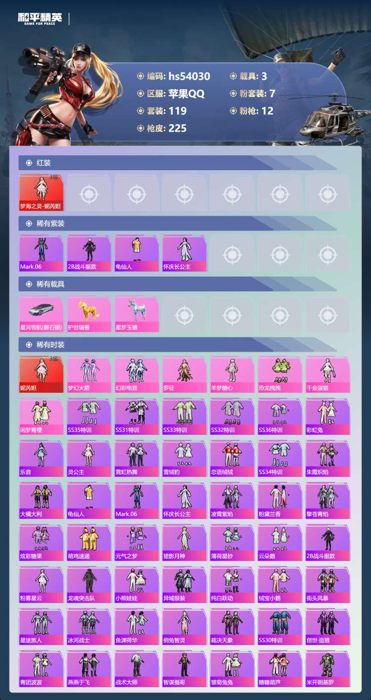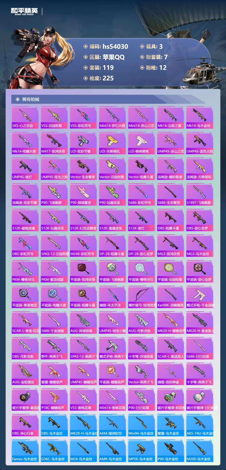 hs54030 苹果手Q-14王牌印记-1红装-7粉装-12特效枪-3载具-78079热力值-119