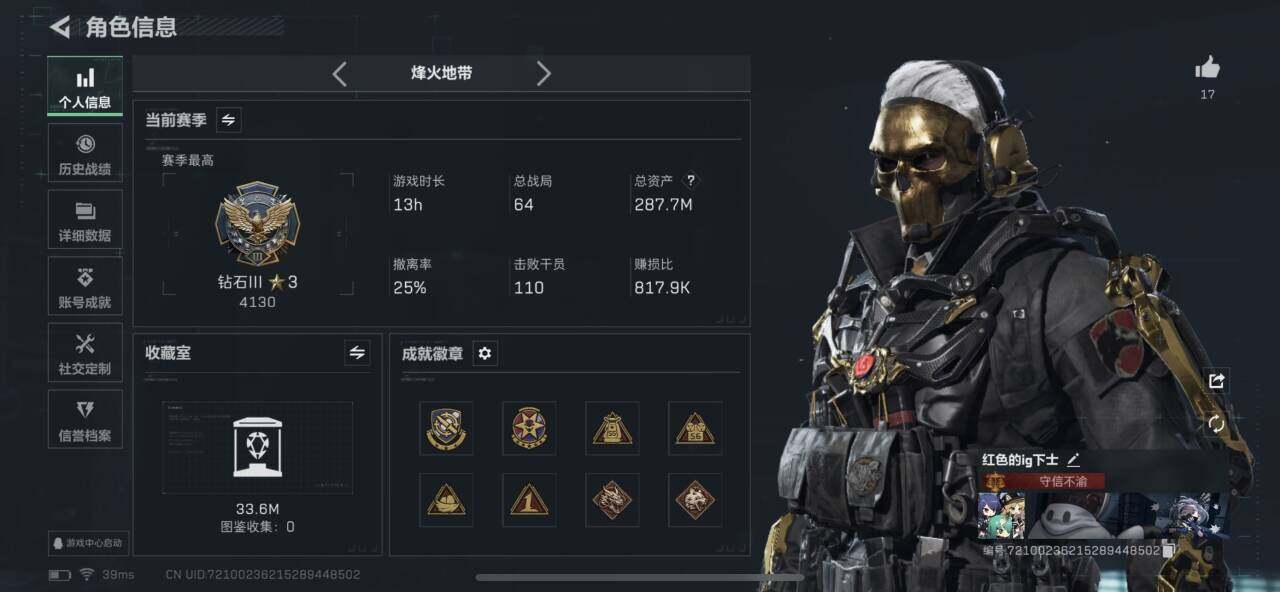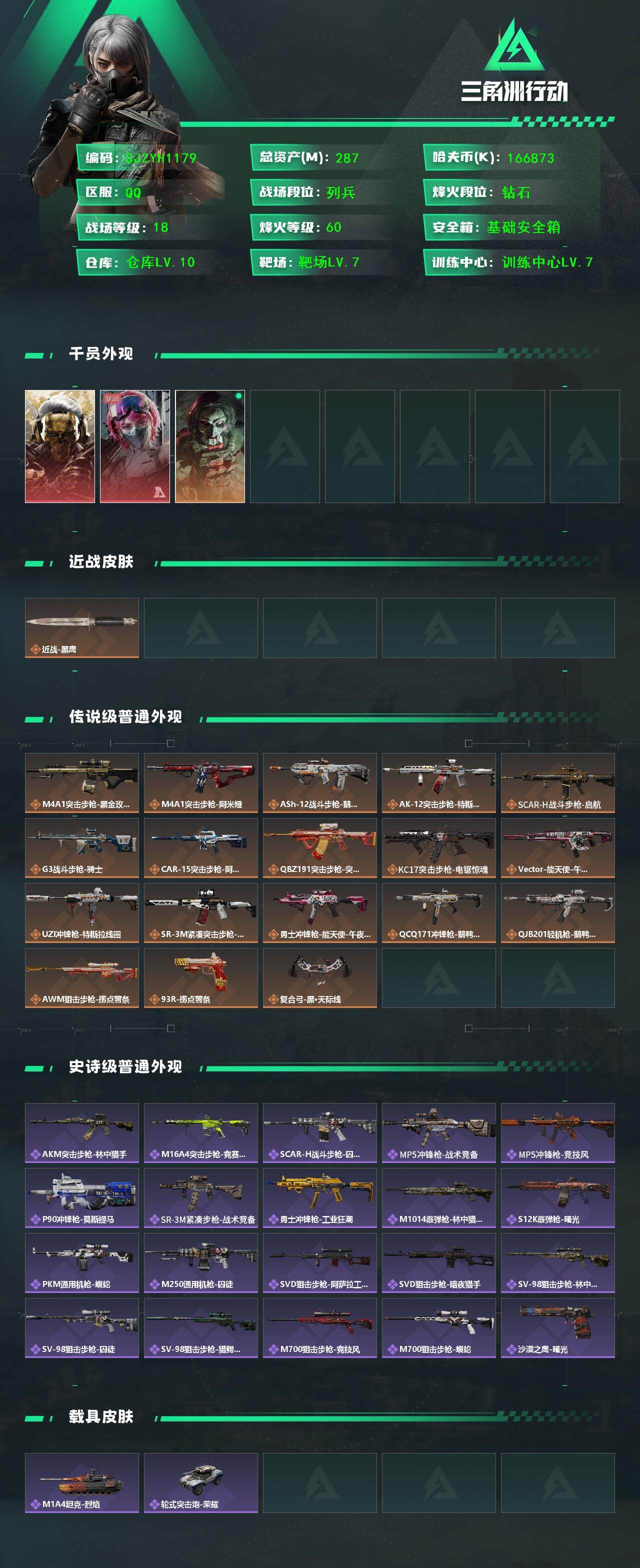 总资产(M):287M/哈夫币(K):166873K/全面战场等级:18_段位:列兵/烽火地带等级:60_段位:钻石/