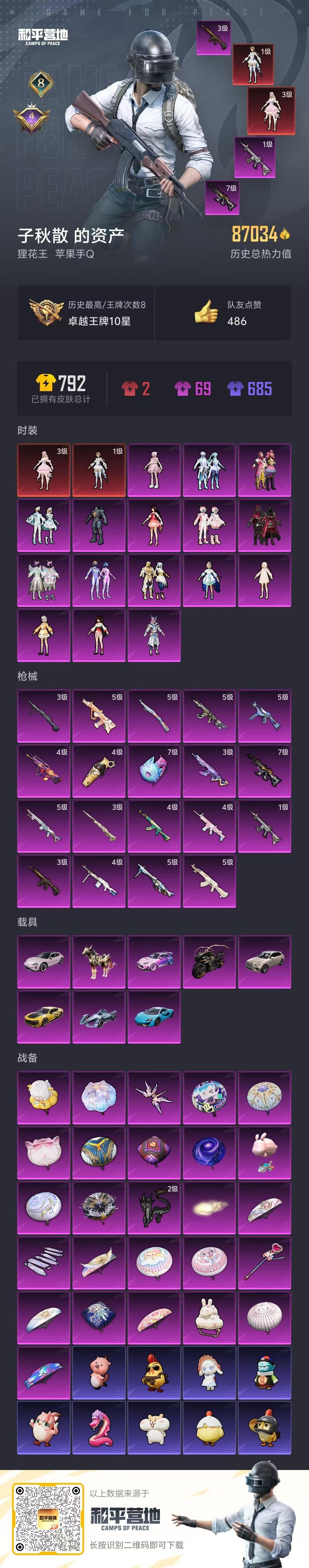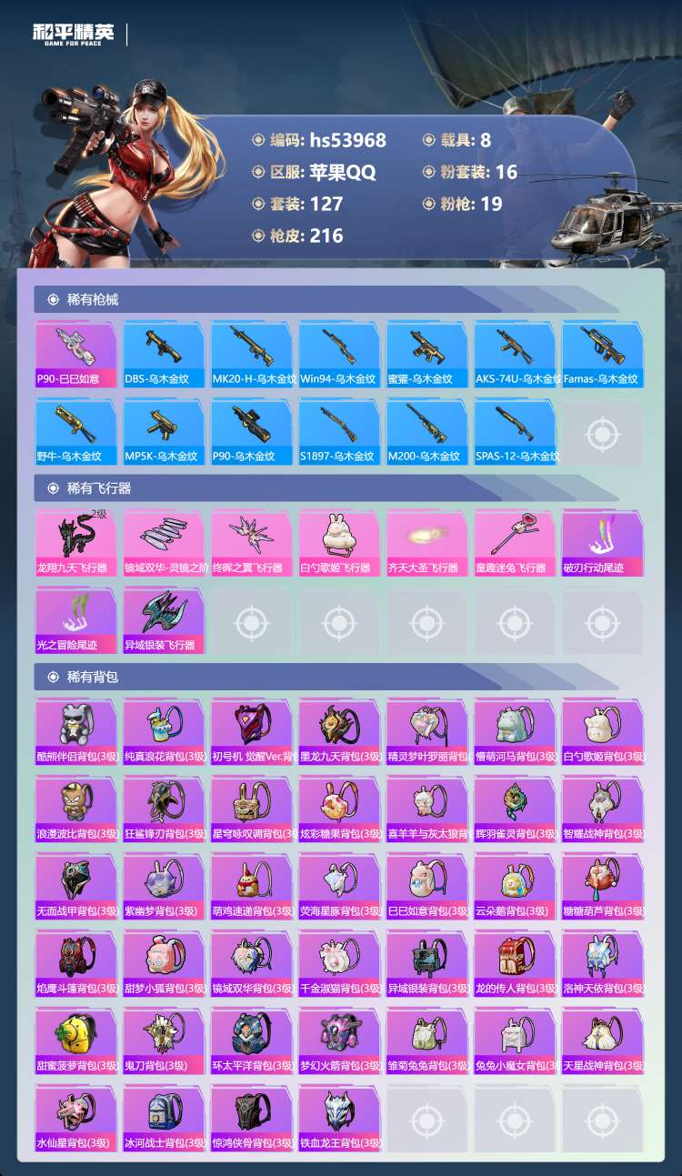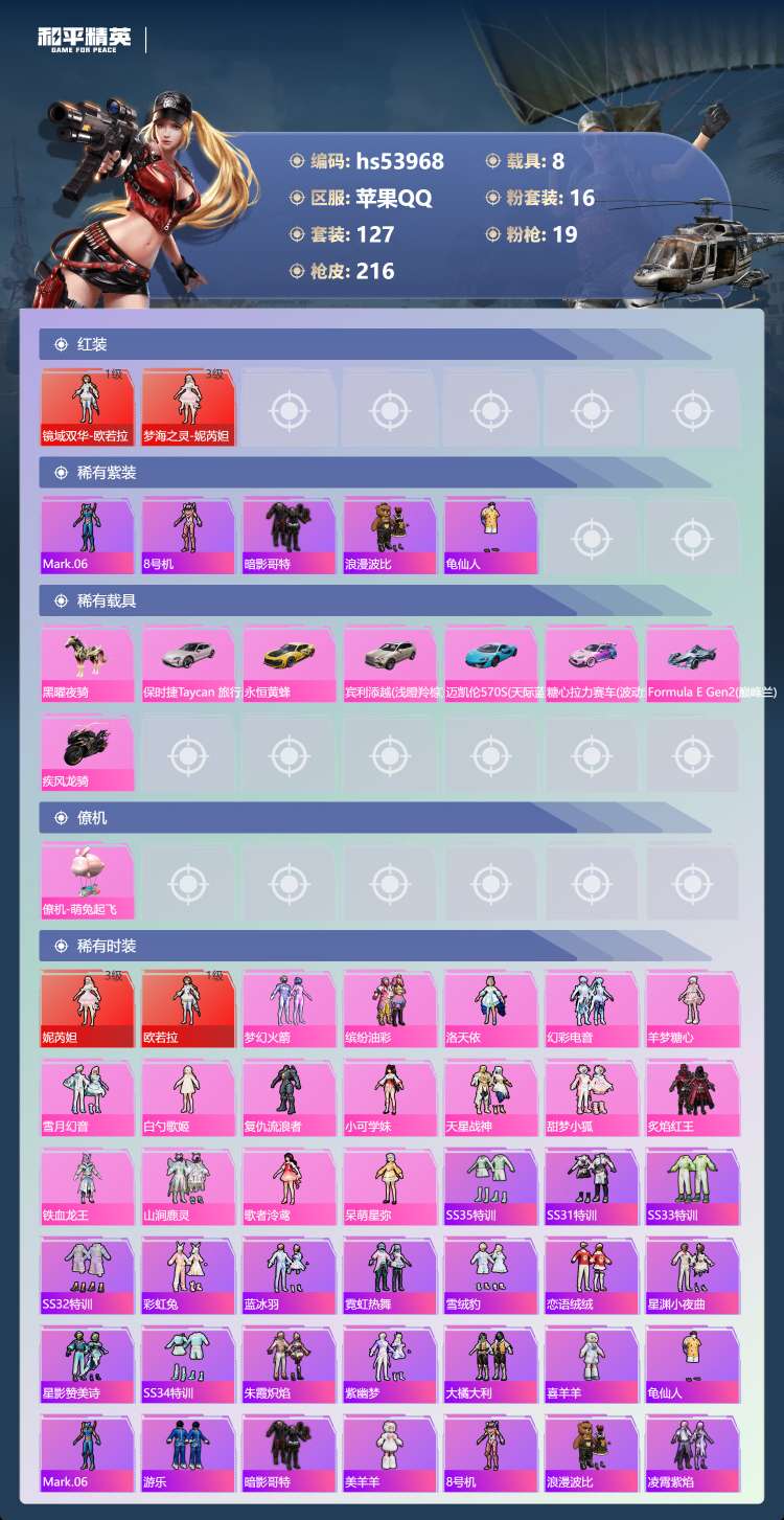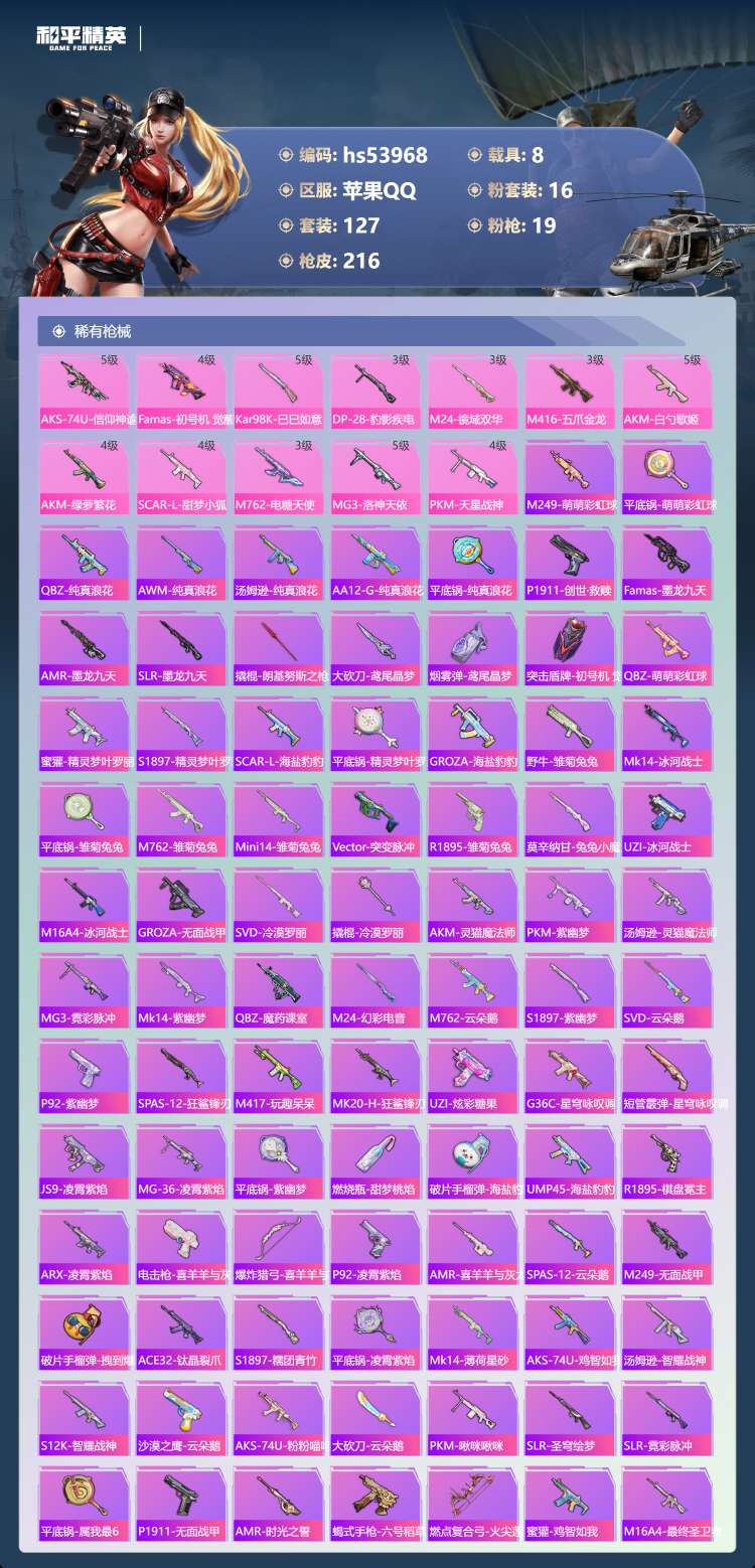 hs53968 苹果手Q-8王牌印记-2红装-16粉装-19特效枪-8载具-87034热力值-127