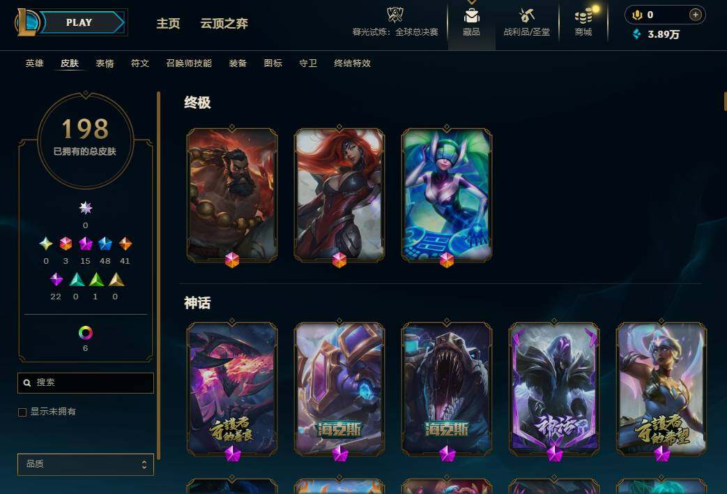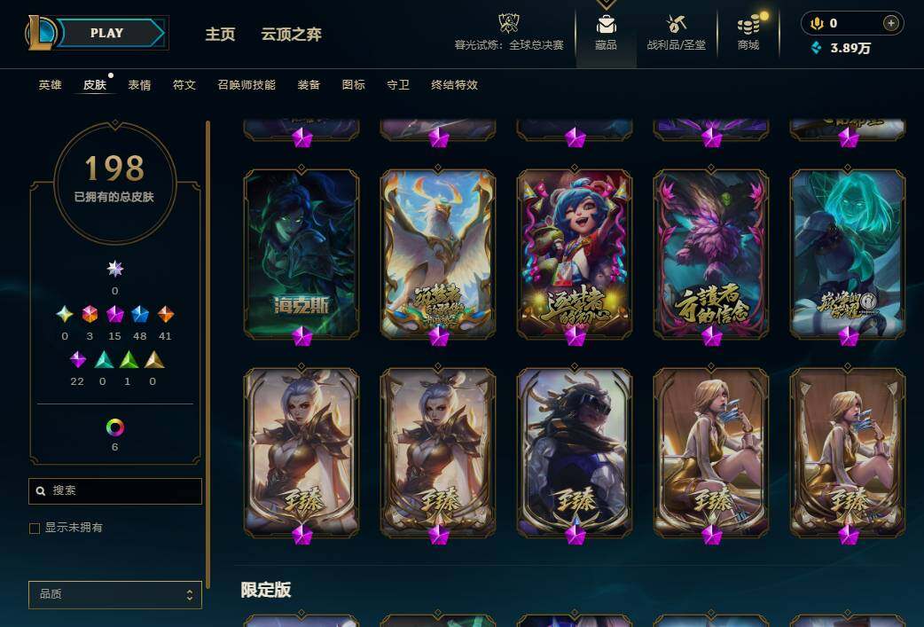171英雄/198皮肤/3终极/15神话/48限定/3臻彩/11炫彩/41传说/22史诗/黄金