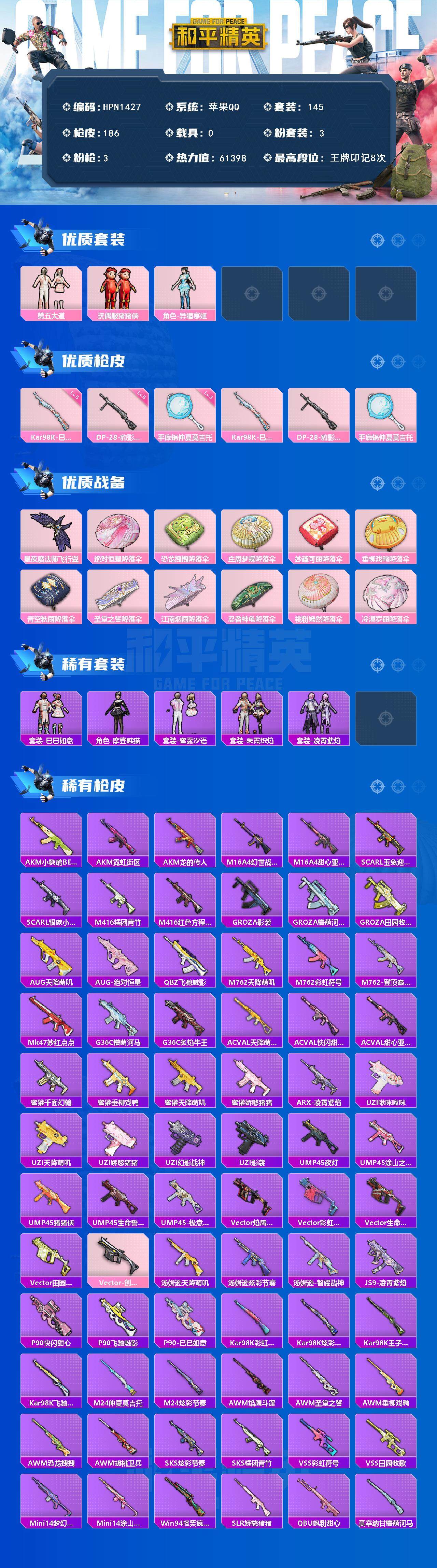 【HPN1427】145套装/枪械3/装备262/战备158/王牌印记8/热力值61398/五级Kar98K-巳巳如意/五级DP-28-豹影疾电/三级平底锅-仲夏莫吉托/套装-浪漫天命/奇异狩猎者/套装-龟仙人/角色-Mark.06/第五大道/玩偶服-猪猪侠/角色-异瞳寒姬/Kar98K-巳巳如意/DP-28-豹影疾电/平底锅-仲夏莫吉托/星夜魔法师飞行翼/绝对恒星降落伞/恐龙拽拽降落伞/庄周梦蝶降落伞/妙趣可丽降落伞/垂柳戏鸭降落伞/青空秋雨降落伞/圣堂之誓降落伞/江南烟雨降落伞/忍者神龟降落