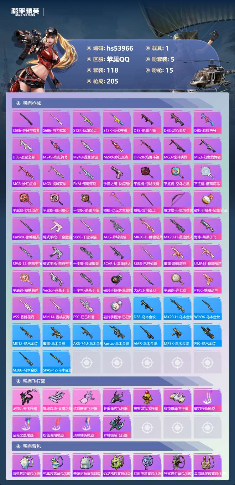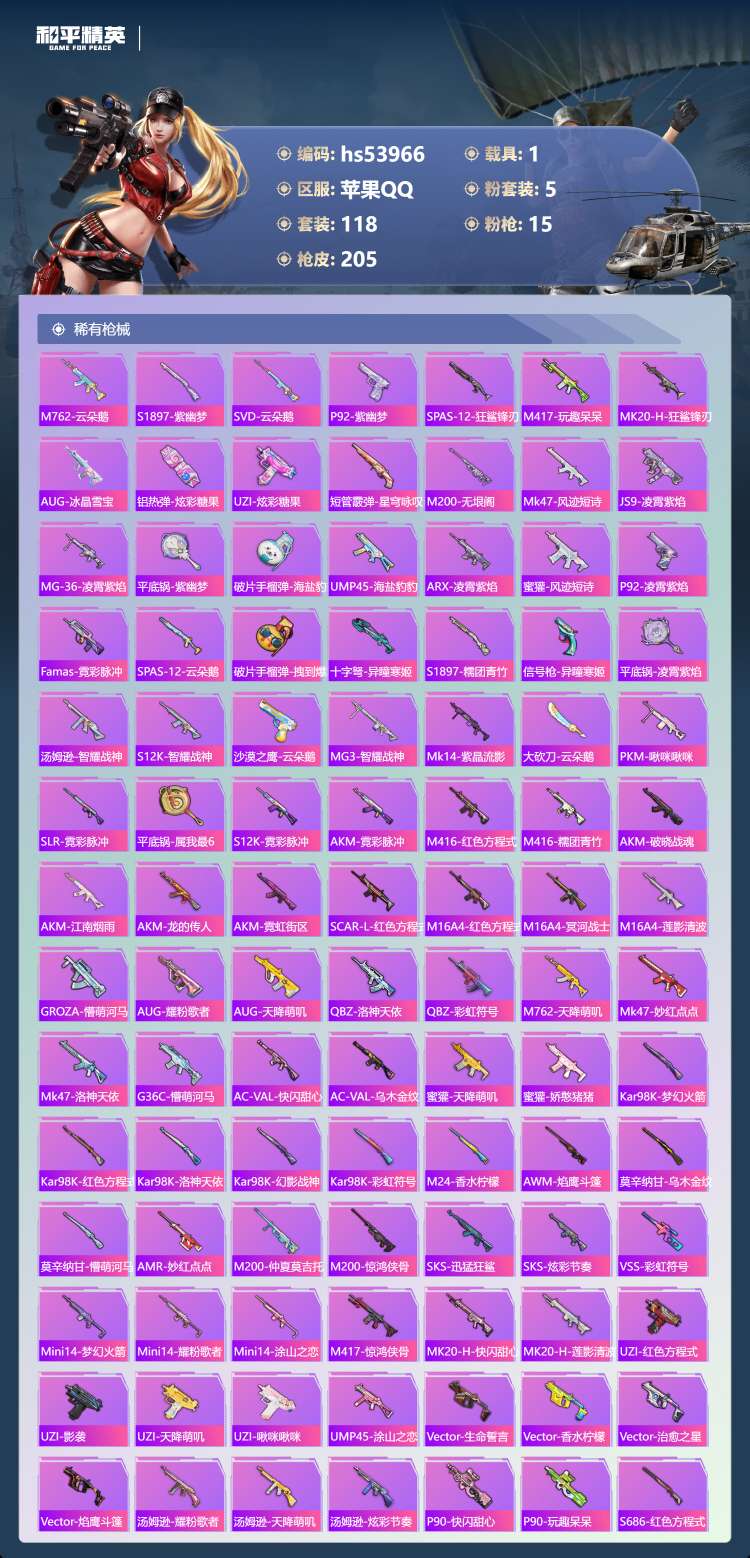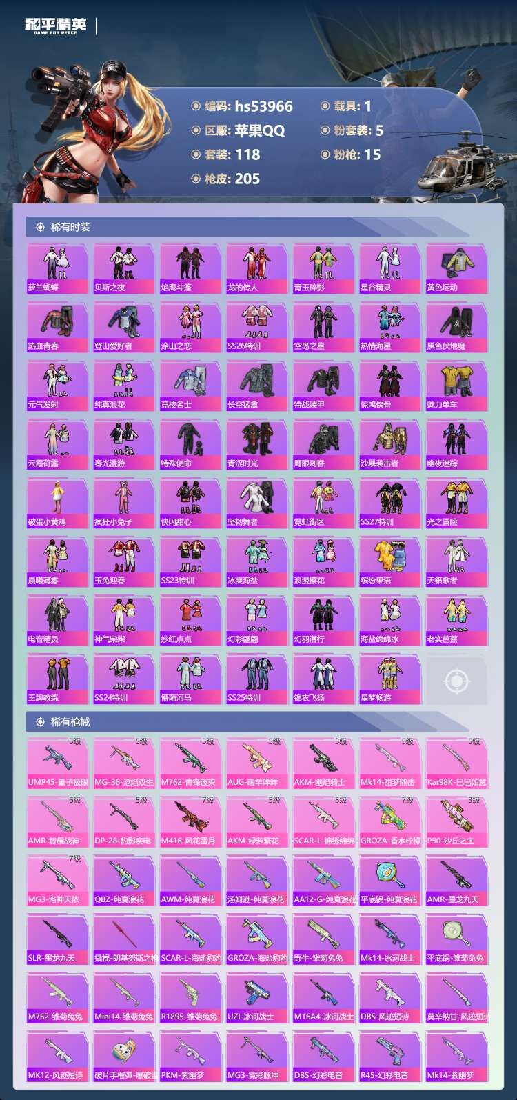 hs53966 苹果手Q-12王牌印记-5粉装-15特效枪-1载具-68481热力值-118套装-2