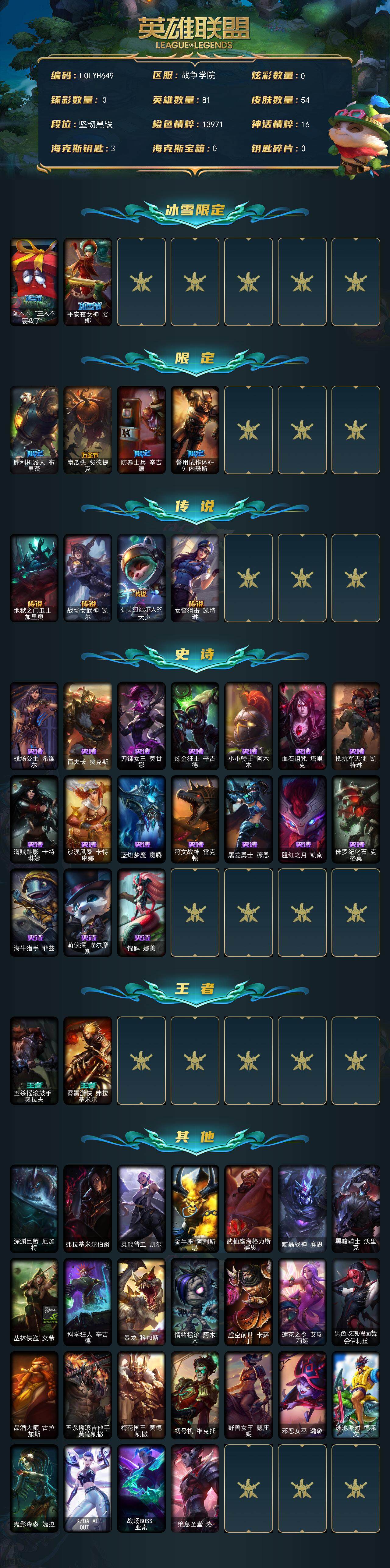 81英雄/54皮肤/6限定/4传说/17史诗/黑铁/