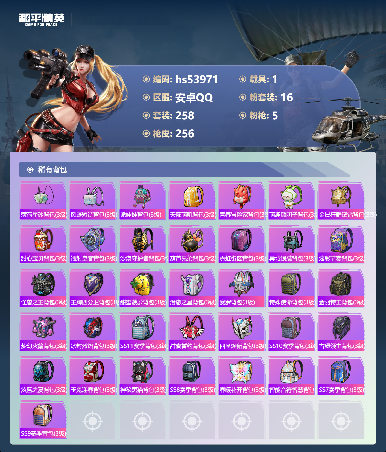 hs53971 安卓手Q-7王牌印记-16粉装-5特效枪-1载具-93045热力值-258套装-25