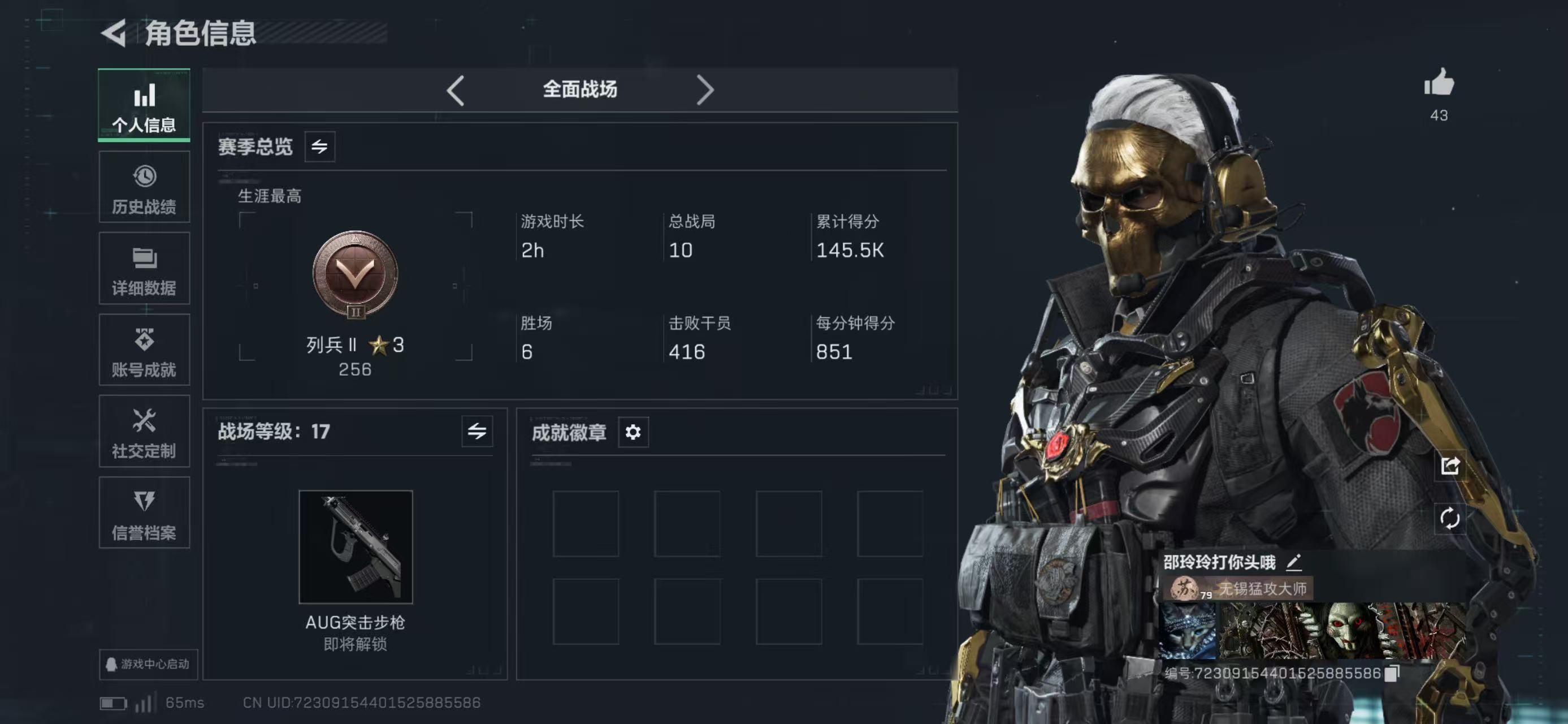 总资产135.81M,哈夫币 4099.29K,战场等级:17 列兵,行动等级:60 黑鹰,角色皮肤
