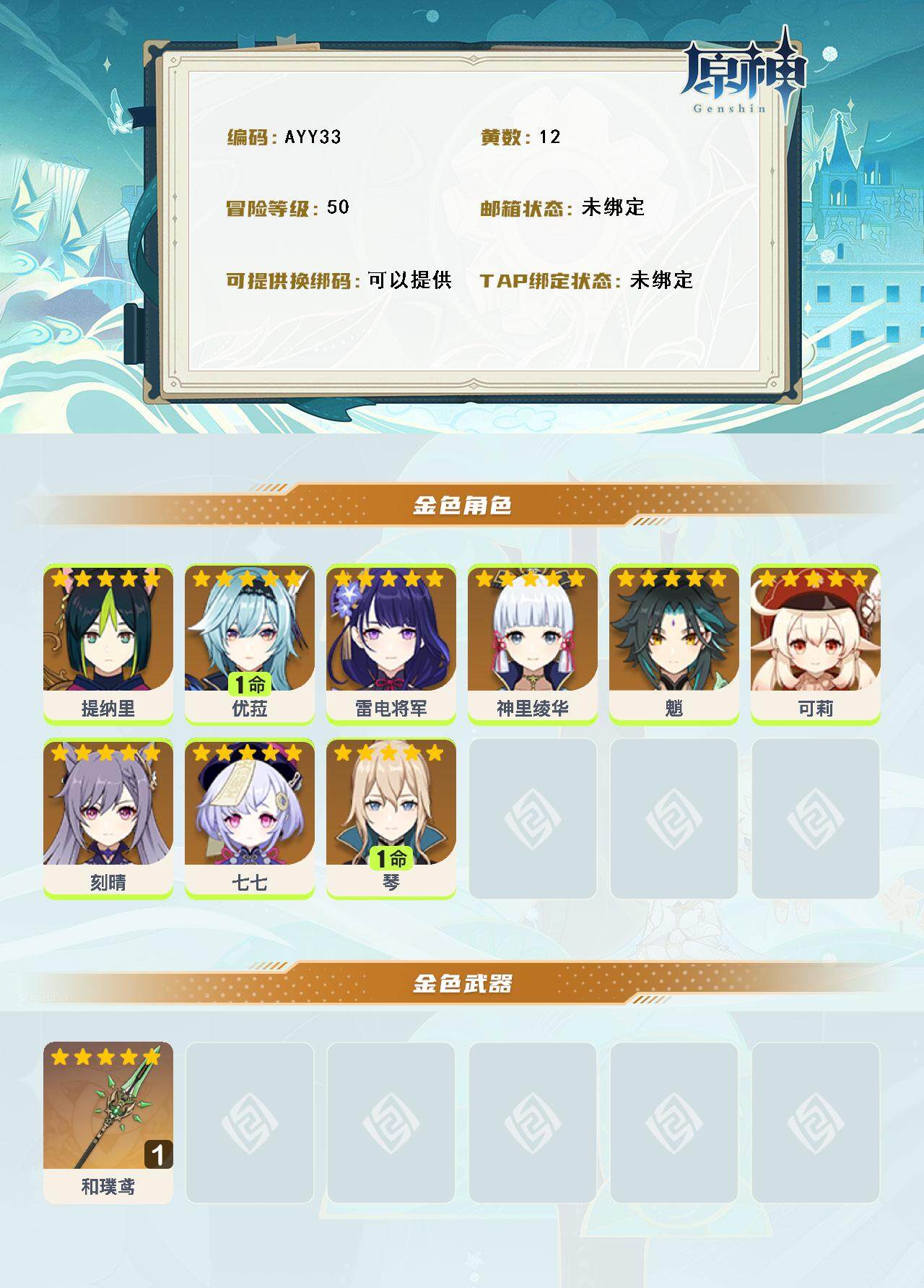 50级/12黄/女主/9个五星角色/1个五星武器0命提纳里,1命优菈,0命雷