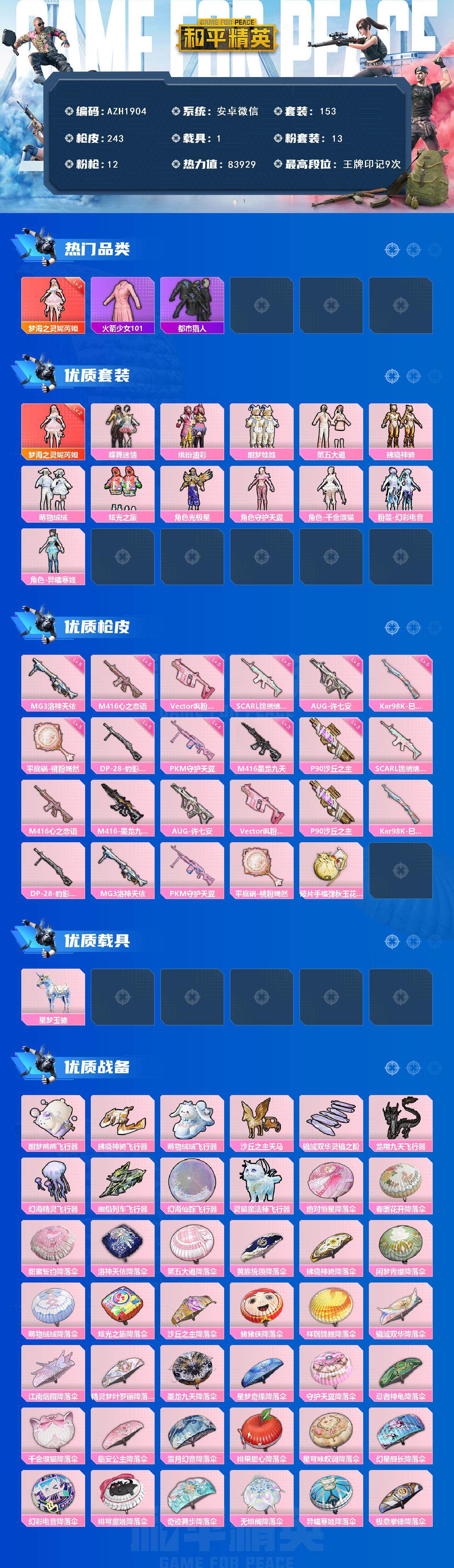 【AZH1904】安卓 微信【二级妮芮妲 老101猪脸都市暗影哥特 三级沙丘之主P90五级洛神天依MG3 1载具星梦玉骢】1神装-13粉装-12特效枪-1载具-13粉色飞行器-83929热力值-9王牌印记-153套装-243枪皮
