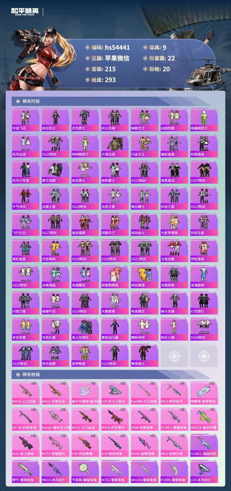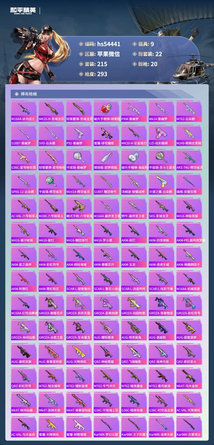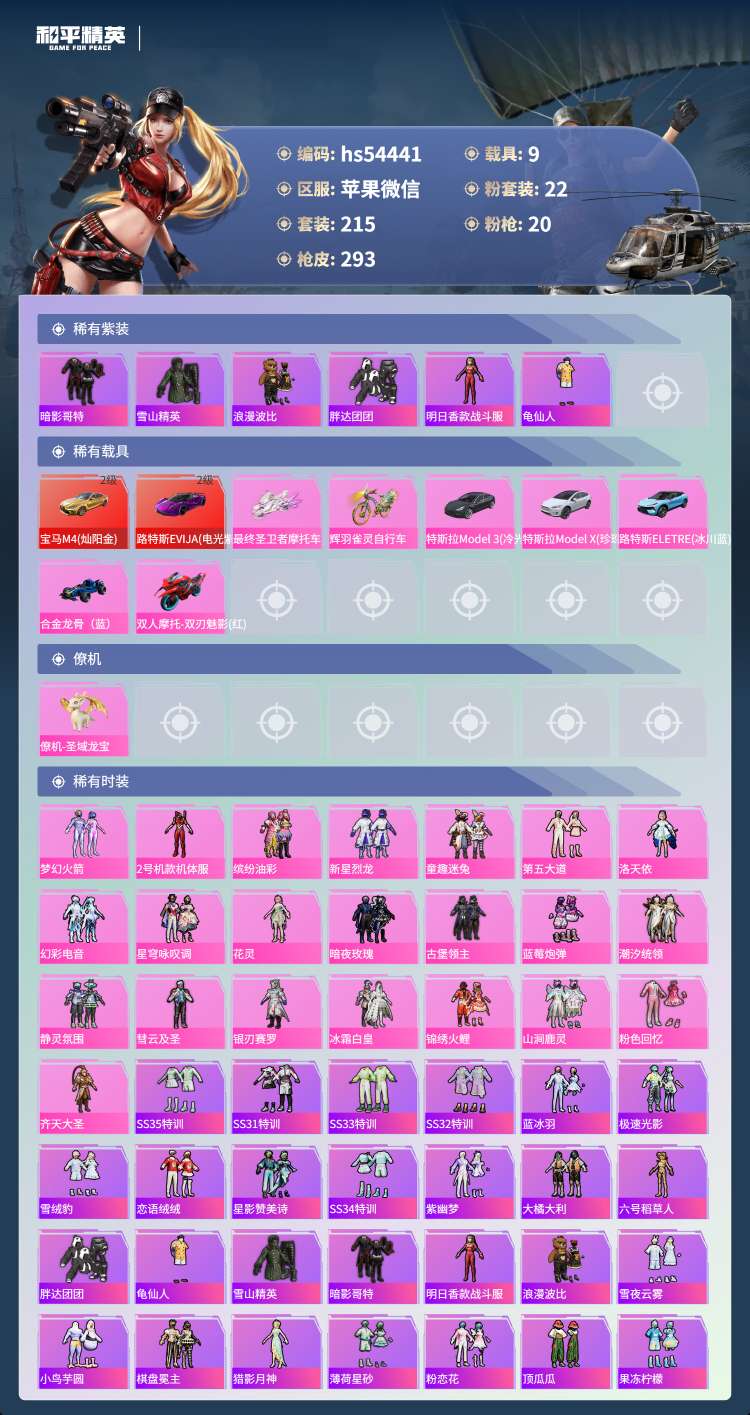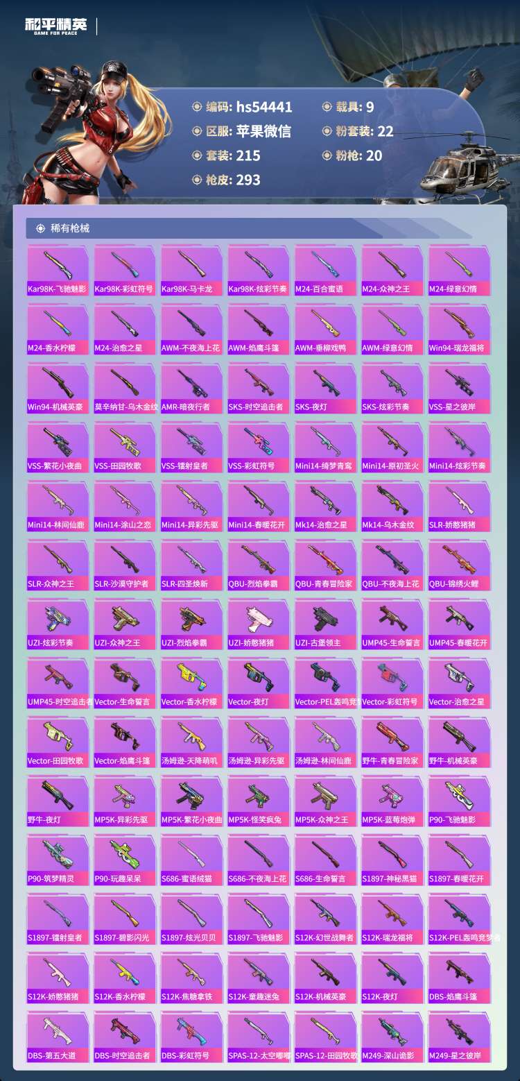hs54441 苹果微-22王牌印记-有战神框-22粉装-20特效枪-9载具-139701热力值-