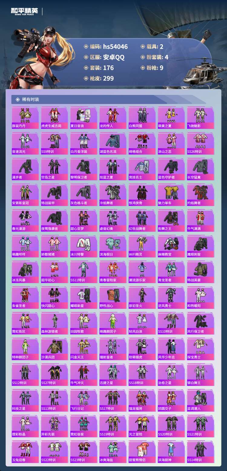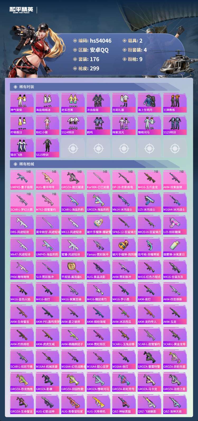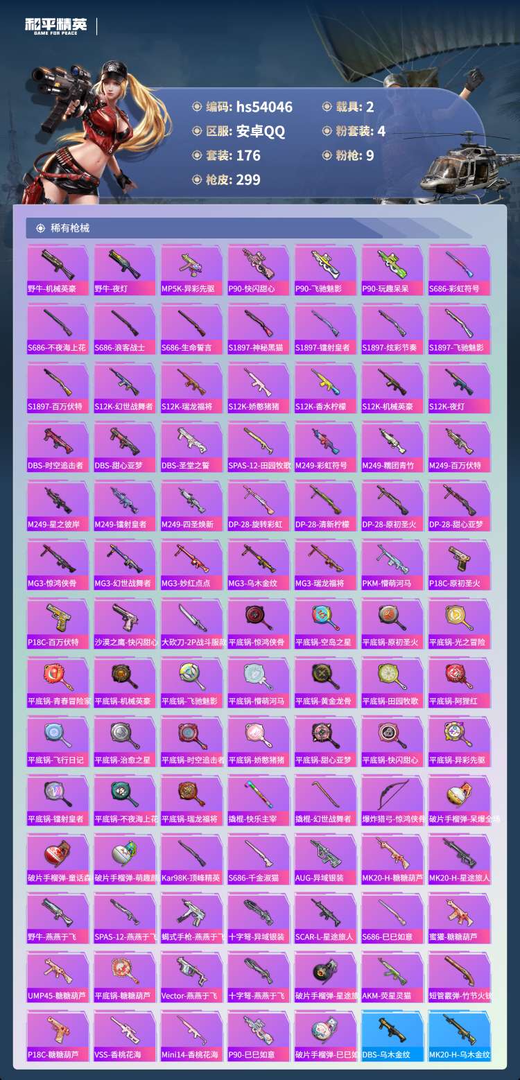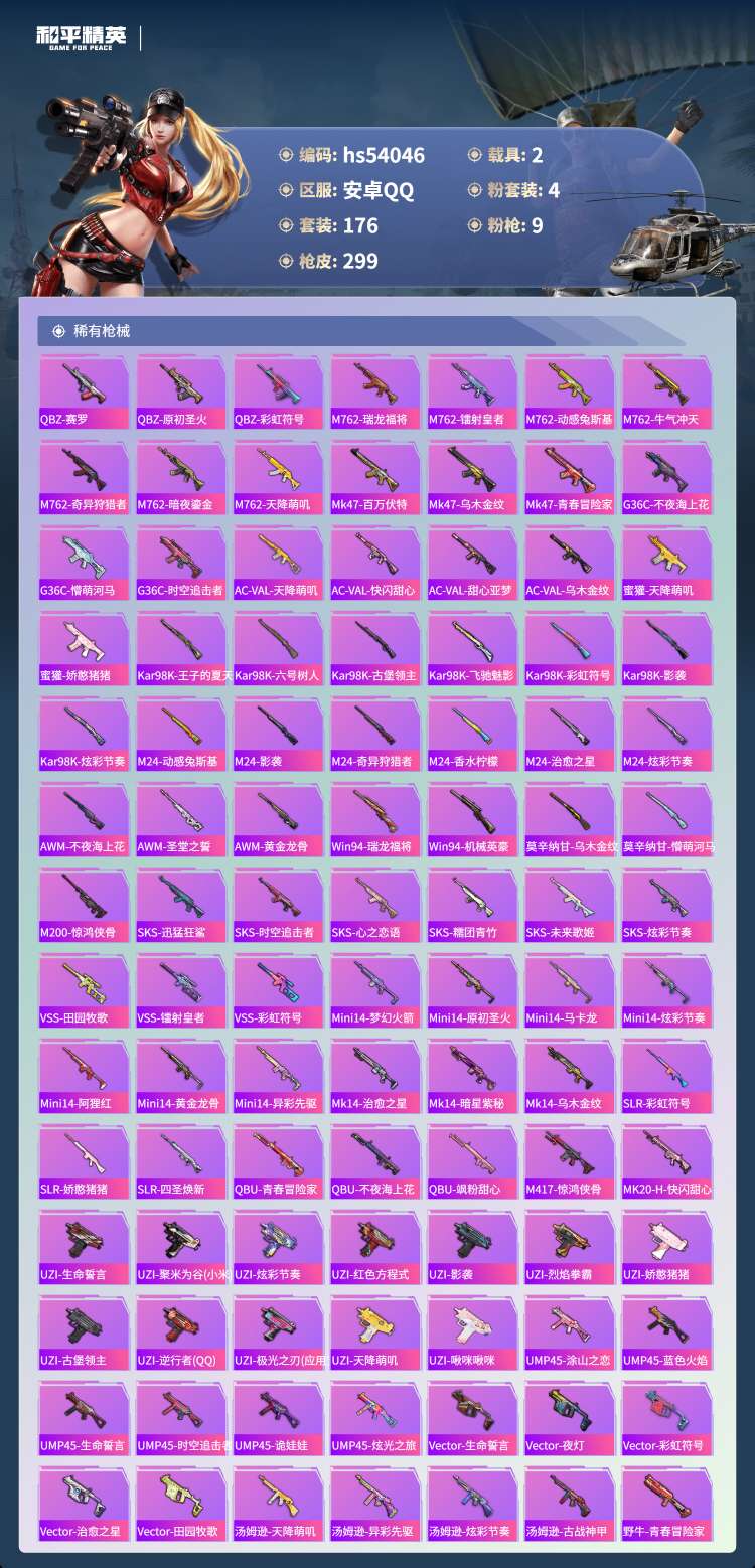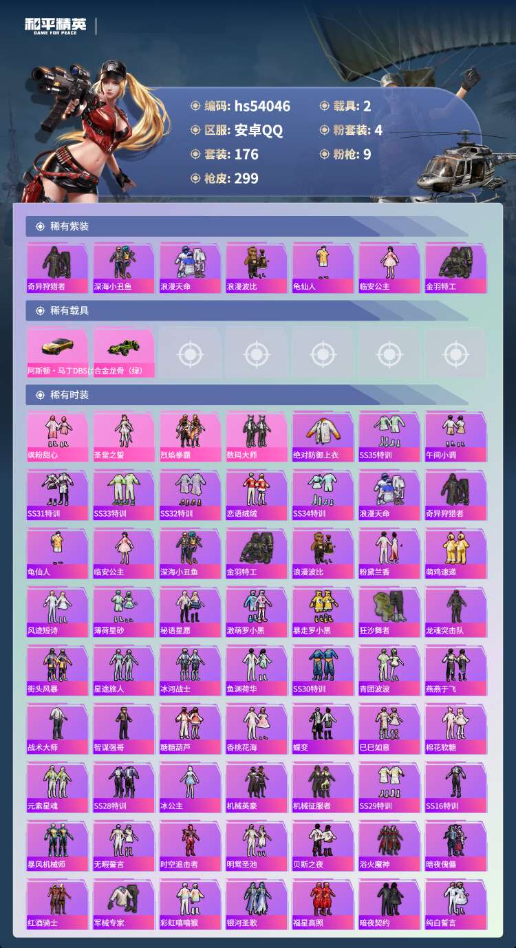 hs54046 安卓手Q-24王牌印记-4粉装-9特效枪-2载具-89962热力值-176套装-29