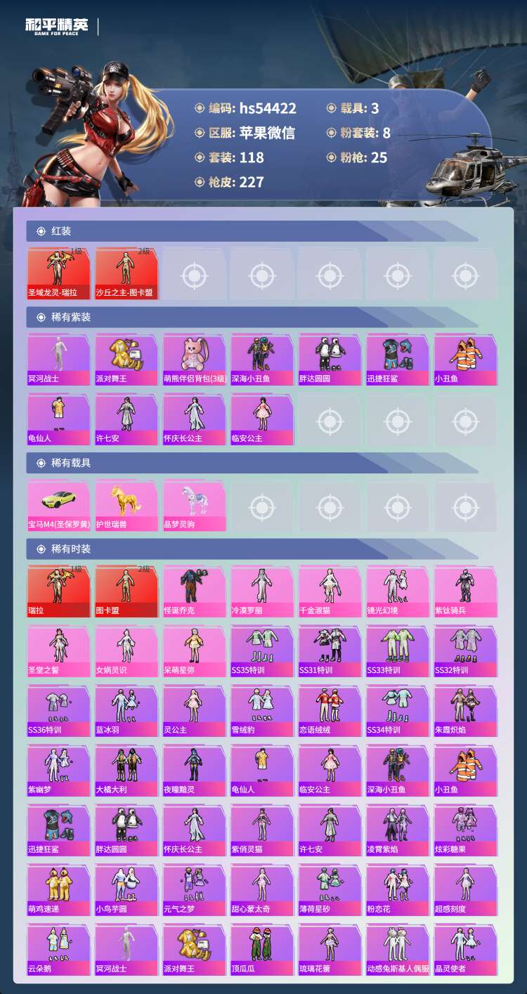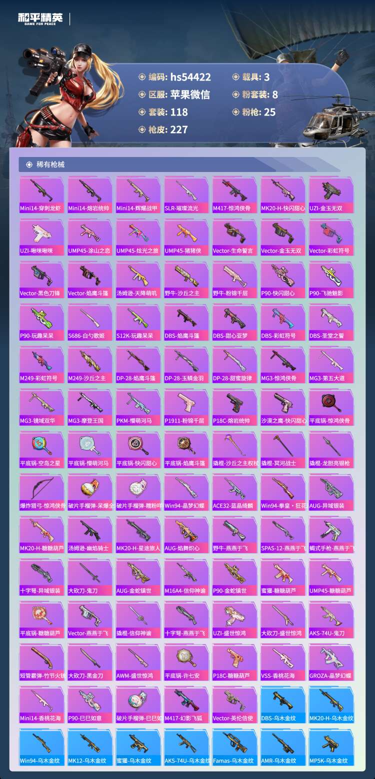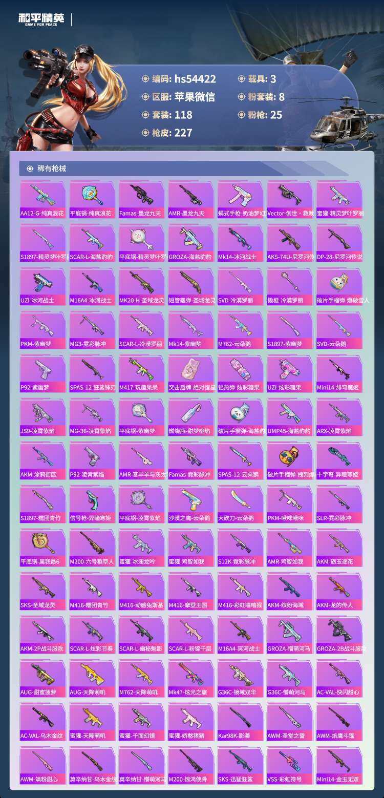 hs54422 苹果微-14王牌印记-有战神框-2红装-8粉装-25特效枪-3载具-79791热力