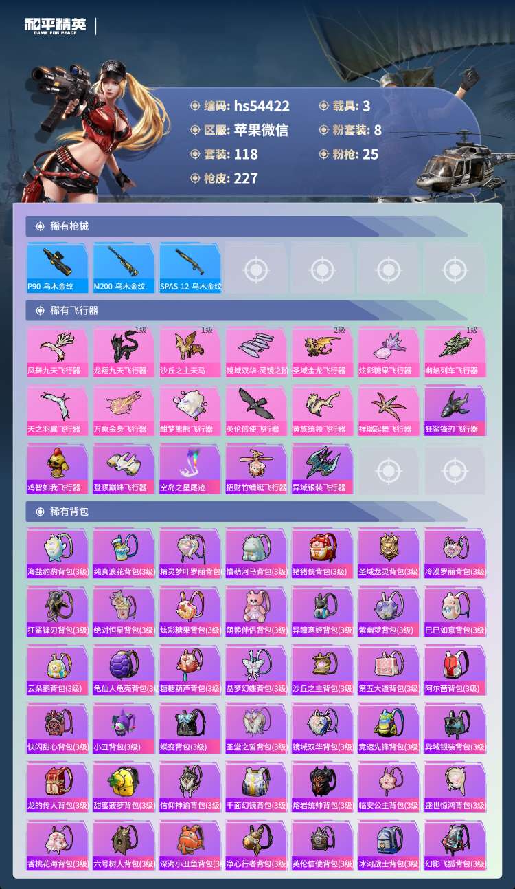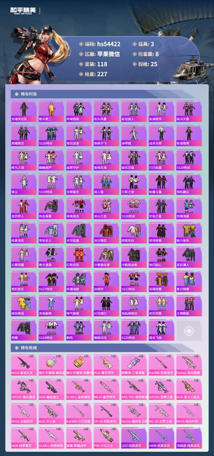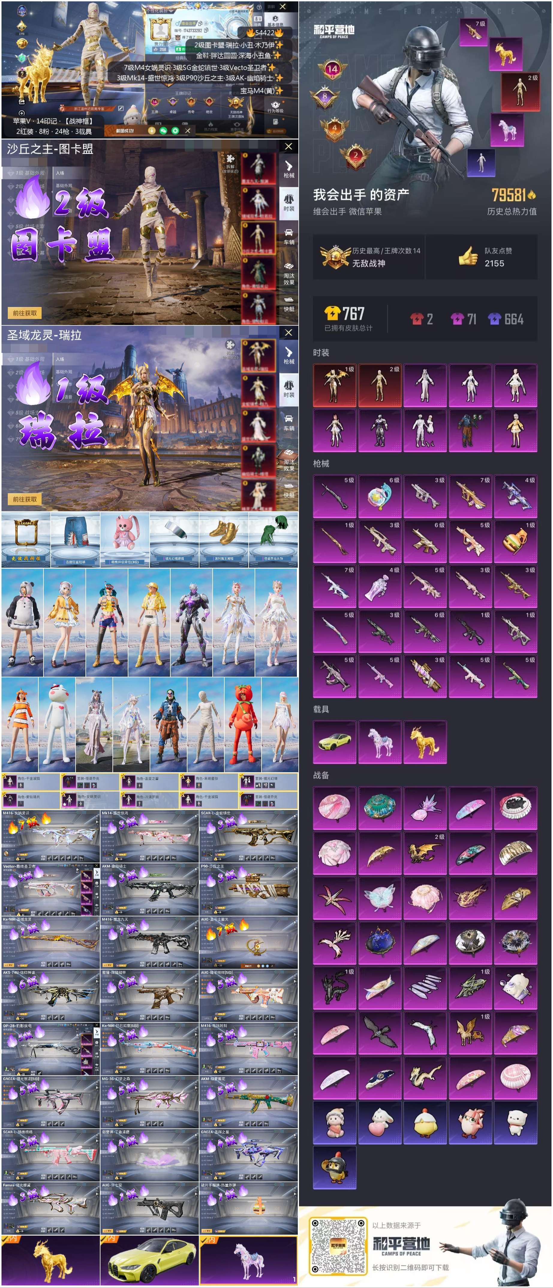 hs54422 苹果微-14王牌印记-有战神框-2红装-8粉装-25特效枪-3载具-79791热力