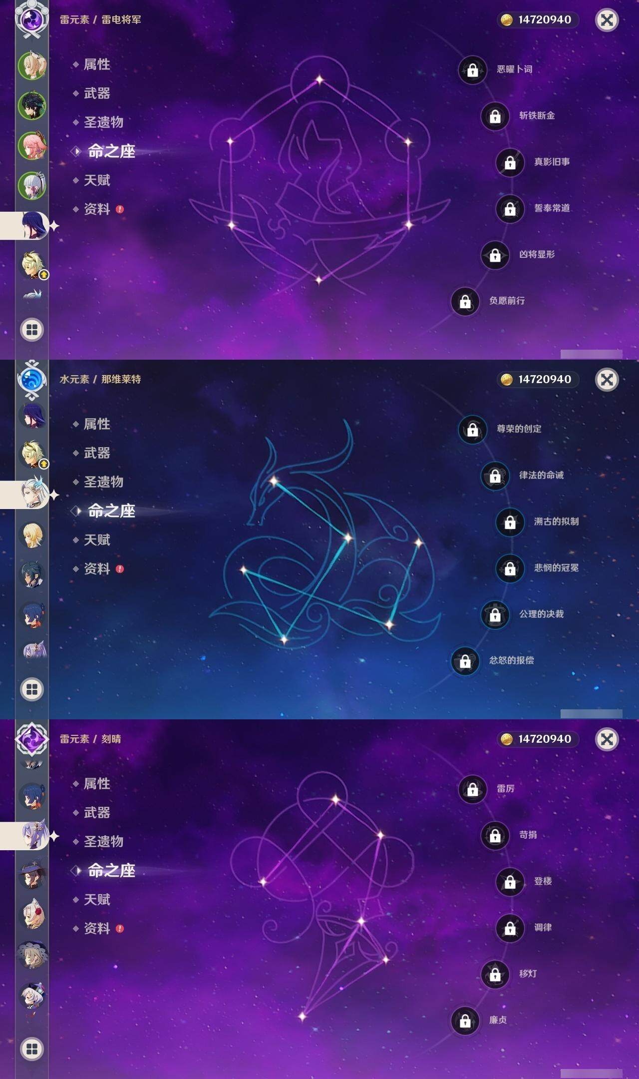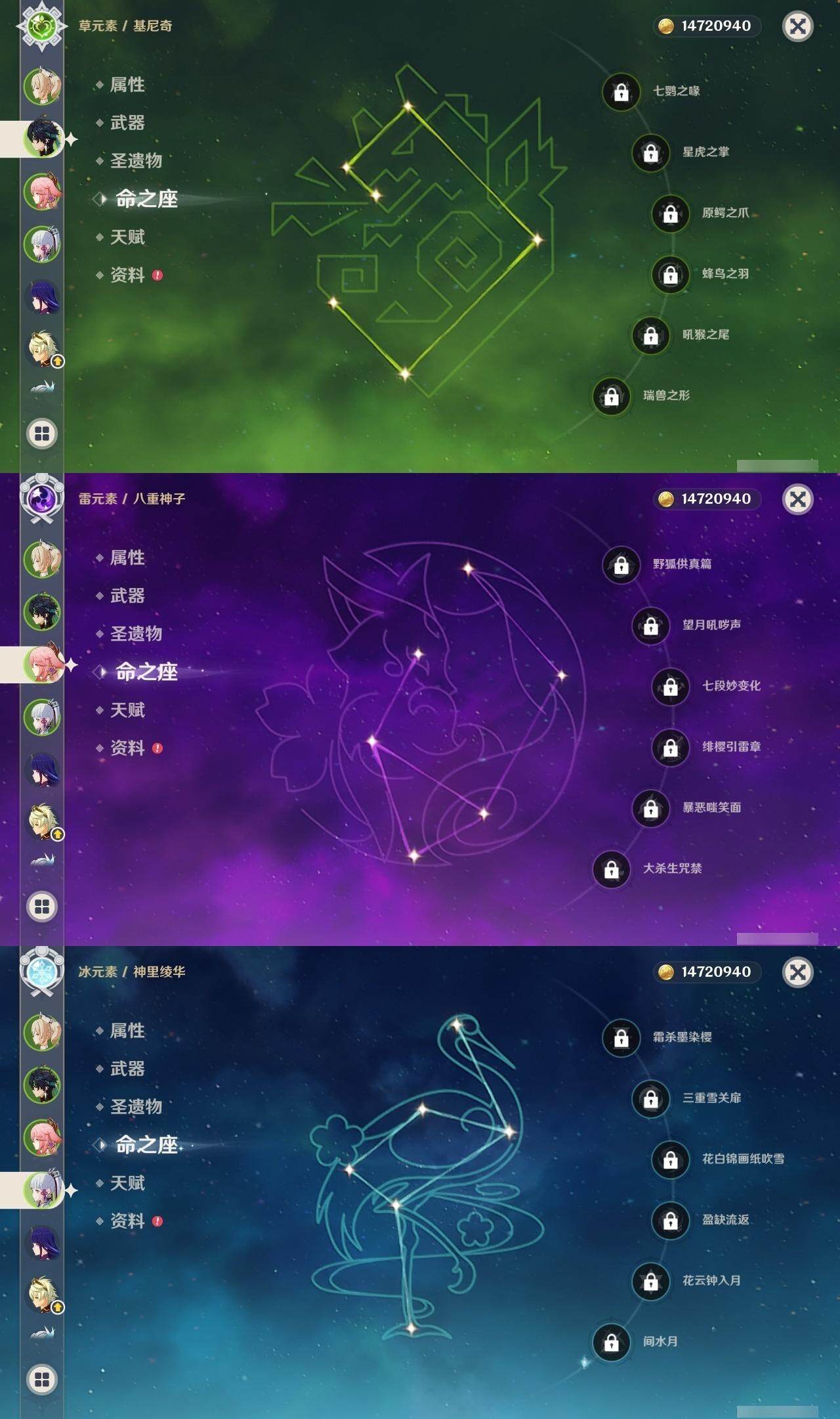 0命那维莱特,0命提纳里,0命八重神子,0命雷电将军,0命神里绫华,0命钟离,0命刻晴,1命七七,0命莫娜,0命基尼奇,0命玛拉妮,0命恰斯卡,精1和璞鸢,精1阿莫斯之弓