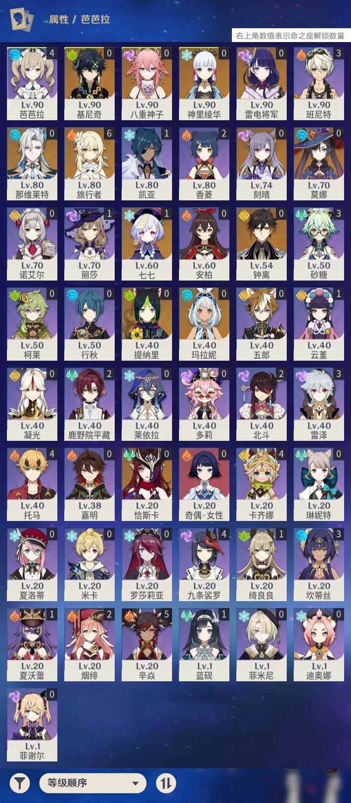 50级/15黄/女主/12个五星角色/2个五星武器0命那维莱特,0命提纳里,