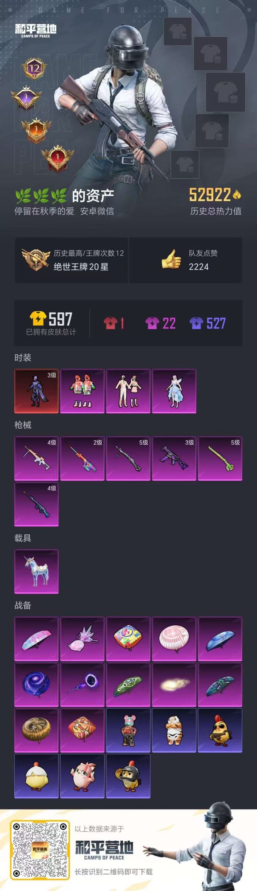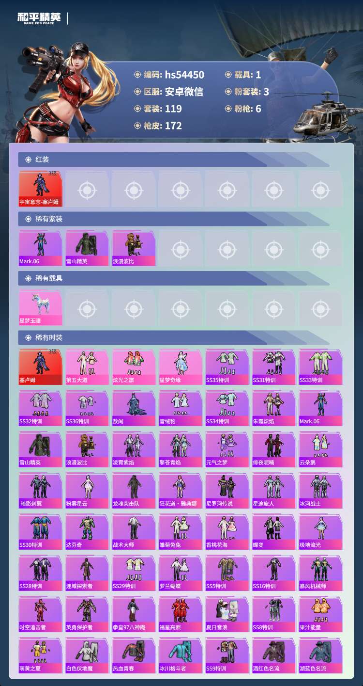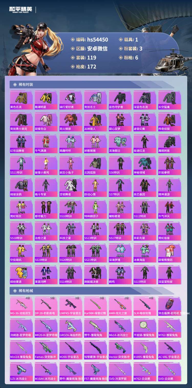 hs54450 安卓微-12王牌印记-1红装-3粉装-6特效枪-1载具-53480热力值-119套
