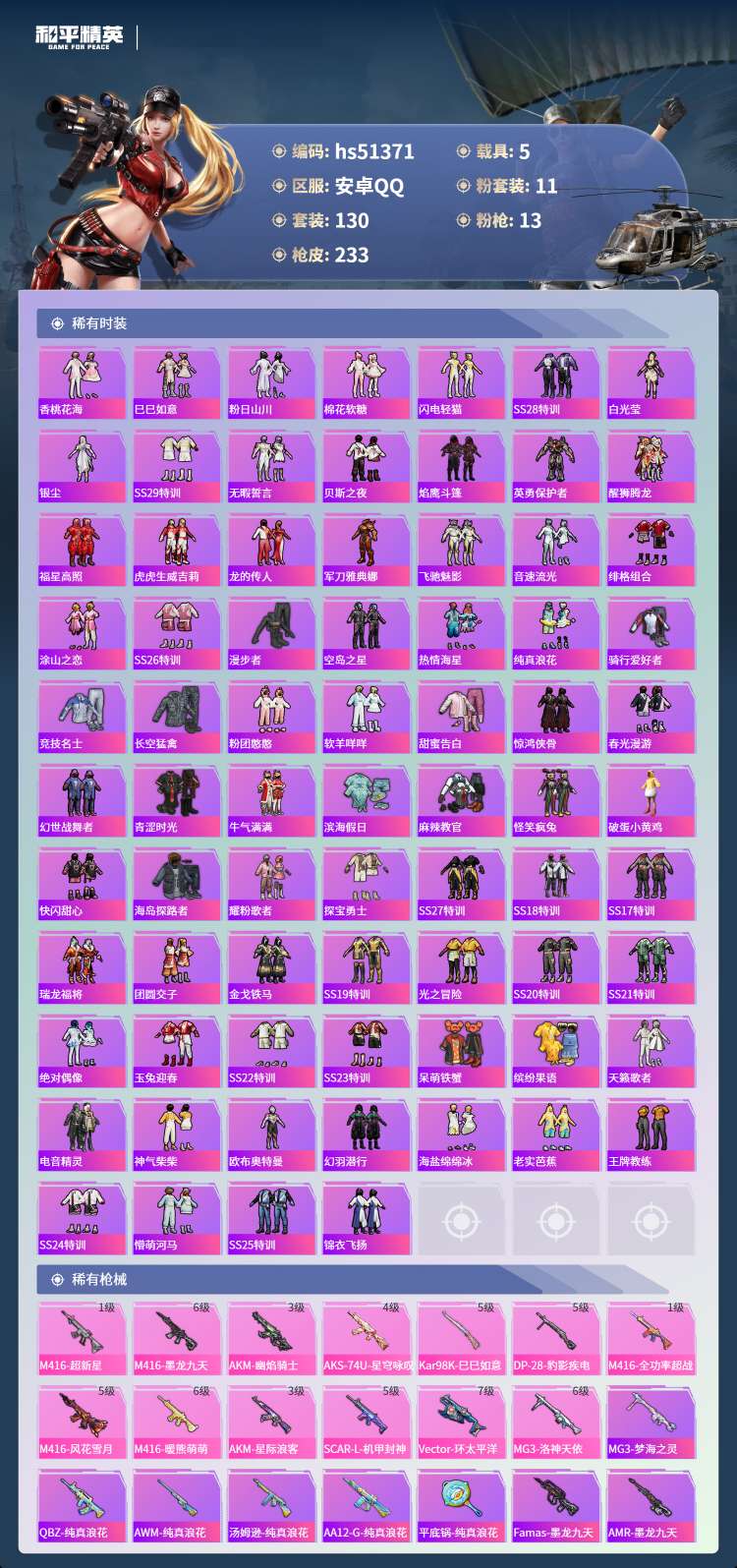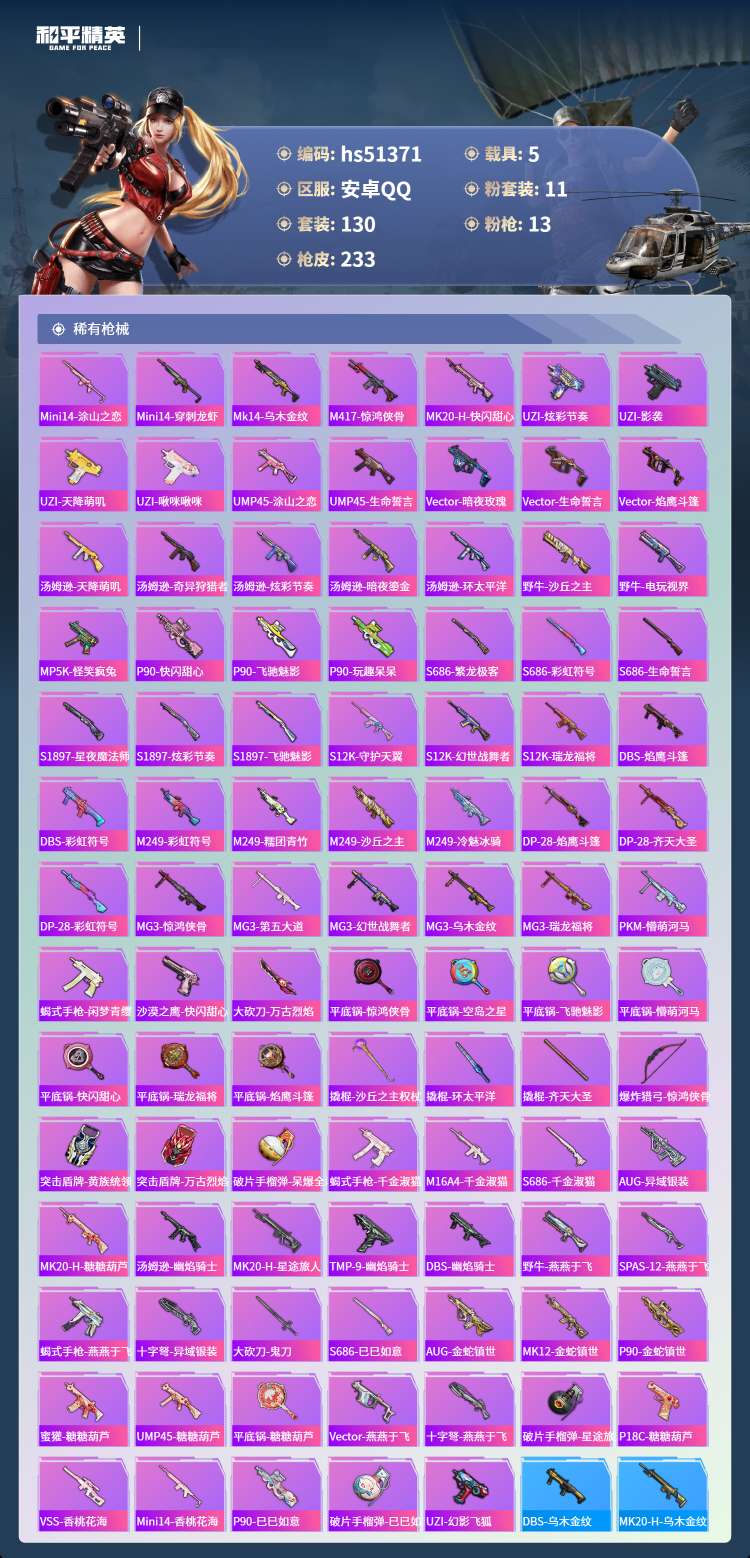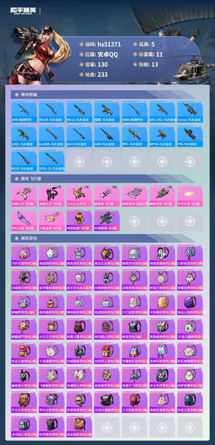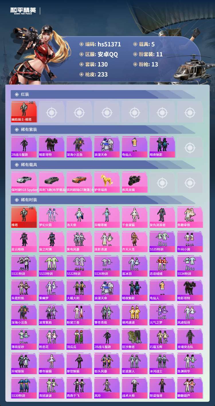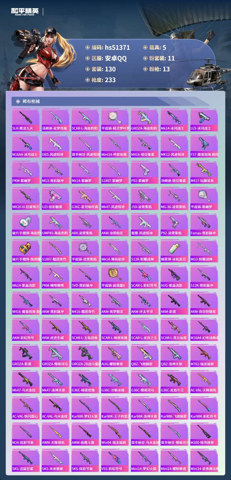 hs51371 安卓手Q-7王牌印记-1红装-11粉装-13特效枪-5载具-83231热力值-130