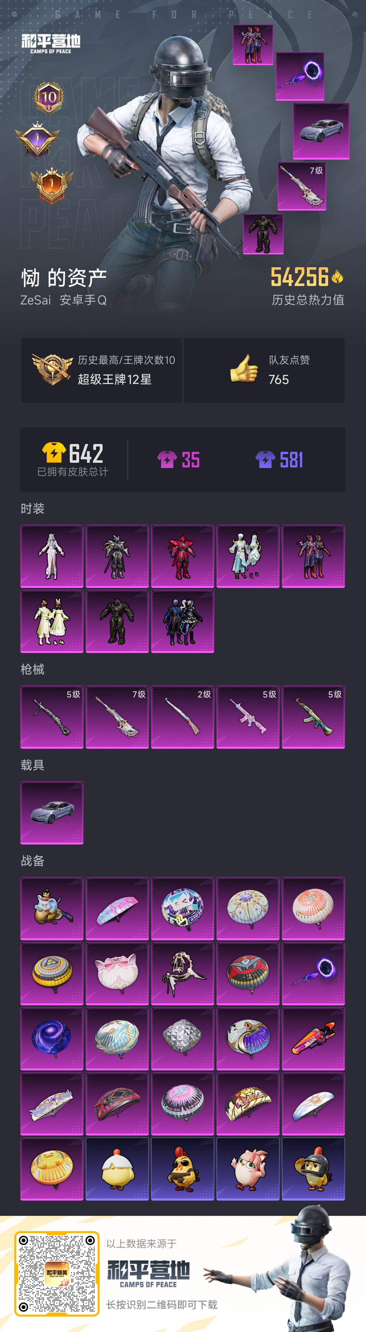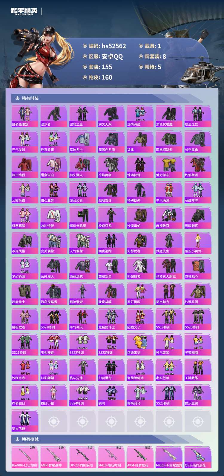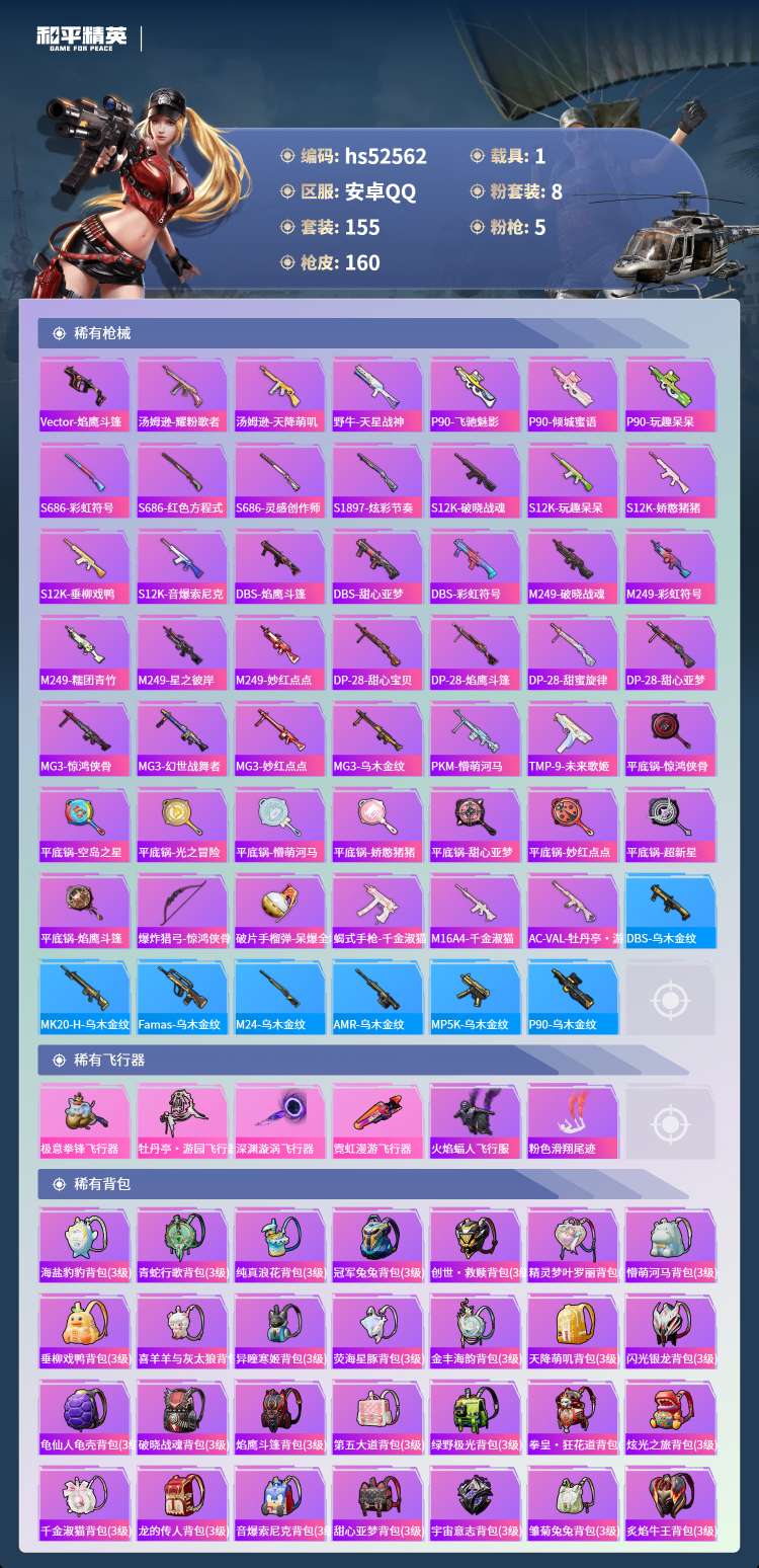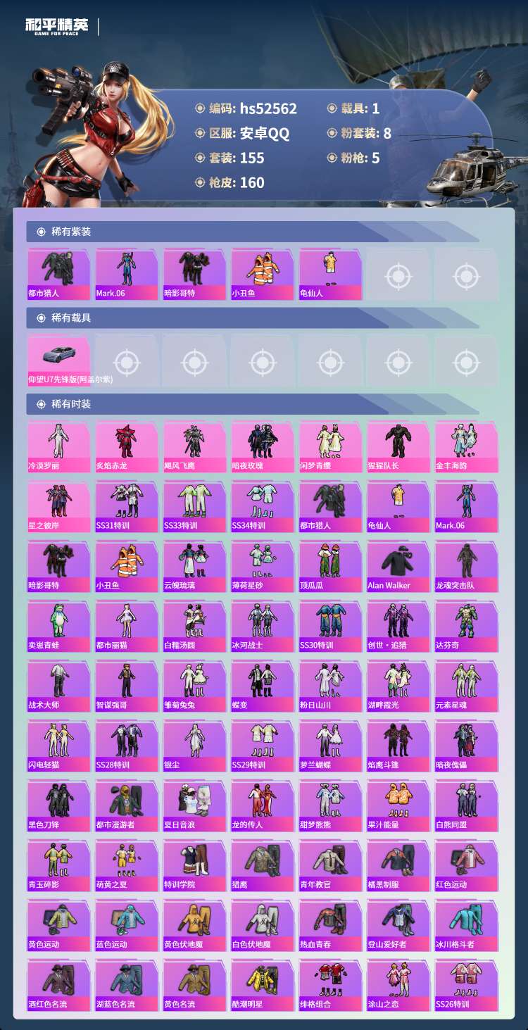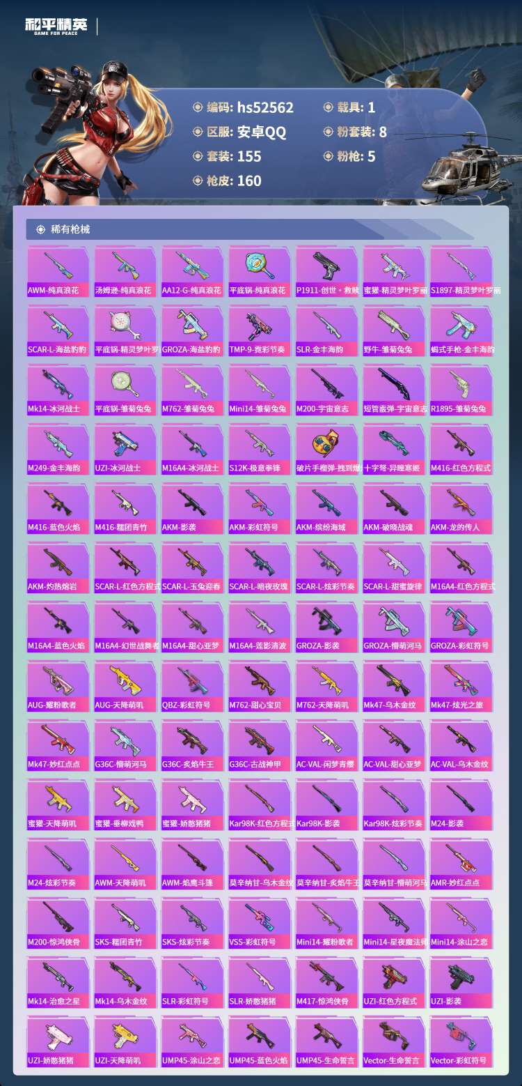 hs52562 安卓手Q-10王牌印记-8粉装-5特效枪-1载具-54256热力值-155套装-16