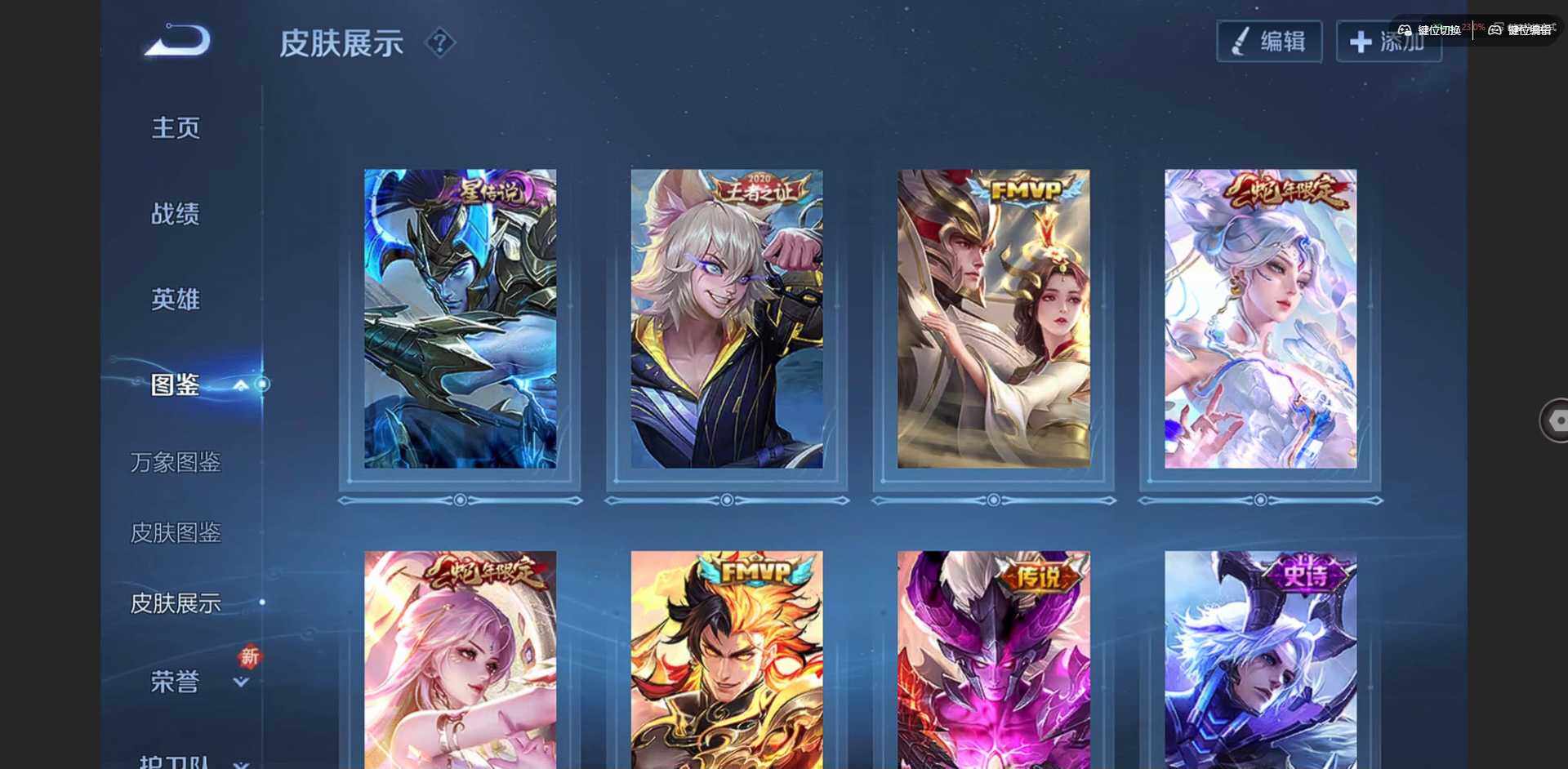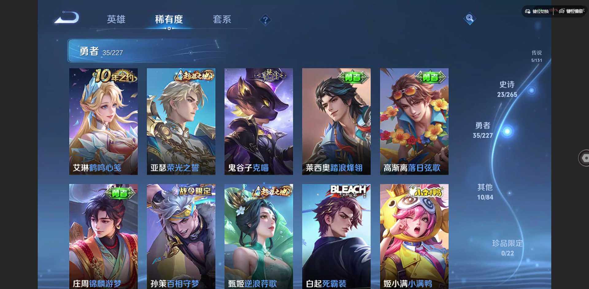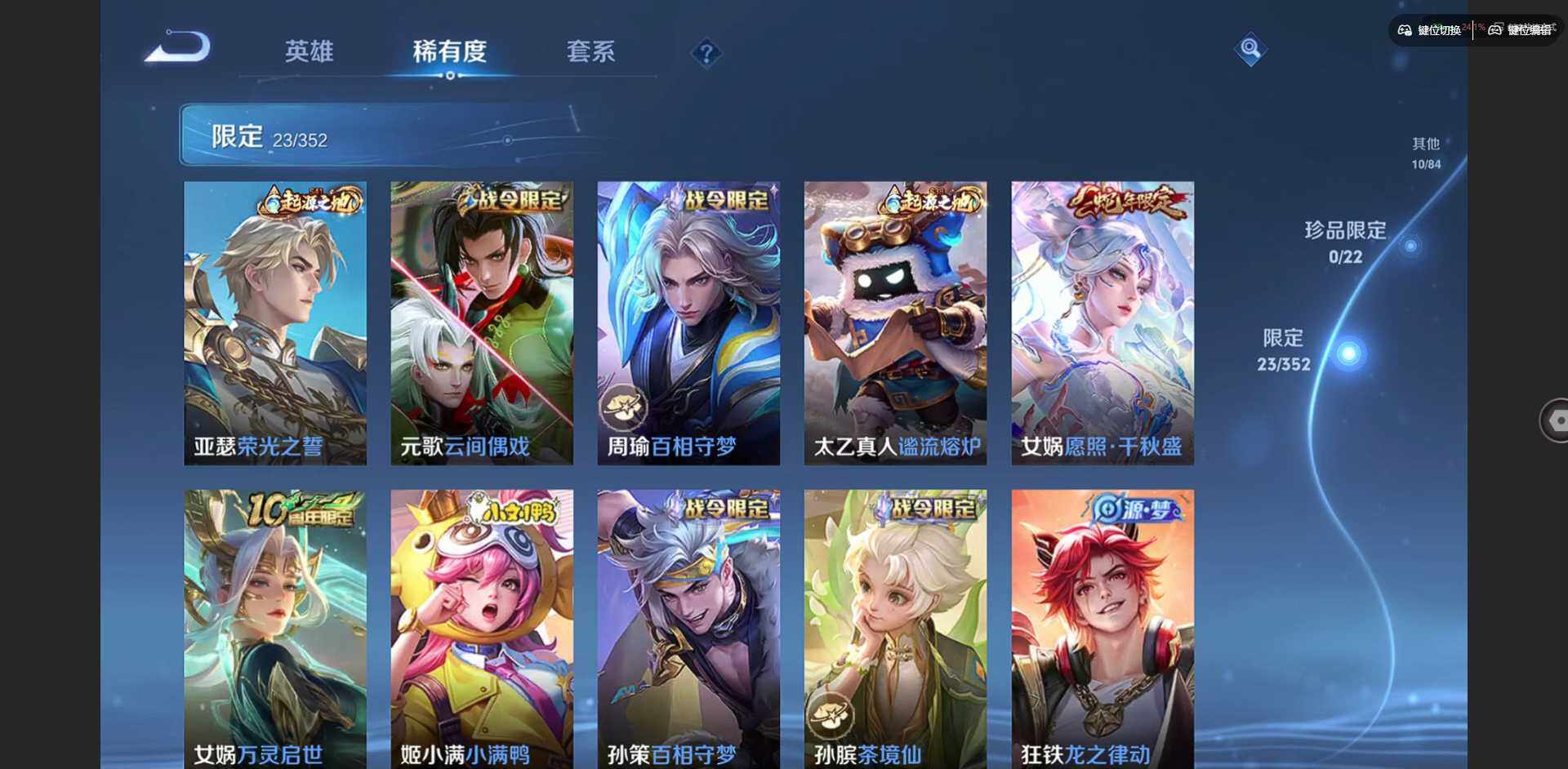 贵族等级: V5 英雄数: 98 皮肤数: 73 星传说: 幽冥之眼 传说皮: 久胜战神,地狱之眼,祥瑞亨通 限定皮: 愿照·千秋盛,愿照·岁时盈