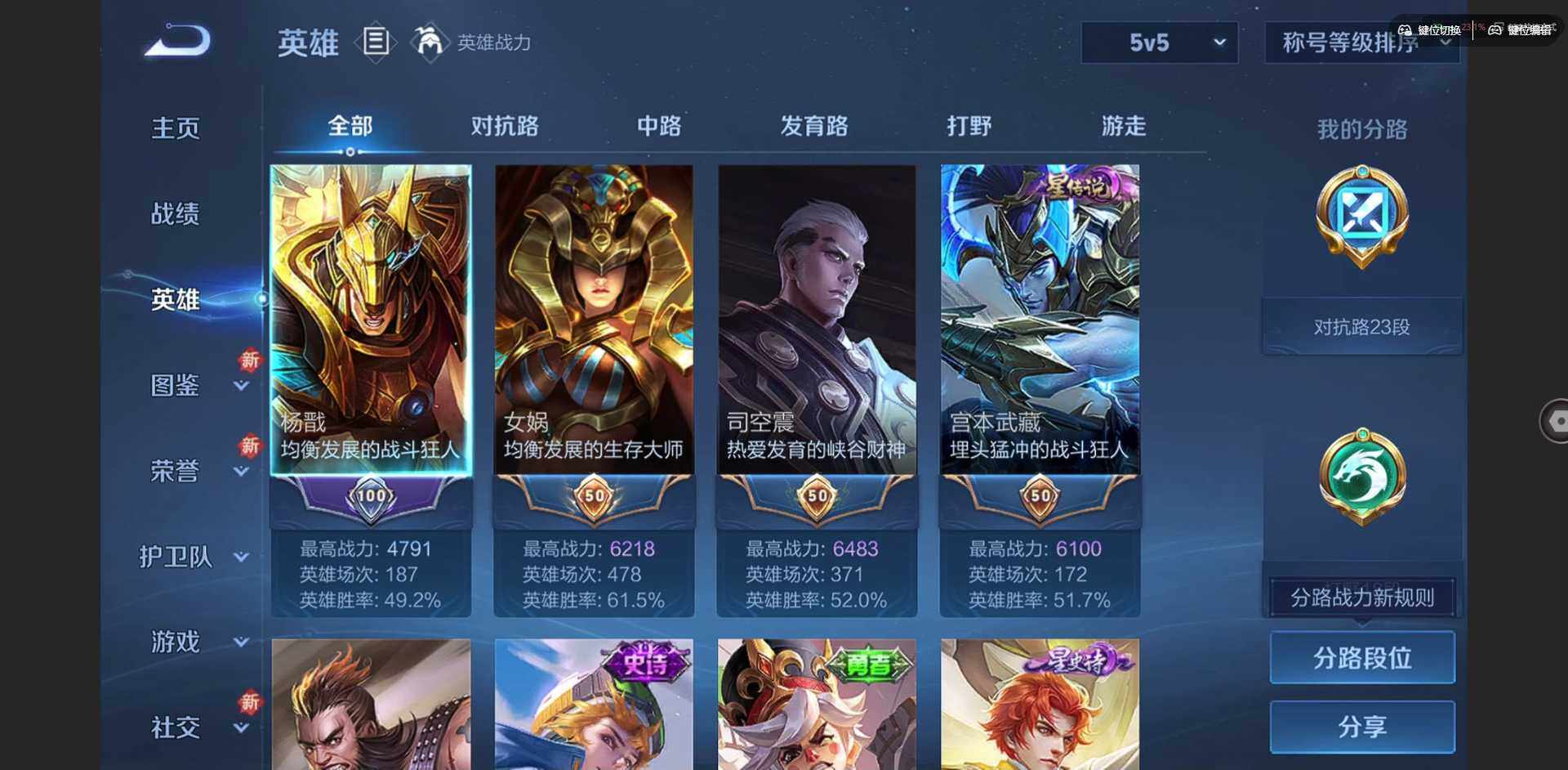 贵族等级: V5 英雄数: 98 皮肤数: 73 星传说: 幽冥之眼 传说皮: