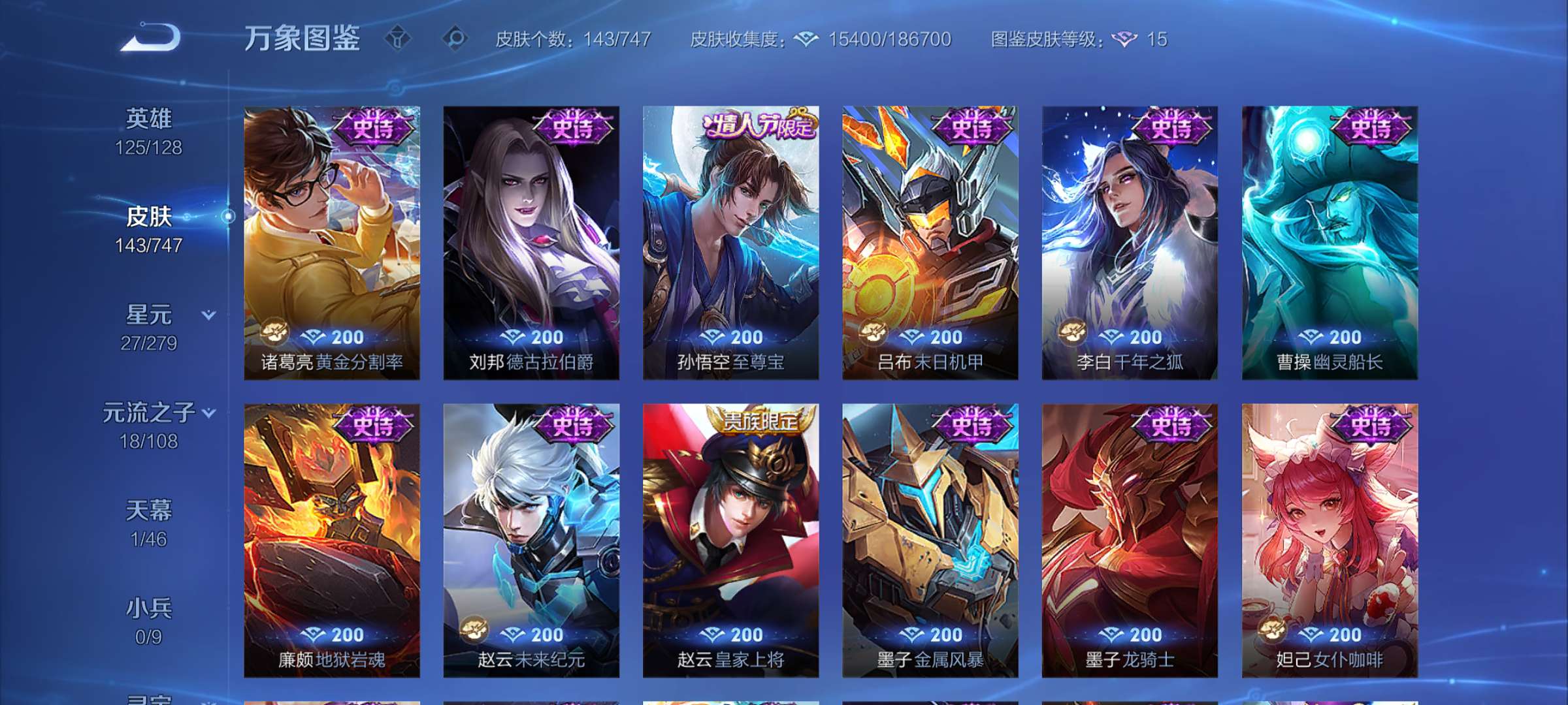 安卓QQ-1传说-143皮肤-125英雄-无双王者-有至尊宝飞衡岱宗荣耀积分已经250了
