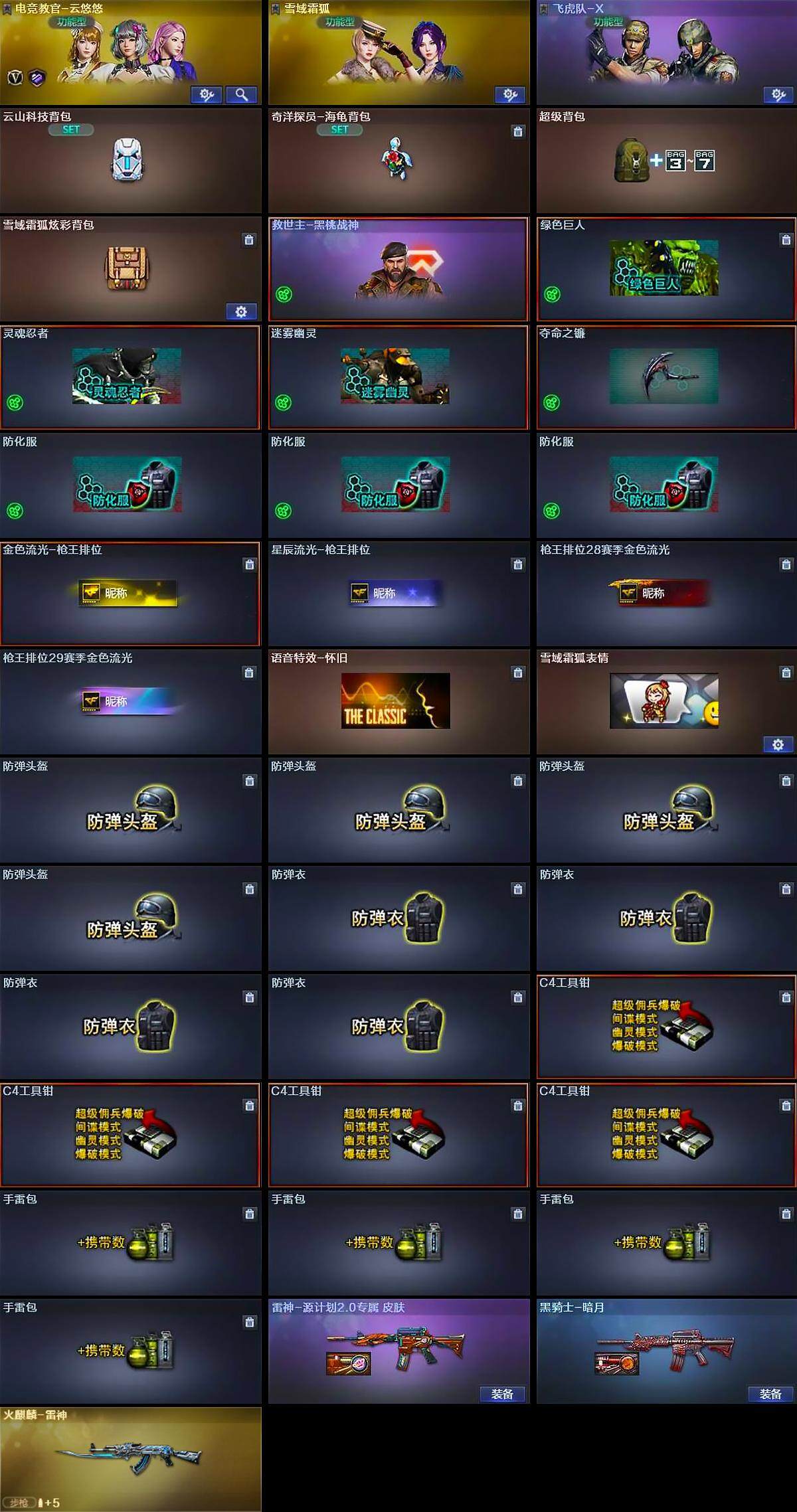【道具】:云山科技背包*2,奇洋探员-海龟背包*2,超级背包*2,雪域霜狐炫彩背包*2,救世主-黑桃战神*2,绿色巨人*2,灵魂忍者*2,迷雾幽灵*2,夺命之镰*2,防化服*6,金色流光-枪王排位*2,星辰流光-枪王排位*2,枪王排位28赛季金色流光*2,枪王排位29赛季金色流光*2,语音特效-怀旧*2,雪域霜狐表情*2,防弹头盔*8,防弹衣*8,C4工具钳*8,