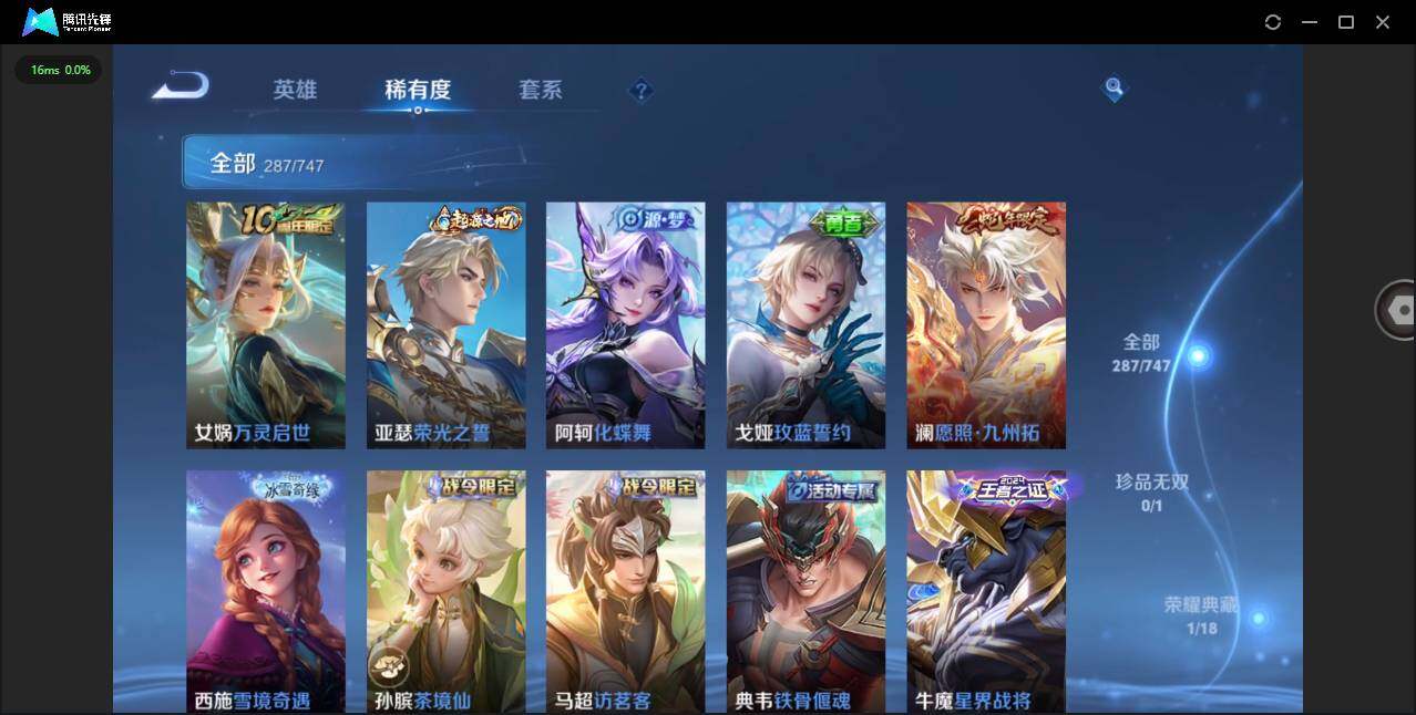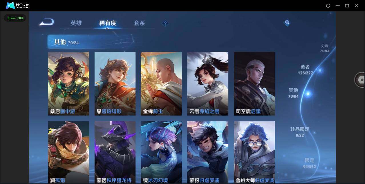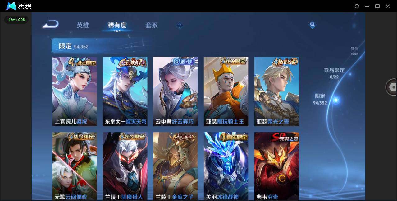 /【金标澜】实名: 可修改 贵族等级: V8 英雄数: 125 皮肤数: 287 荣耀水晶: 鸣剑·曳影 星传说: 未来机甲,幽冥火,玉鸾吟 传说皮: 黄金狮子座,黄金射手座,云鹰飞将,黄金白羊座,云霓雀翎,末日机甲-孙尚香,地狱火,零号·赤焰,电玩·雷克斯,澜逐花归海,乘龙·铭钟鼎 限定皮: 冰锋战神,遇见飞天,李小龙,梁祝,时雨天司,飞衡,冰霜恋舞曲,逐梦之影,凤
