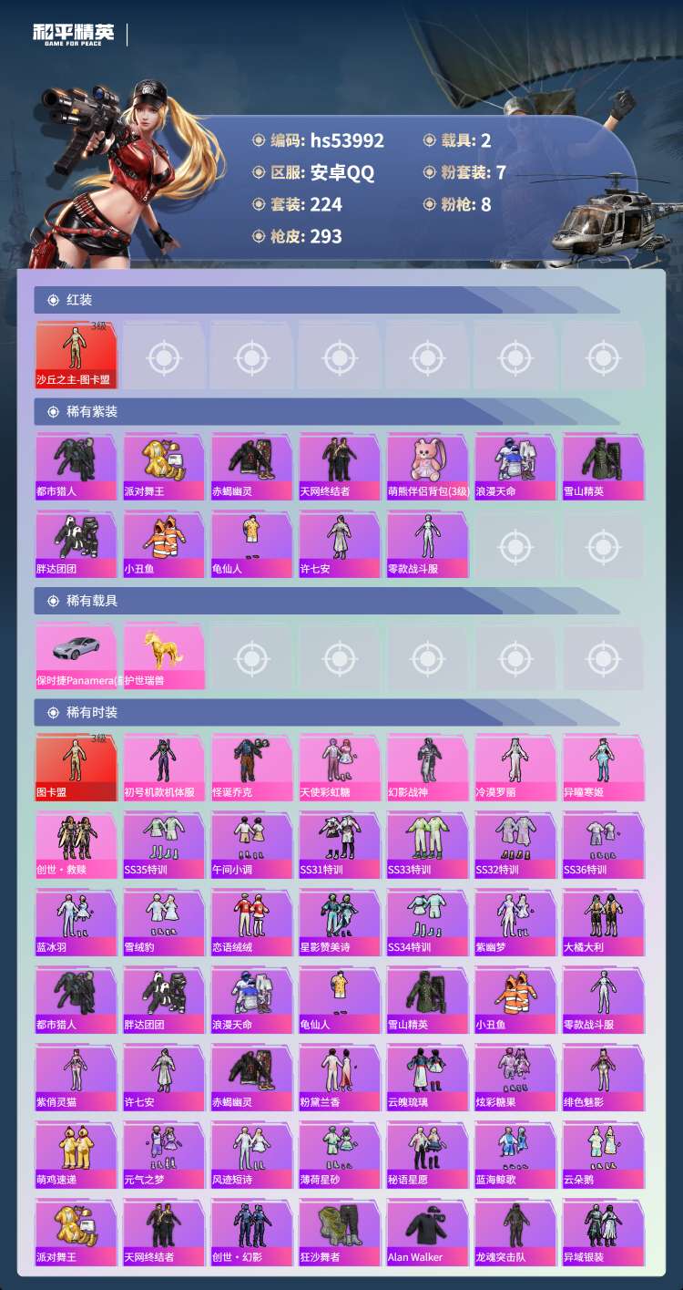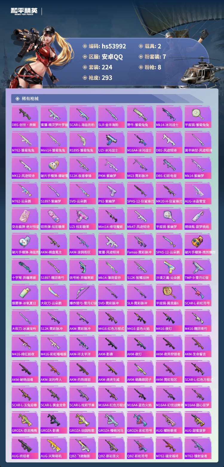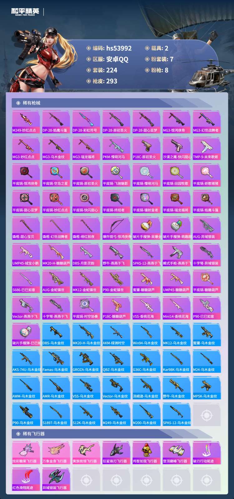 hs53992 安卓手Q-21王牌印记-1红装-7粉装-8特效枪-2载具-95428热力值-224套