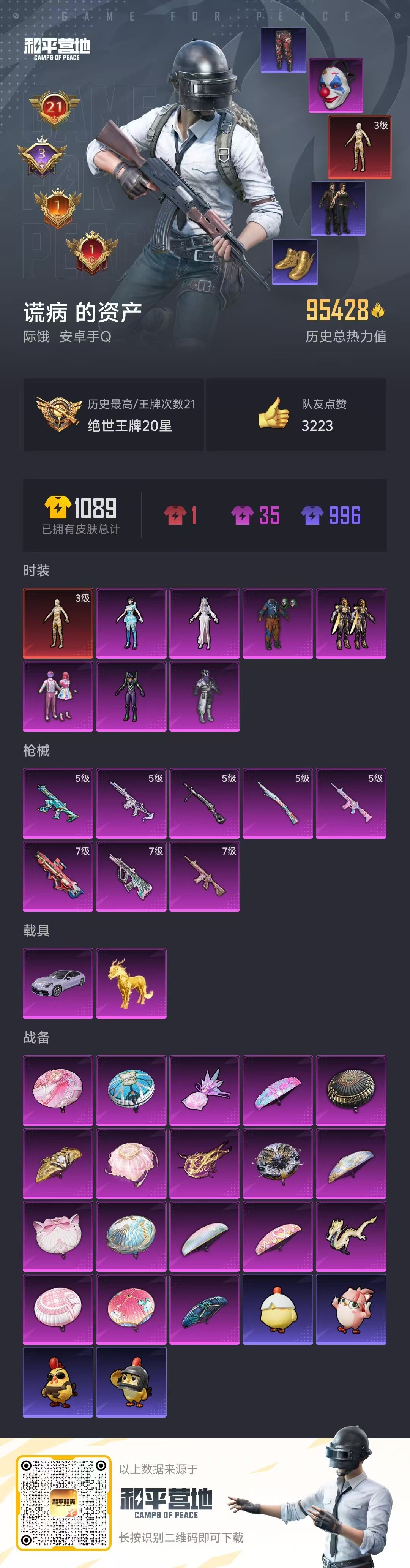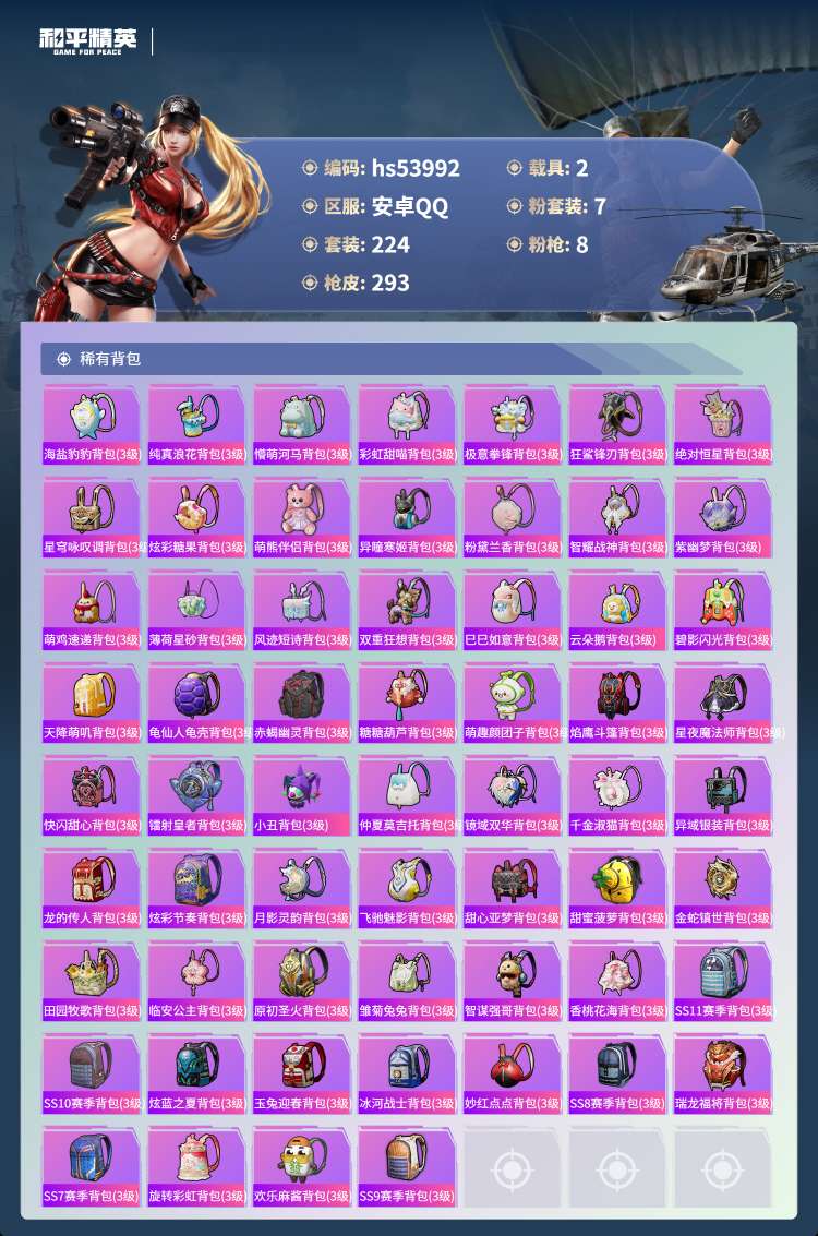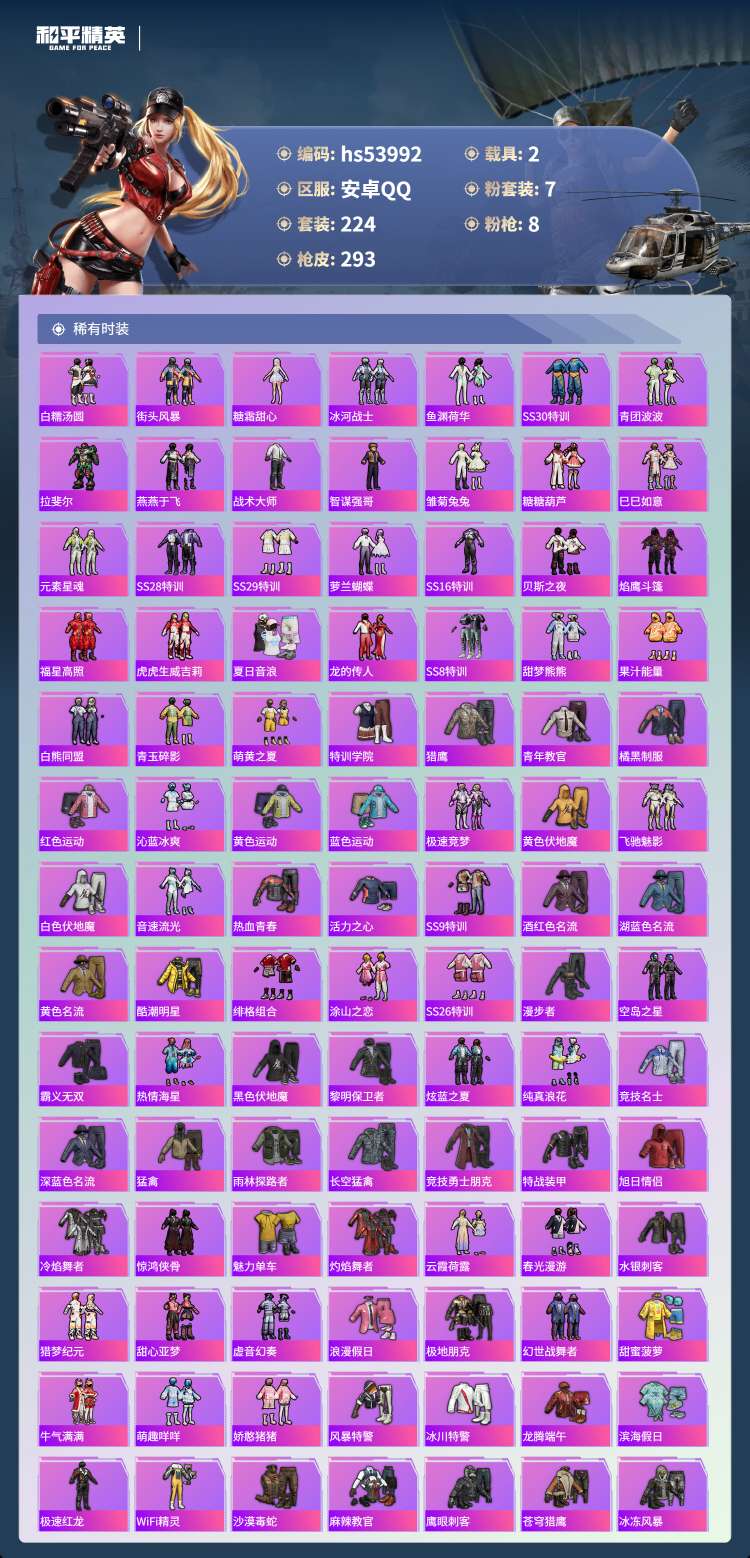 hs53992 安卓手Q-21王牌印记-1红装-7粉装-8特效枪-2载具-95428热力值-224套