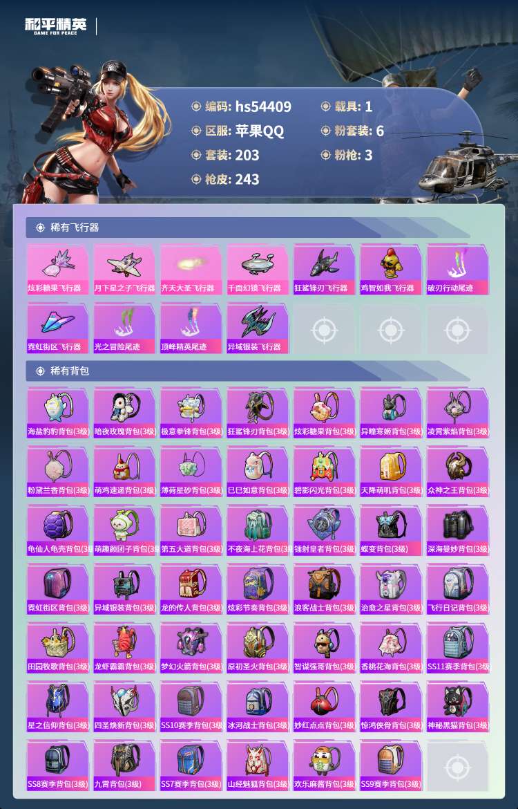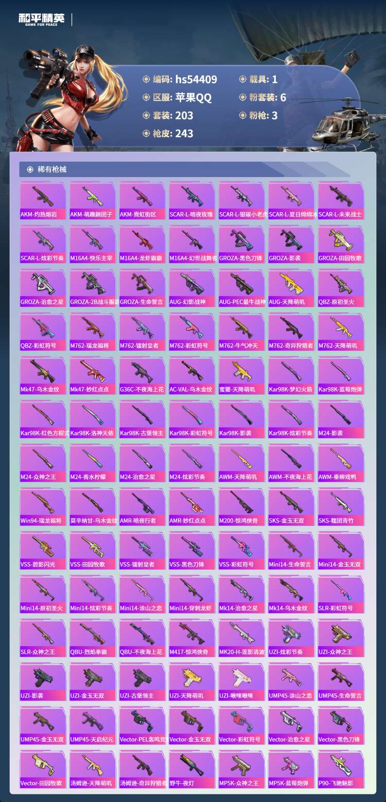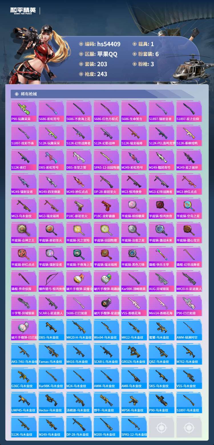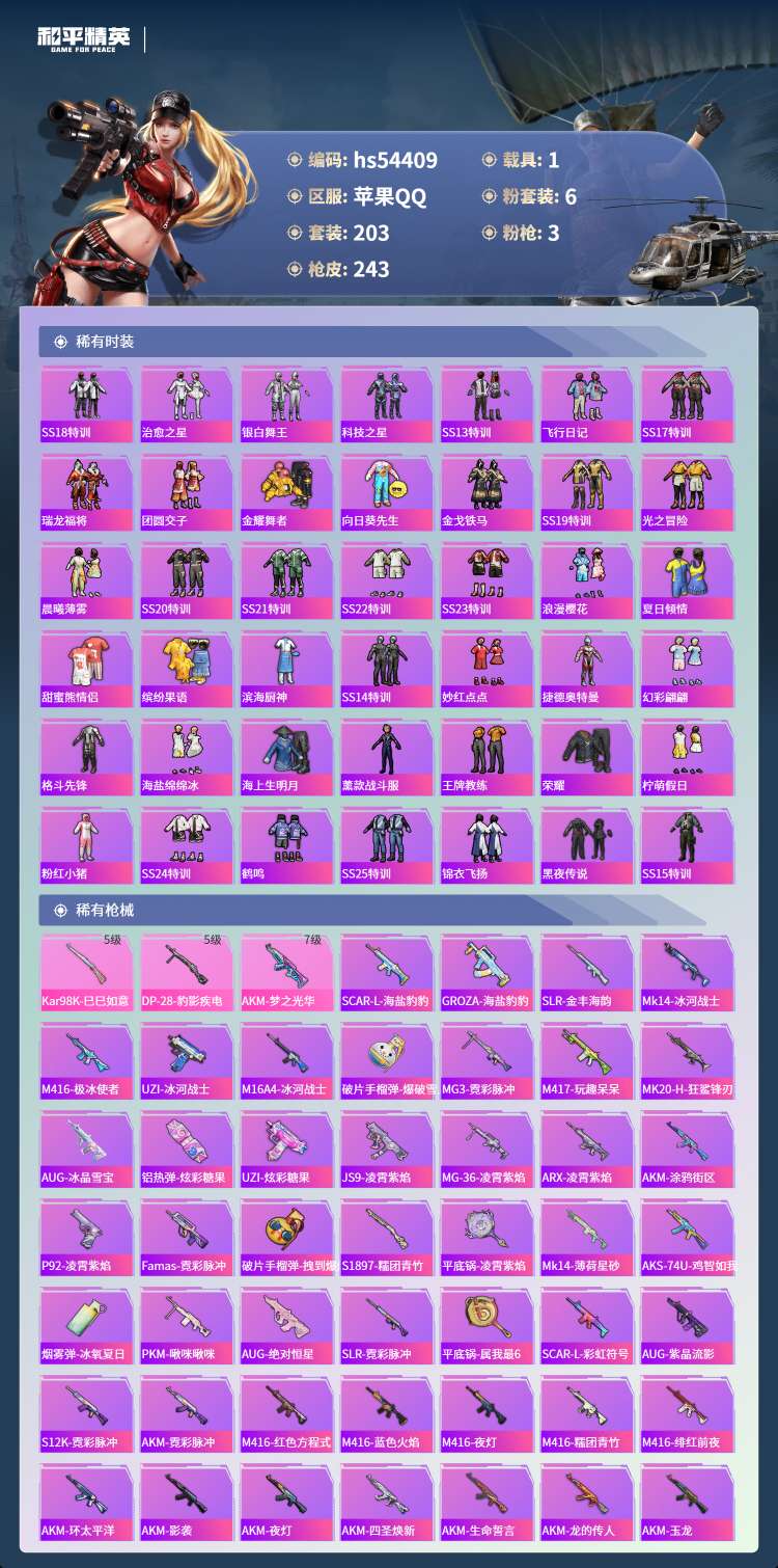 hs54409 苹果手Q-18王牌印记-6粉装-3特效枪-1载具-75459热力值-203套装-24