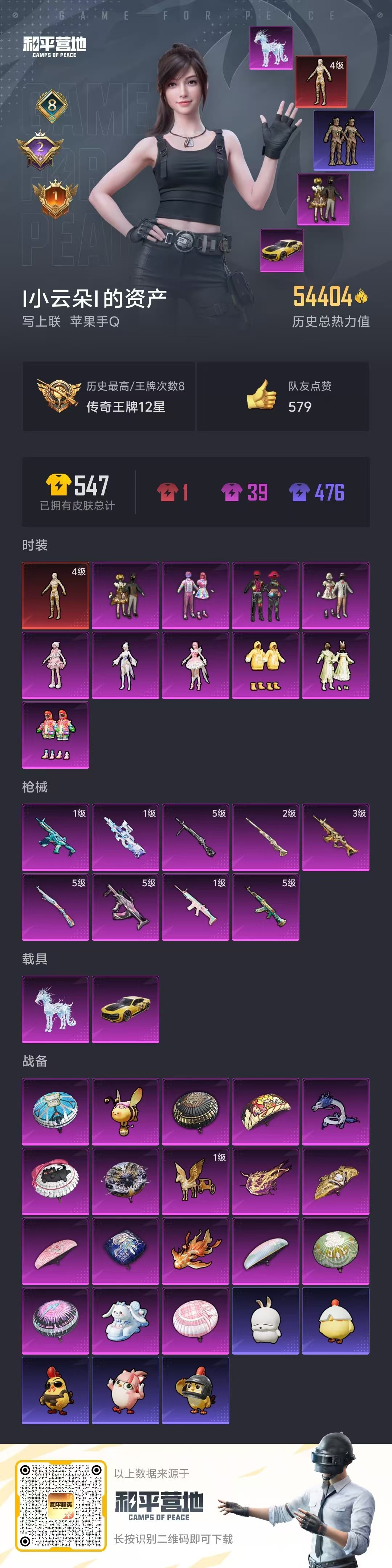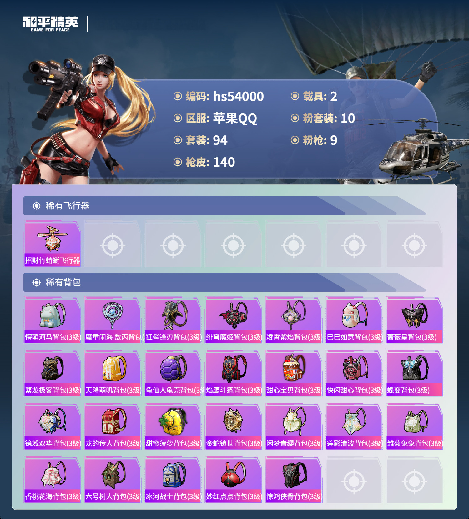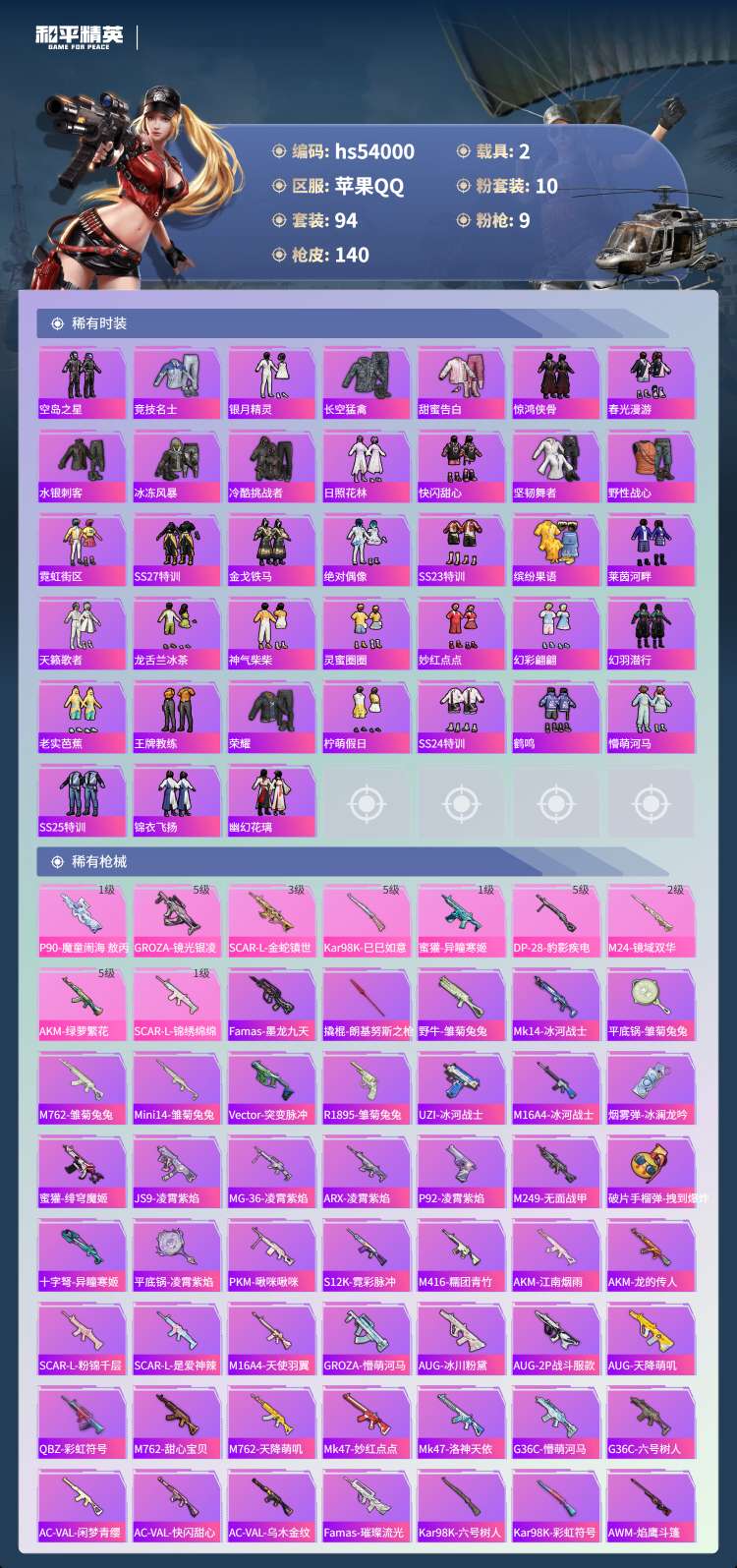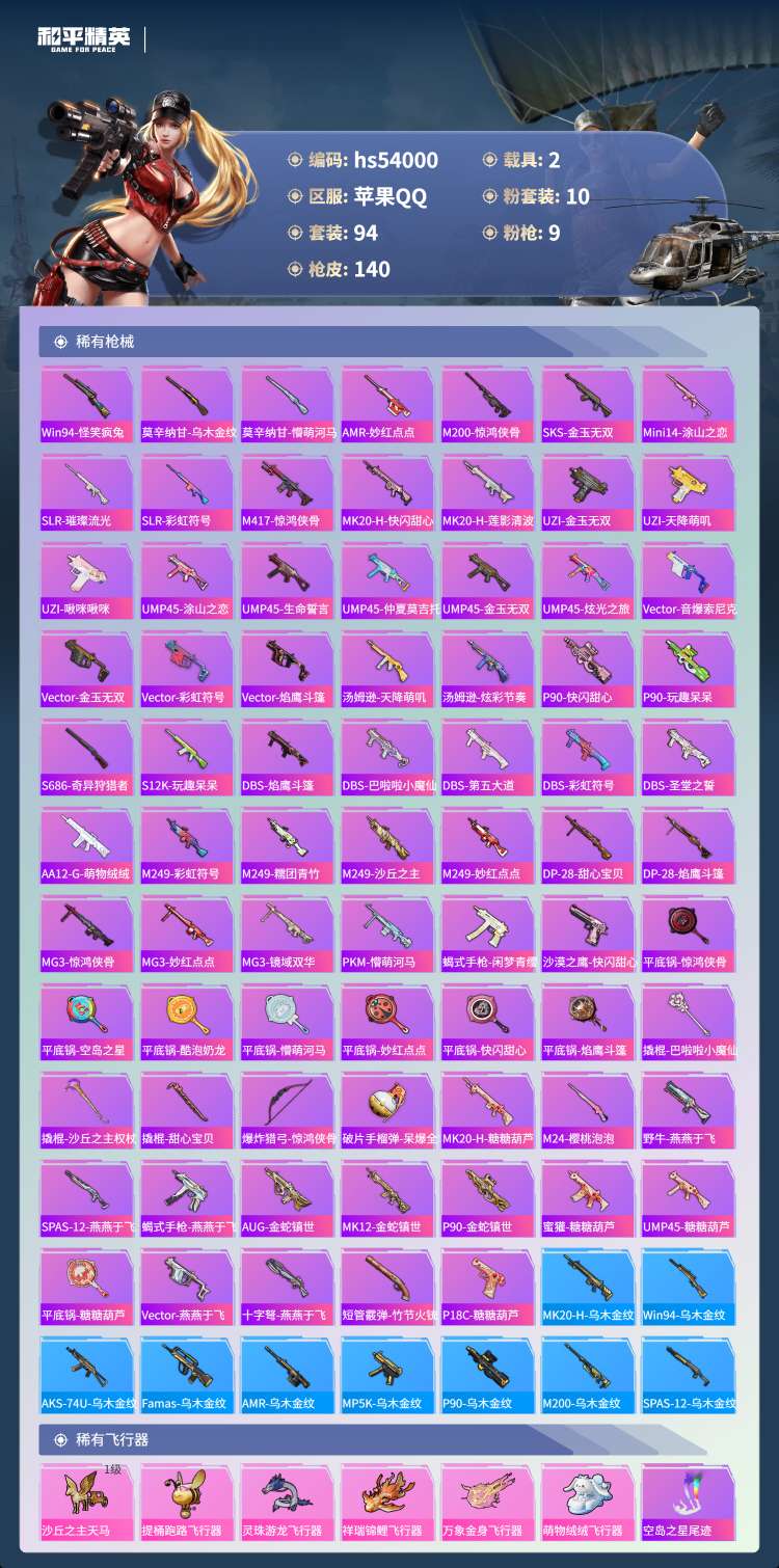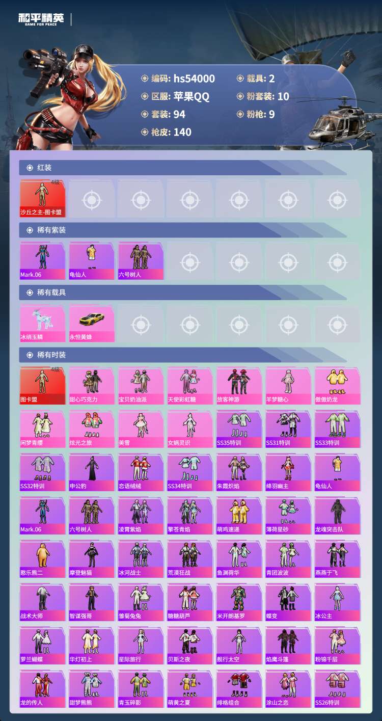 hs54000 苹果手Q-8王牌印记-1红装-10粉装-9特效枪-2载具-热力值-94套装