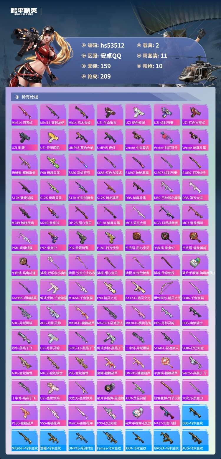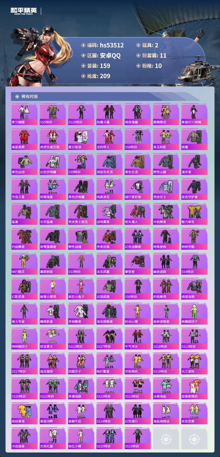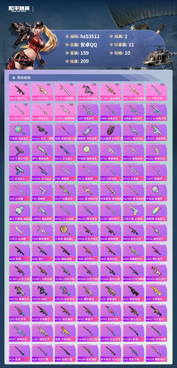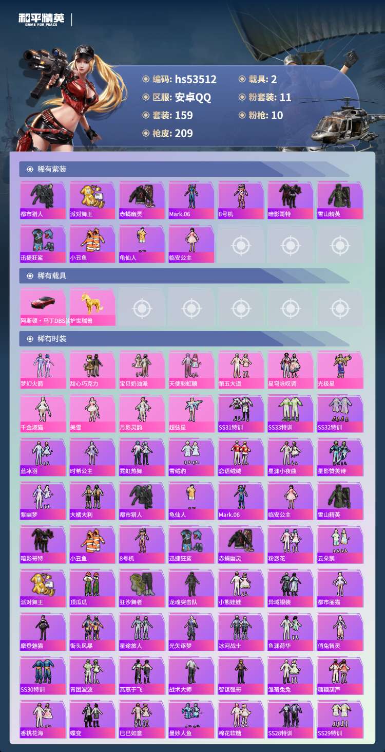 hs53512 安卓手Q-9王牌印记-11粉装-10特效枪-2载具-热力值-159套装-2