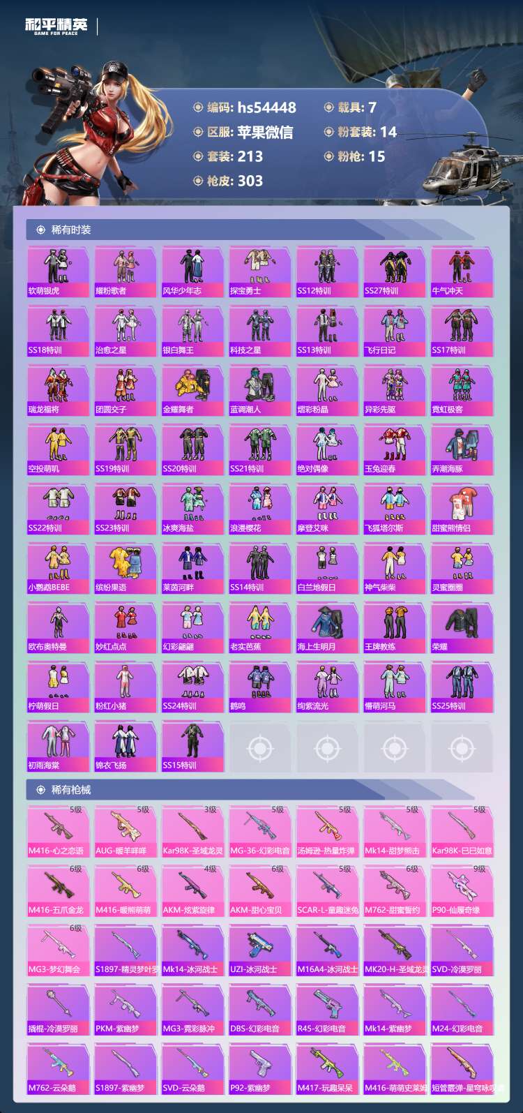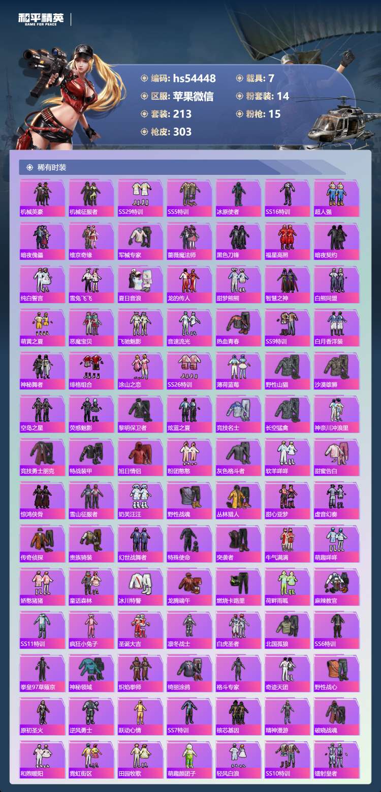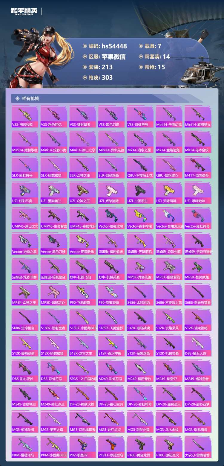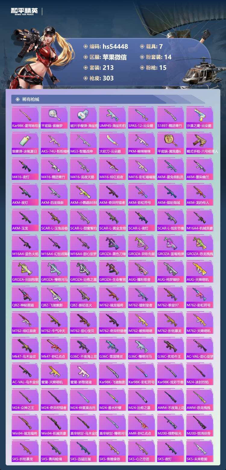 hs54448 苹果v-25王牌印记-14粉装-15特效枪-7载具-热力值-213套装