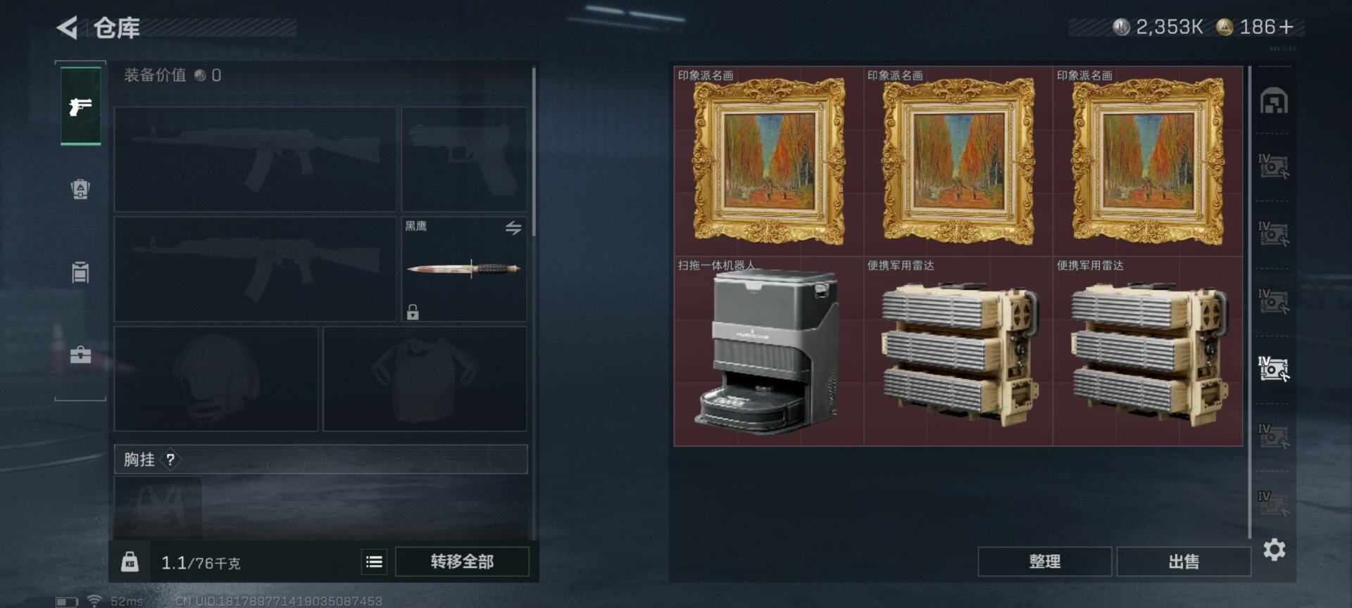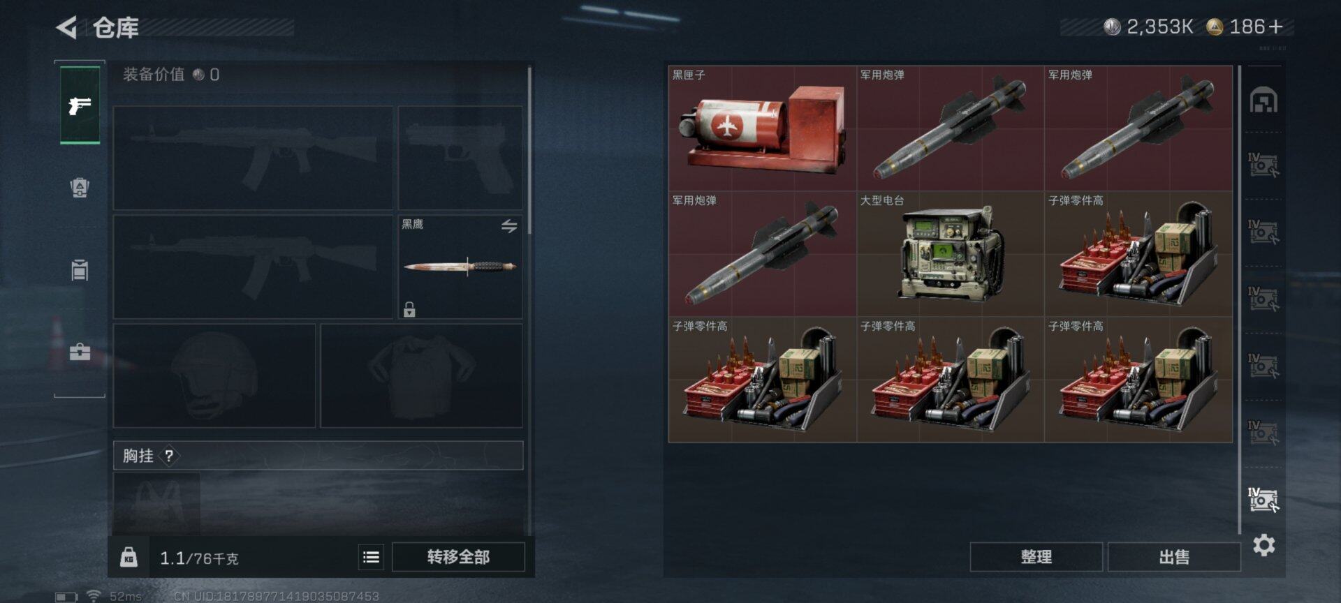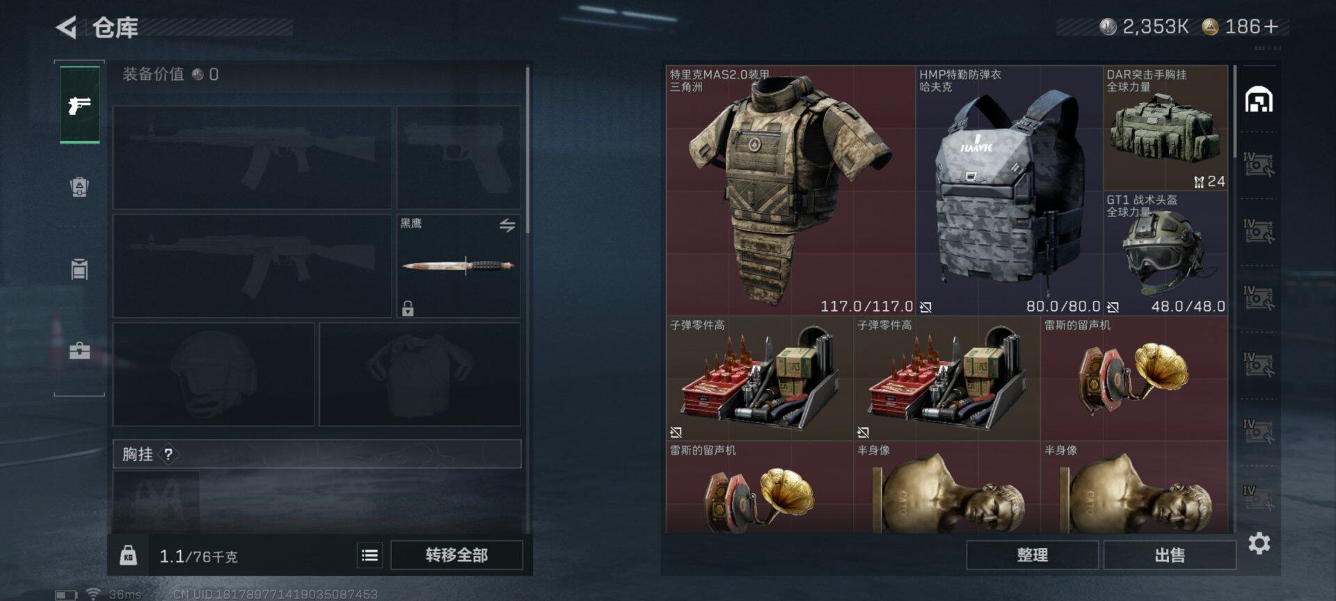 总资产153.8M哈弗币2353K近战武器-黑鹰红狼蚀金玫瑰,红狼电锯惊魂,骇爪维什戴尔无无AW子弹0发三角币186仓库LV.7进阶安全箱靶场LV.3训练中心LV.4统统拿走,红狼-蚀金玫瑰,红狼-电锯惊魂,骇爪-维什戴尔,近战-黑鹰,挂饰-统统拿走