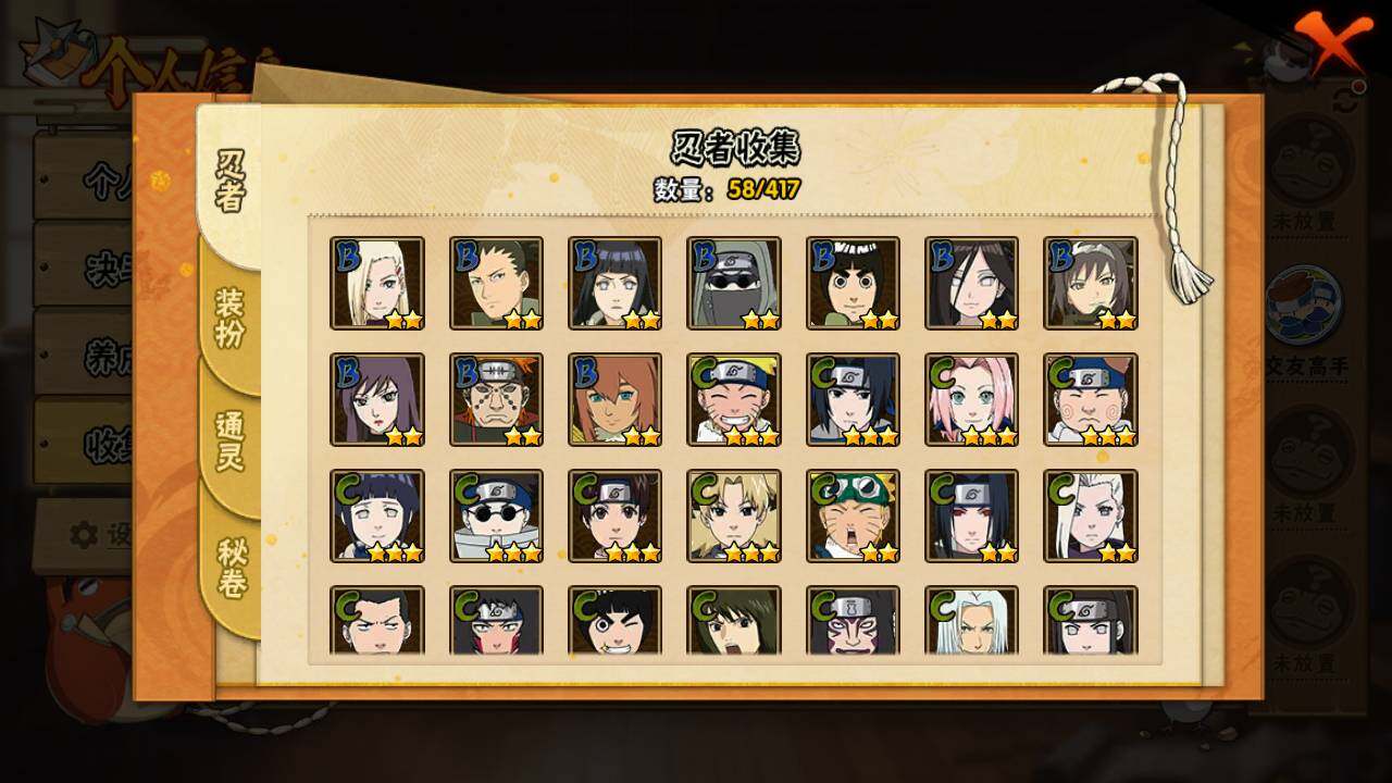 【S级忍者】:宇智波鼬「须佐能乎」(3星),自来也「舞之豪杰」(3星),自来也「传说中的三忍」(3星),佩恩「天道」(3星),漩涡鸣人「暴怒·第六尾」(3星)