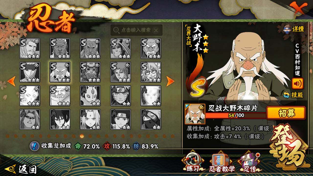 V10 1076万战力 20S-36A 日斩77片 烈斗58片 三代目风影71片 忍战大野木54片 LL5558