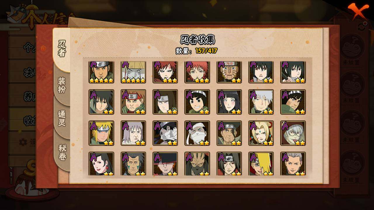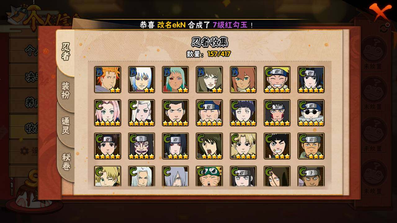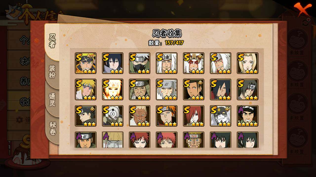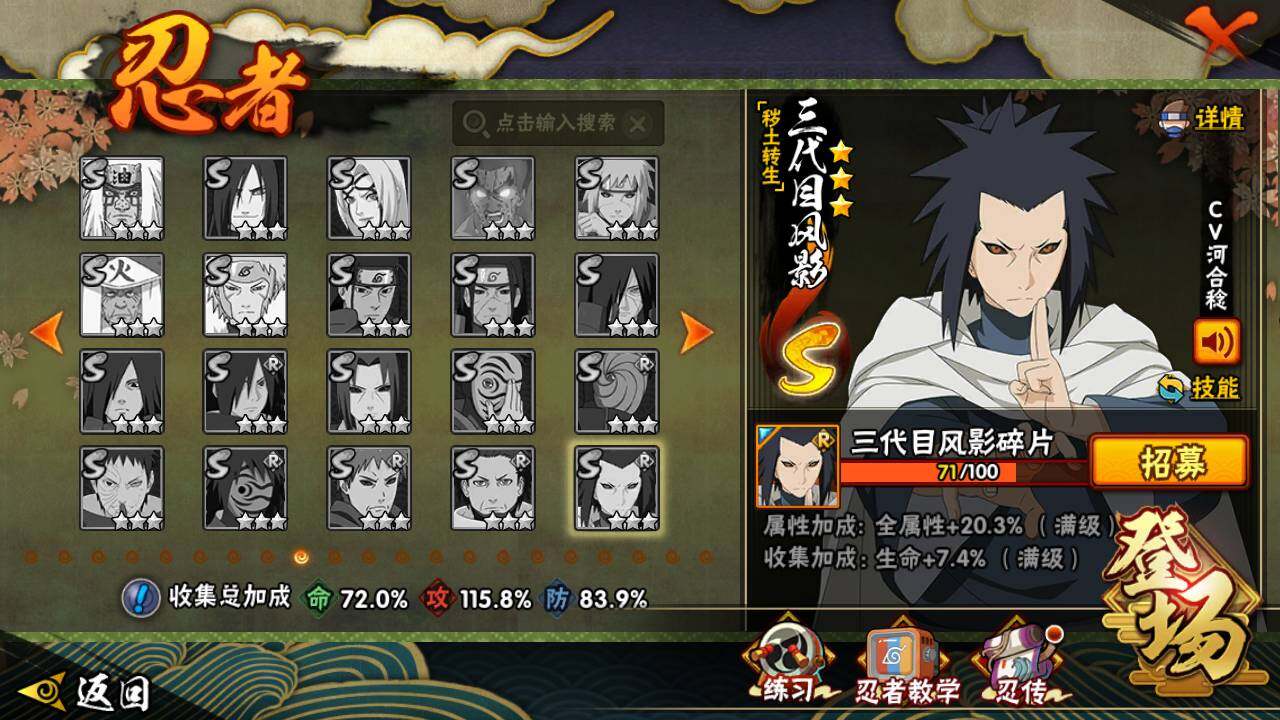 【S级忍者】:长门「秽土转生」(3星),猿飞日斩「秽土转生」(3星),千手扉间「秽土转生」(3星),宇智波斑「秽土转生·解」(3星),艾「忍界大战」(3星),宇智波鼬「须佐能乎」(3星),宇智波止水「须佐能乎」(3星),旗木卡卡西「须佐能乎」(3星),千手柱间「木叶创立」(3星),自