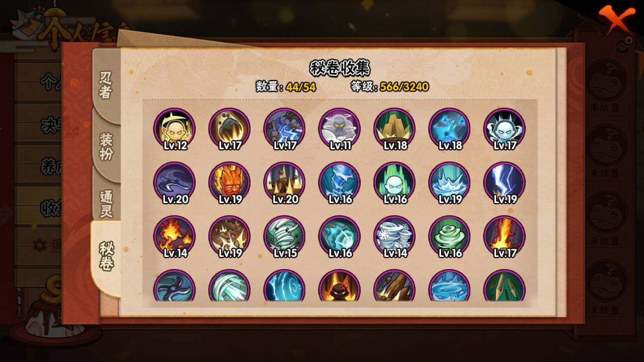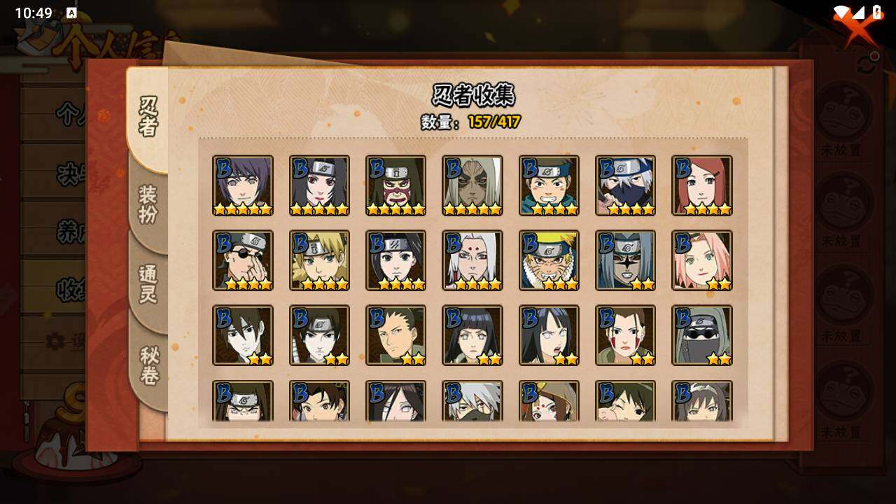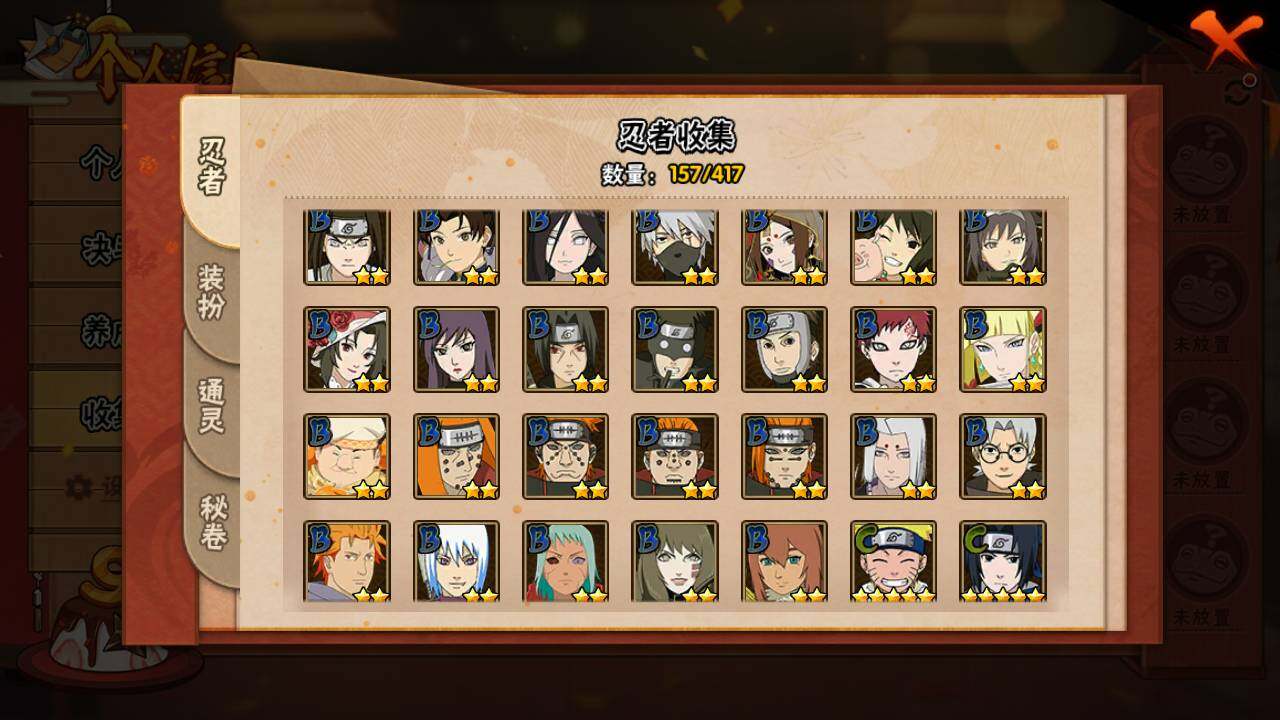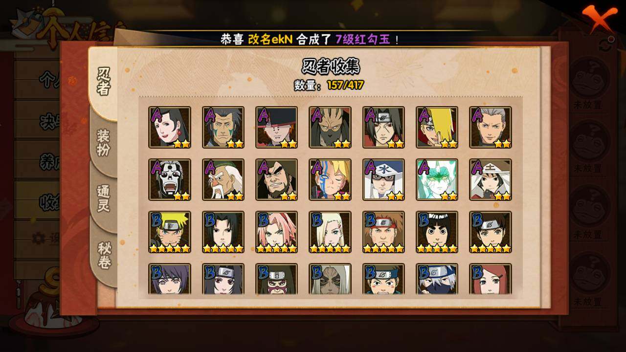 【S级忍者】:长门「秽土转生」(3星),猿飞日斩「秽土转生」(3星),千手扉间「秽土转生」(3星),宇智波斑「秽土转生·解」(3星),艾「忍界大战」(3星),宇智波鼬「须佐能乎」(3星),宇智波止水「须佐能乎」(3星),旗木卡卡西「须佐能乎」(3星),千手柱间「木叶创立」(3星),自