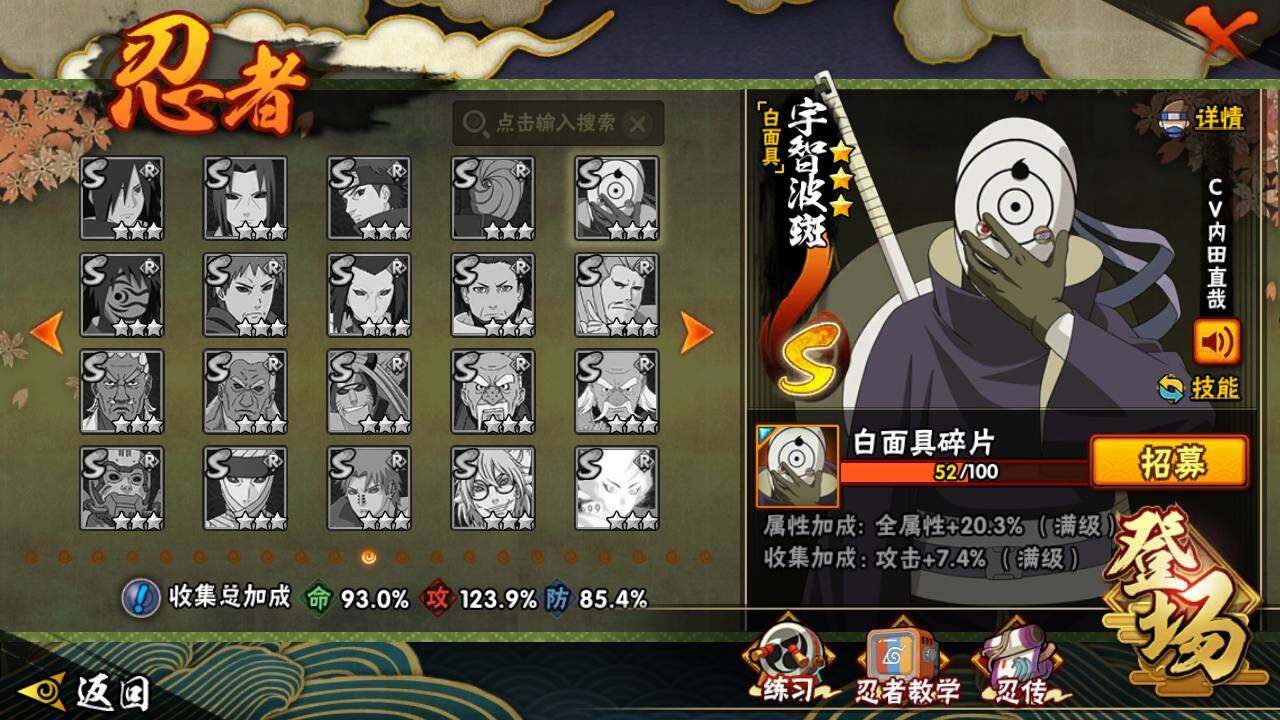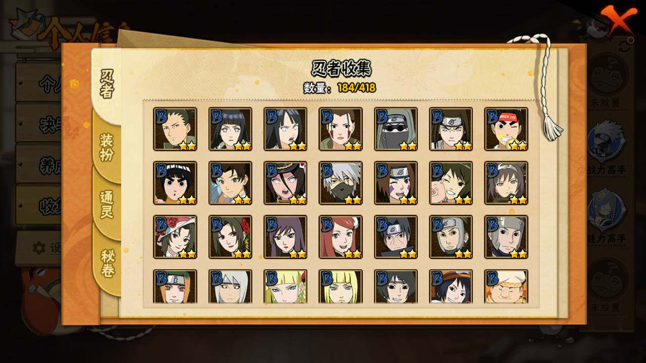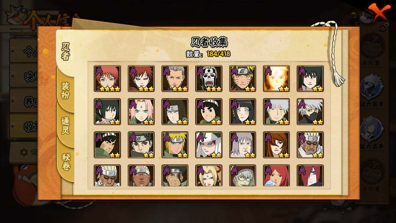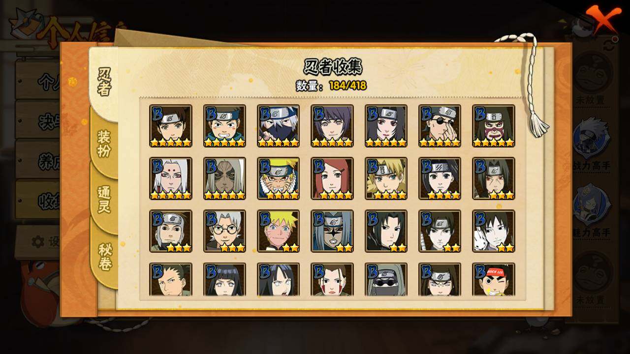 【S级忍者】:长门「秽土转生」(3星),宇智波斑「秽土转生」(3星),宇智波斑「秽土转生·解」(3星),宇智波带土「忍界大战」(3星),艾「忍界大战」(3星),宇智波鼬「须佐能乎」(3星),自来也「舞之豪杰」(3星),纲手(4星),纲手「百豪」(3星),猿飞日斩(3星),波风水门(3星),神秘面具男(3