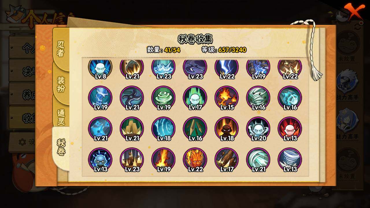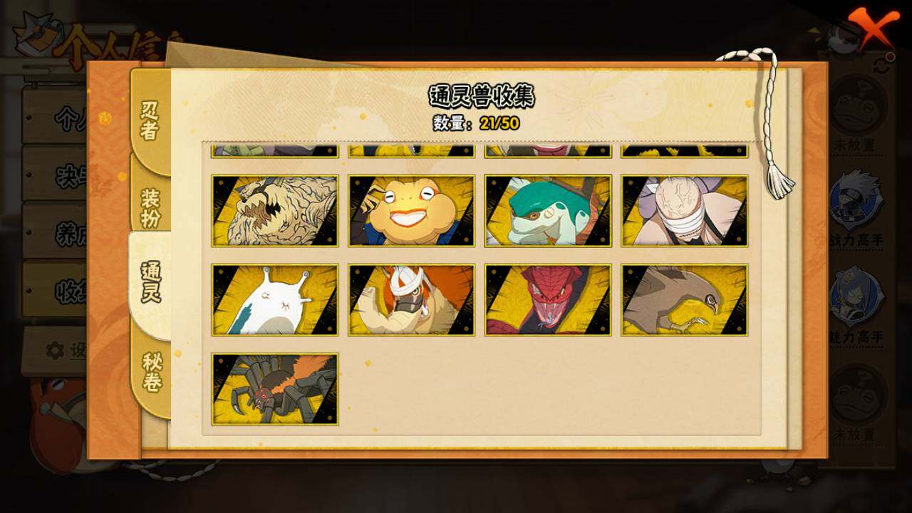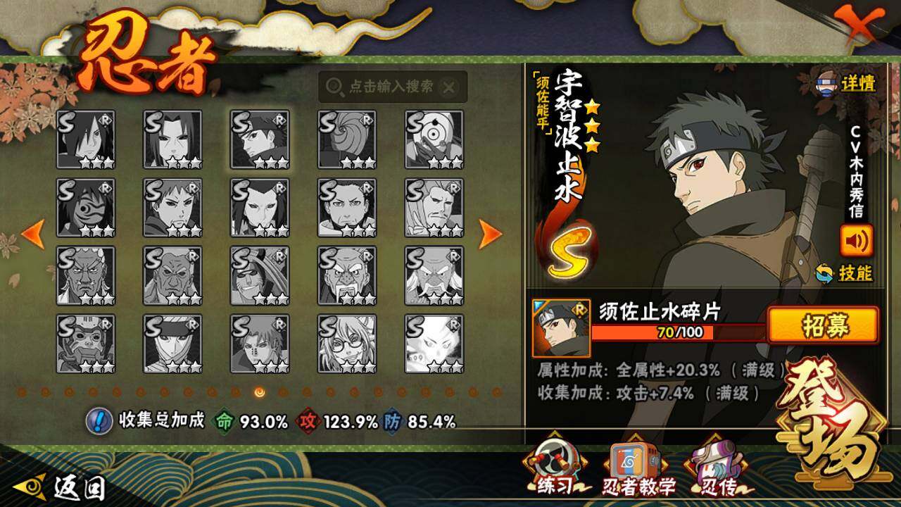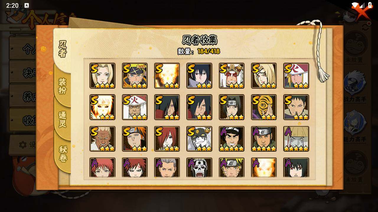 【S级忍者】:长门「秽土转生」(3星),宇智波斑「秽土转生」(3星),宇智波斑「秽土转生·解」(3星),宇智波带土「忍界大战」(3星),艾「忍界大战」(3星),宇智波鼬「须佐能乎」(3星),自来也「舞之豪杰」(3星),纲手(4星),纲手「百豪」(3星),猿飞日斩(3星),波风水门(3星),神秘面具男(3