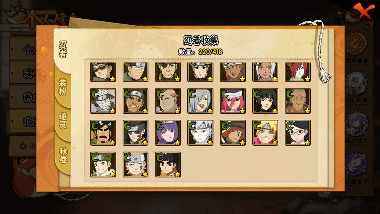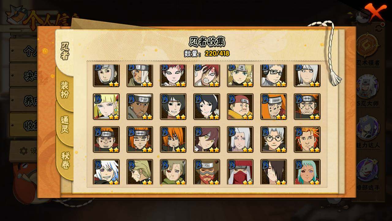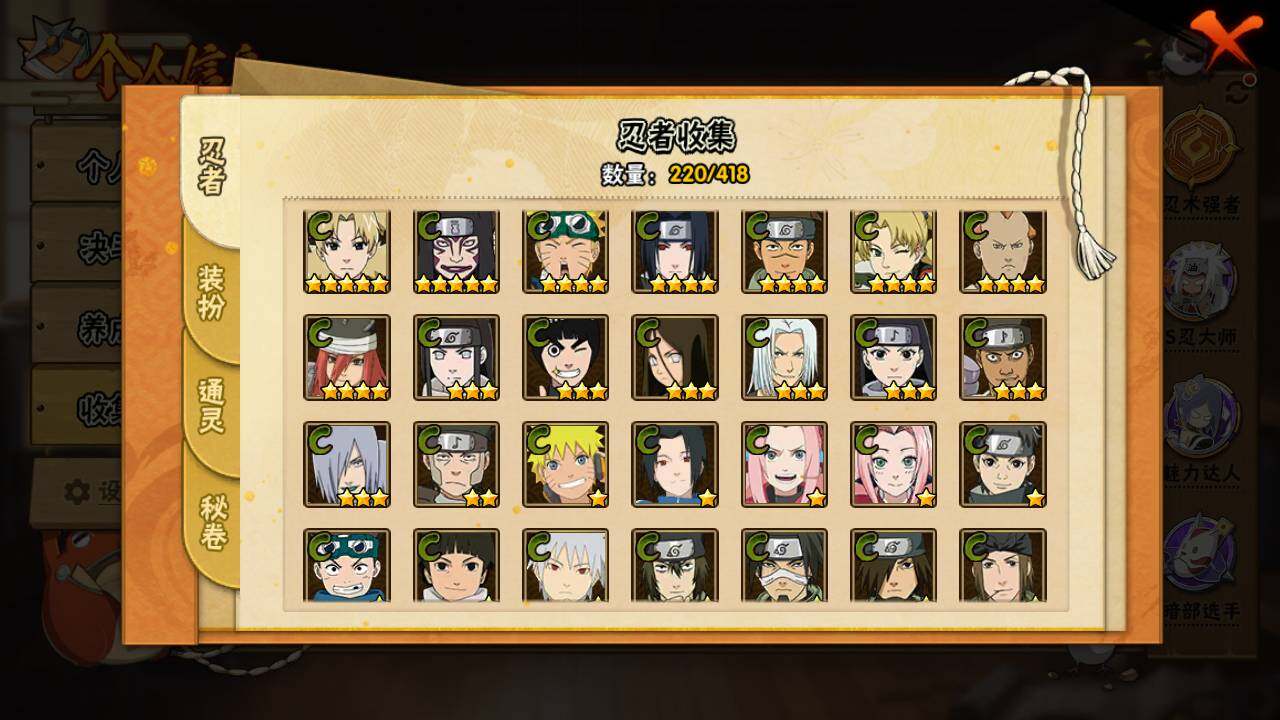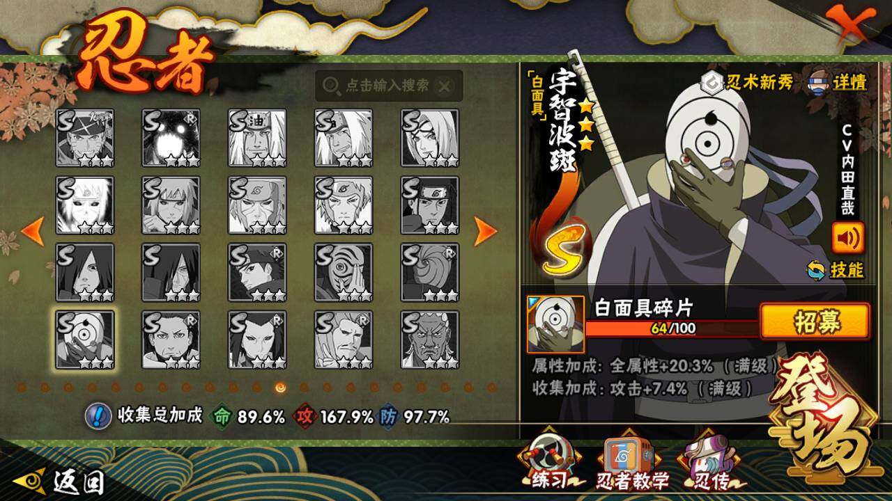 【S级忍者】:猿飞日斩「秽土转生」(3星),千手柱间「秽土转生」(3星),宇智波鼬「秽土转生」(3星),宇智波斑「秽土转生·解」(3星),大野木「忍界大战」(3星),春野樱「忍界大战」(3星),宇智波带土「忍界大战」(3星),宇智波鼬「