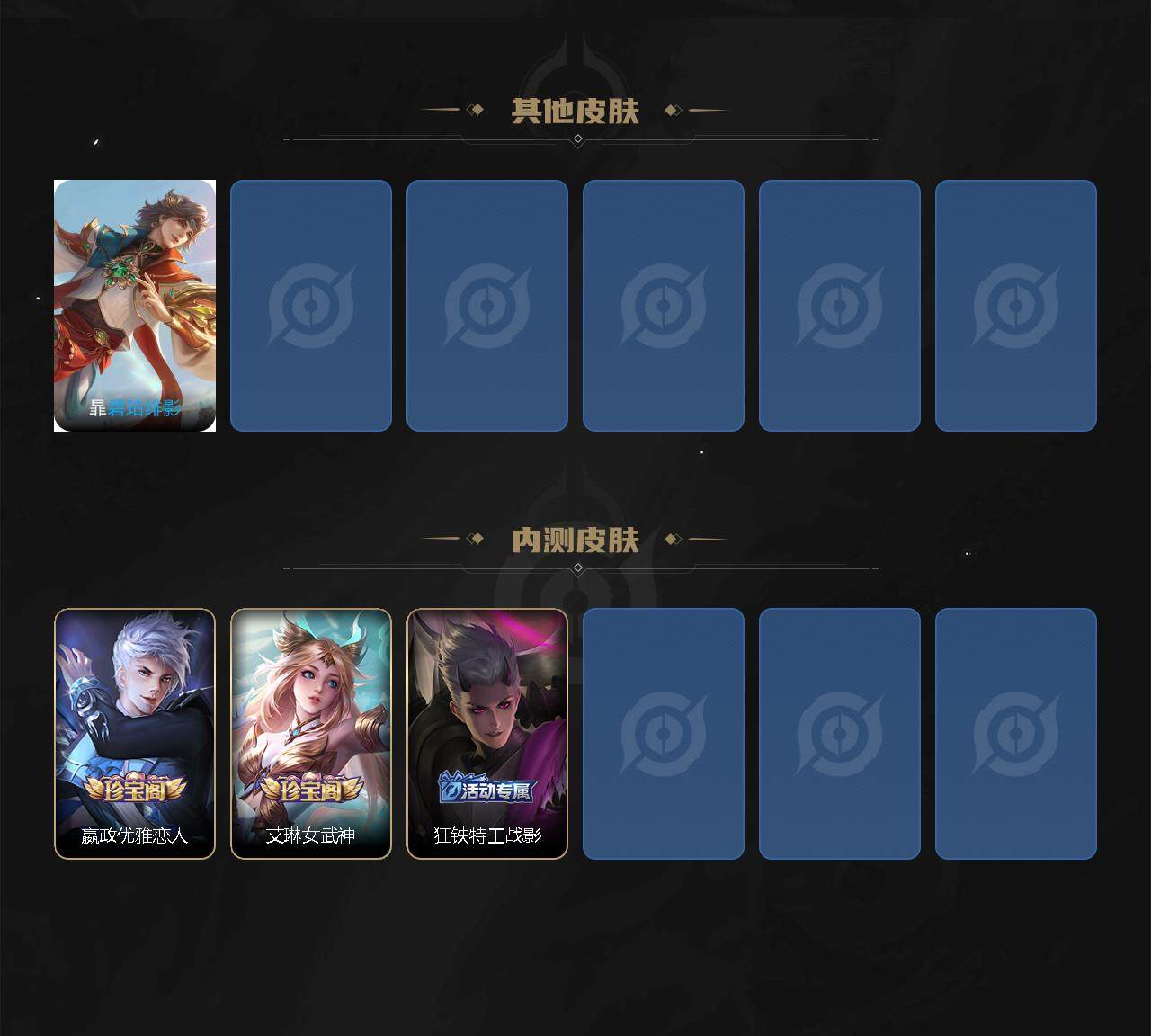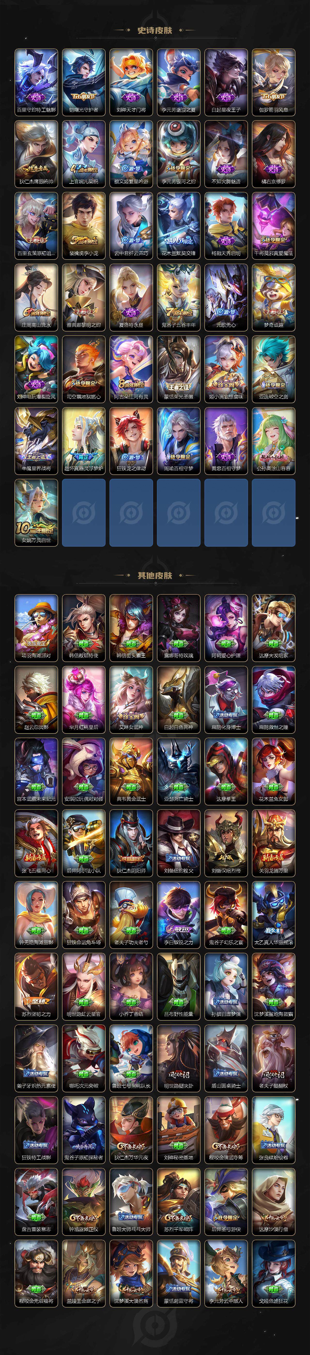 【限定皮肤】:姜子牙天穹之誓,狄仁杰阴阳师,赵云皇家上将,嬴政优雅恋人,庄周高山流水,元歌无心,狄仁杰魔术师,狄仁杰万华元夜,达摩沙漠行僧,项羽海滩派对,老夫子醍醐杖,程咬金演武夺筹,兰陵王金庭之子,花木兰默契交锋,后羿圣弓游侠,李元芳银河之约,李