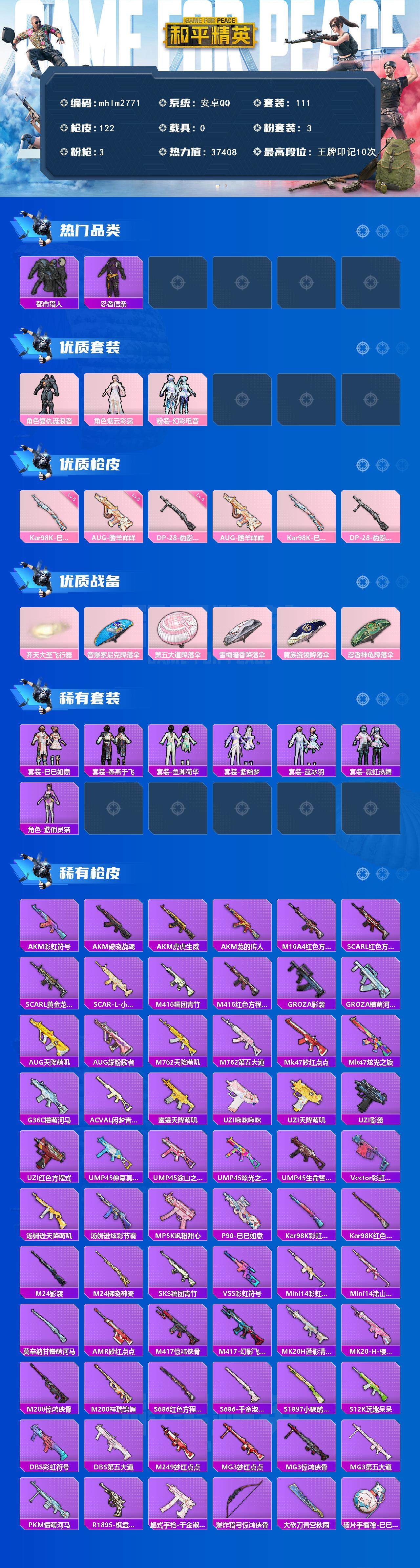 【mhlm2771】安卓 手Q-3粉装-3特效枪-0载具-2粉色飞行器-37408热力值-10王牌印记-111套装-122枪皮