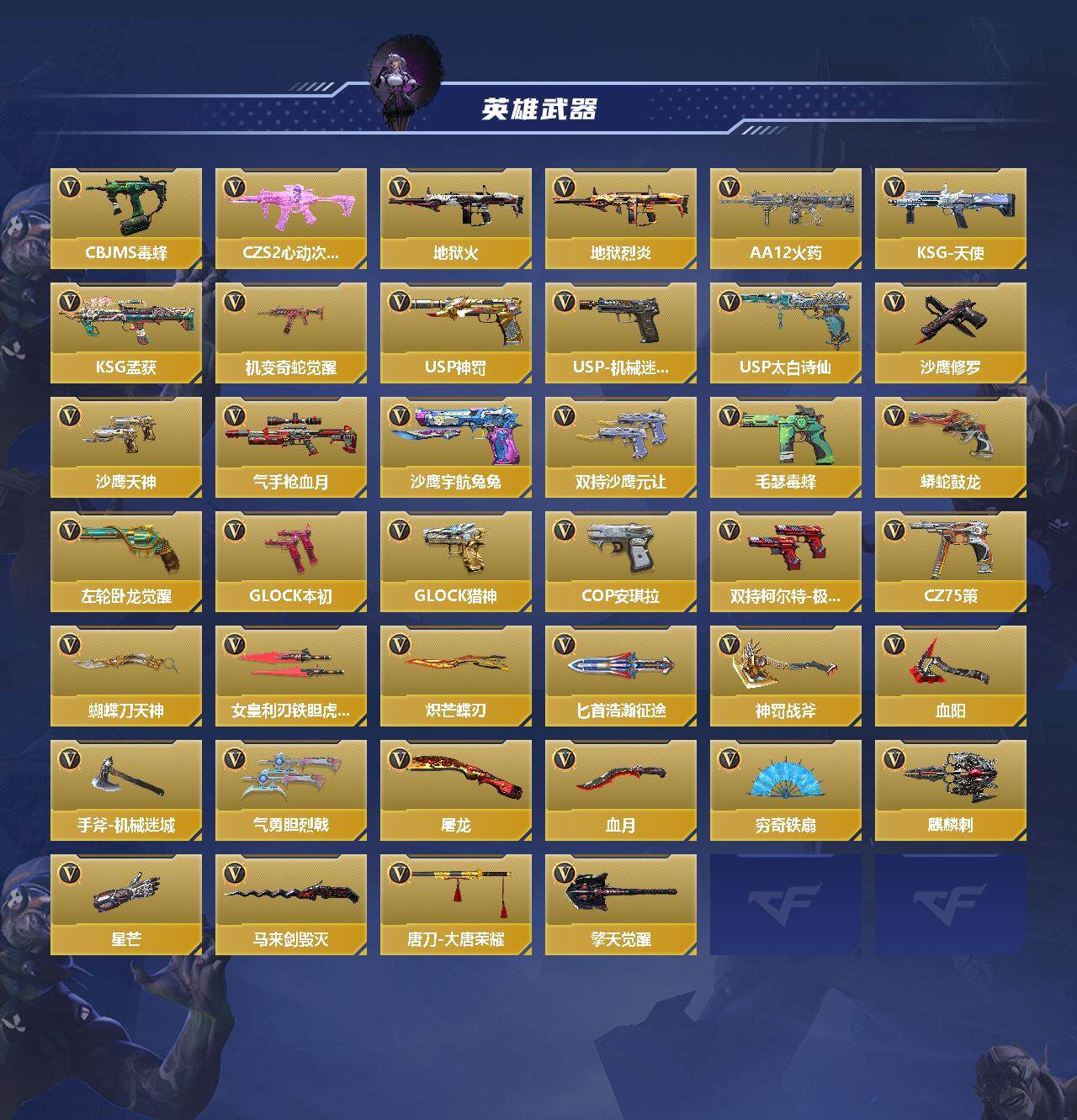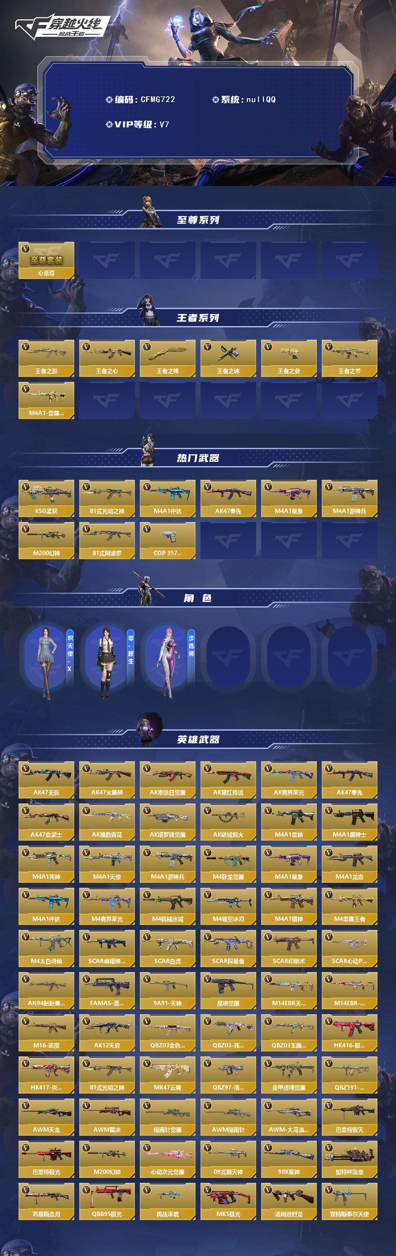 【CFMG722】VIP7/220V/心至尊/王者之影/王者之心/王者之锋/王者之魂/王者之业/王者之誉/M4A1-雷霆王者/KSG-孟获/81式-光明之神/M4A1-仲达/AK47-奉先/M4A1-星象/M4A1-游骑兵/M200-幻神/81式-阿波罗/COP 357-安琪拉/炽天使-X/零-新生/步练师/AK47-无影/AK47-火麒麟/AK47-幸运日觉醒/AK47-猩红传说/AK47-竞界荣光/AK47奉先/AK47-血武士/AK47-雅韵青花/AK47-塔罗牌觉醒/AK47-谜城烟火/