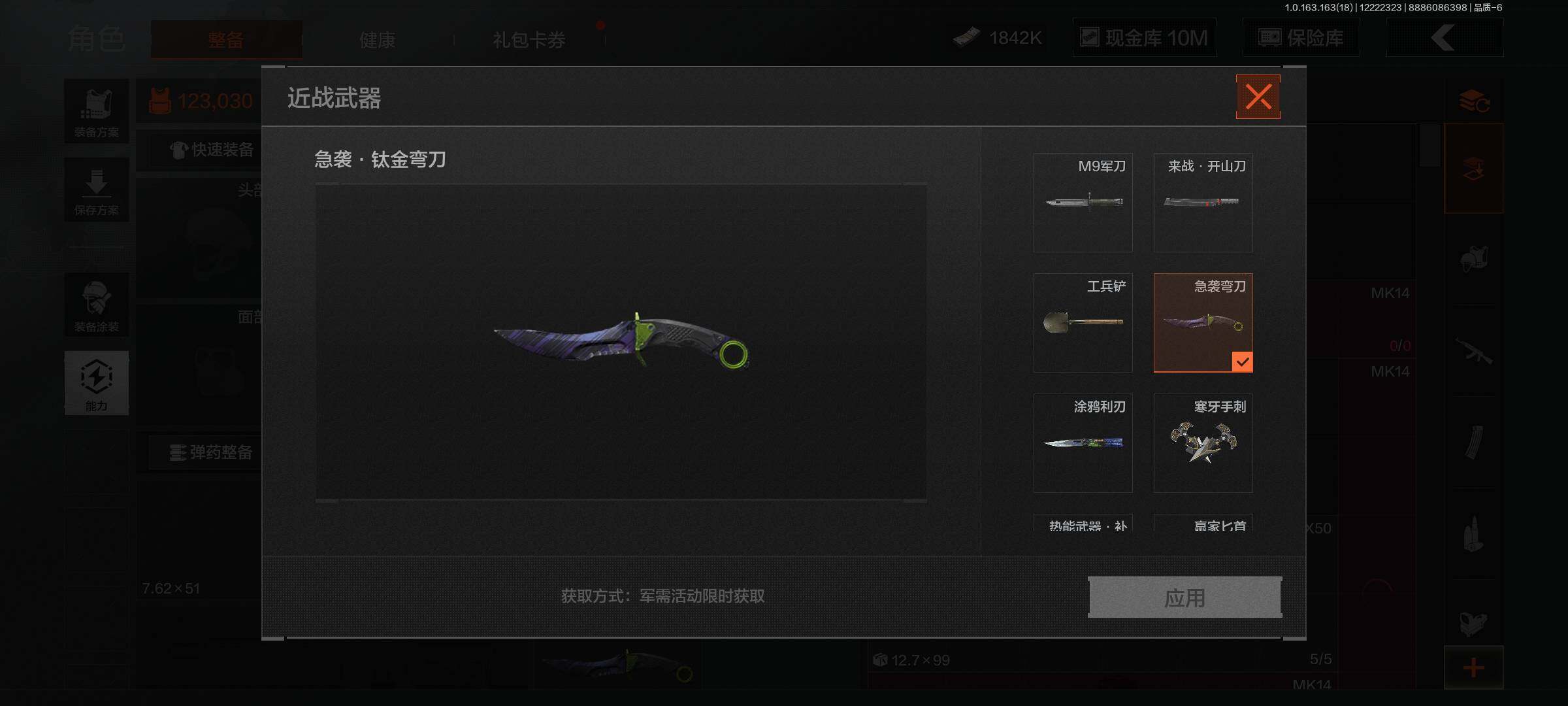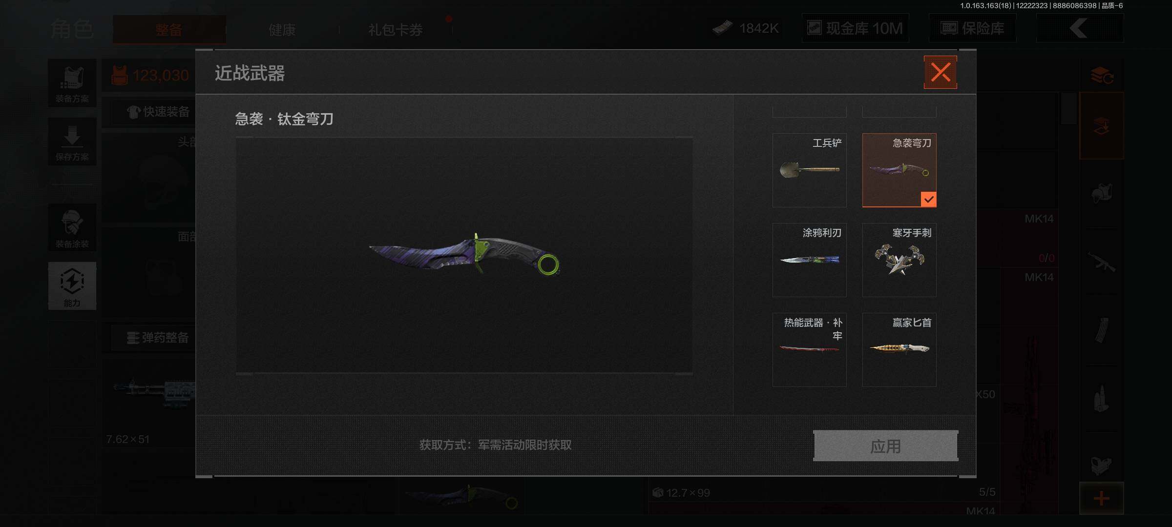 【AQZG755】等级:30/段位:专家/仓库价值(百万):22/柯恩币:11842002/热能武器补牢/急袭弯刀/涂鸦利刃/寒牙手刺/赢家匕首/工兵铲/旗帜AEK/冰河碎影MK14