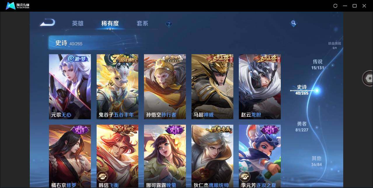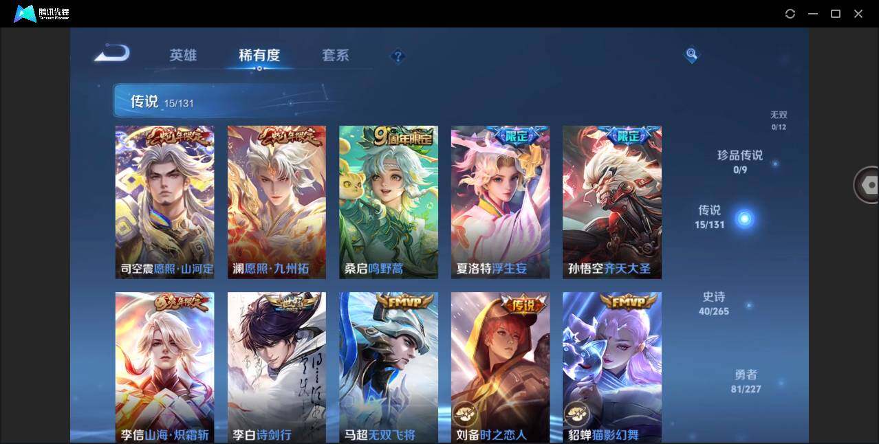 【传说皮肤】:司空震愿照山河定,澜愿照九州拓,桑启鸣野蒿,夏洛特浮生妄,孙悟空齐天大圣,李信山海炽霜斩,李白诗剑行,马超无双飞将,刘备时之恋人,貂蝉猫影幻舞,虞姬云霓雀翎,后羿黄金射手座,孙尚香末日机甲,宫本武藏地狱之眼,狄仁杰超时空战士