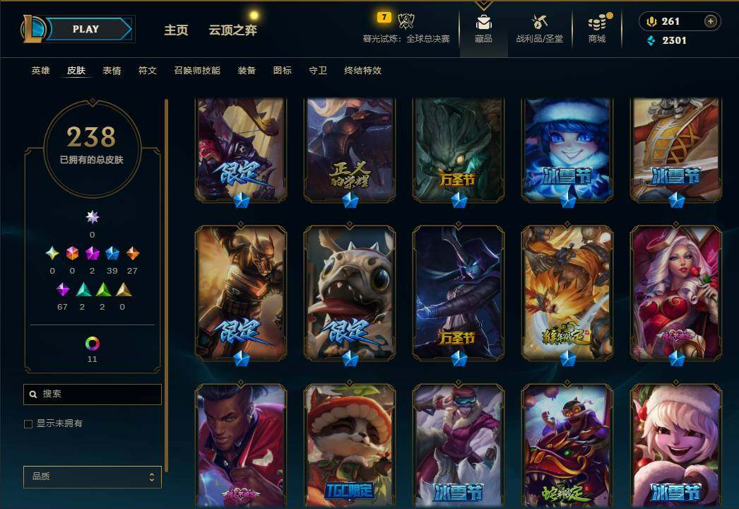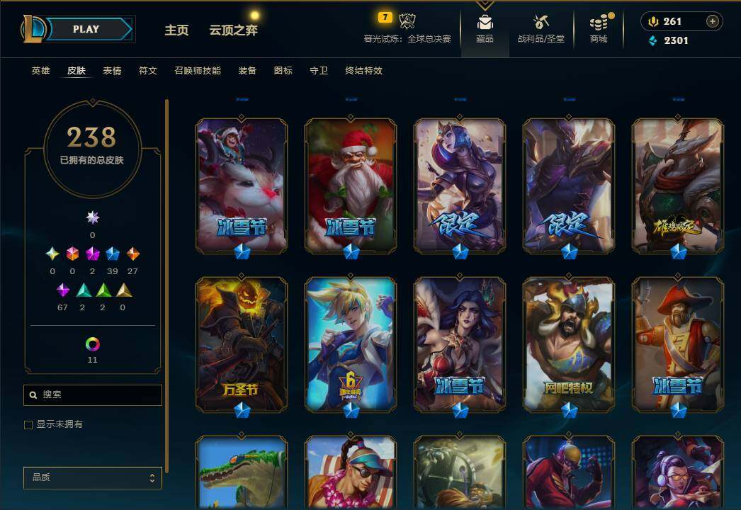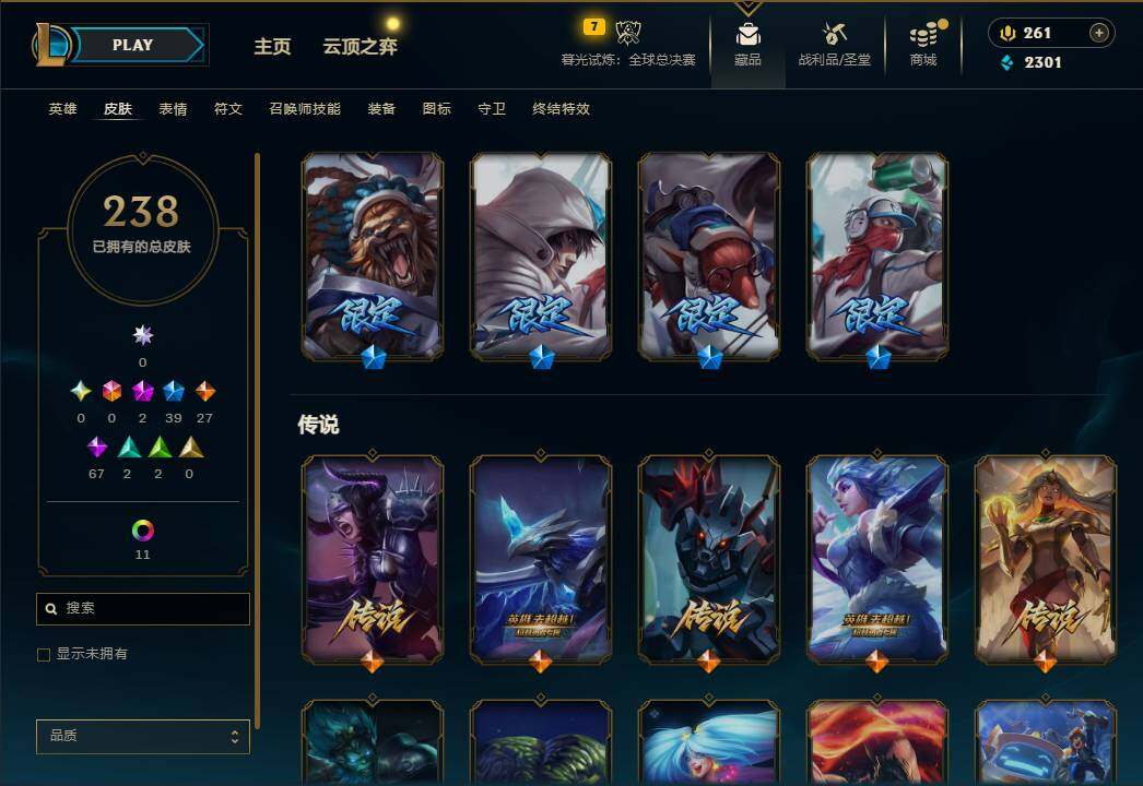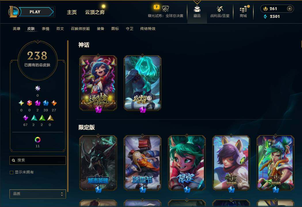 162英雄/238皮肤/2神话/39限定/11炫彩/27传说/67史诗/未定级账号等级:297