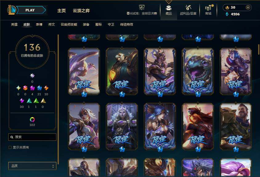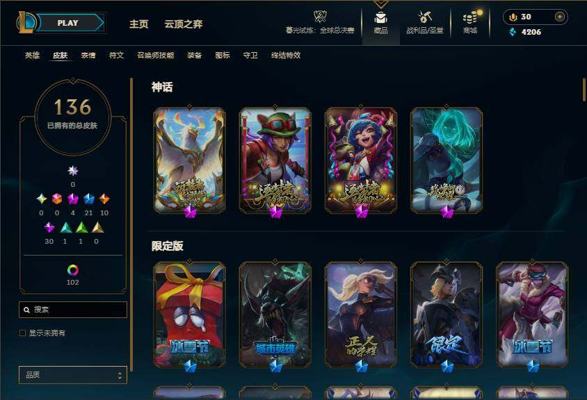 172英雄/136皮肤/4神话/21限定/4臻彩/110炫彩/10传说/30史诗/未定级/