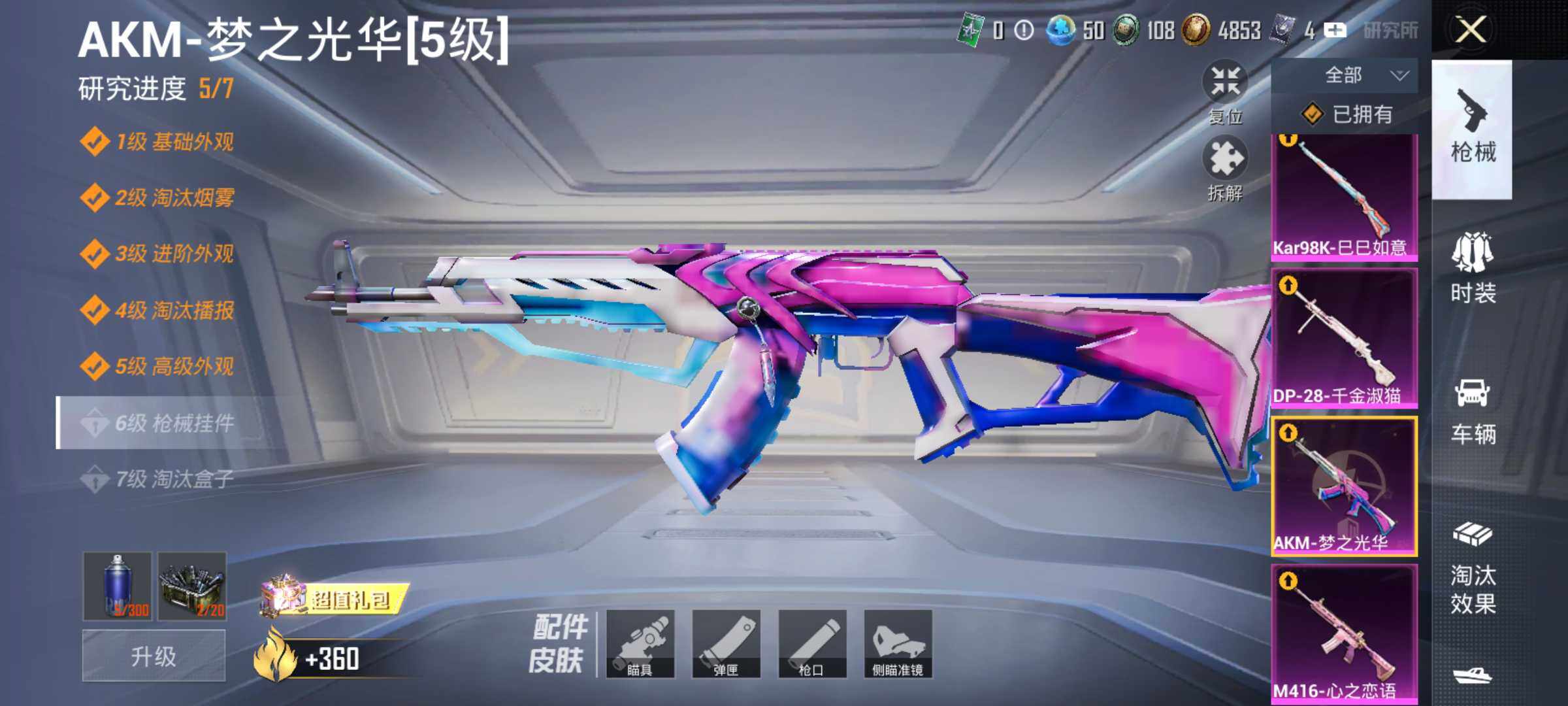 【粉色枪皮等级】:AKM-梦之光华(五级),M416-心之恋语(七级),Kar98K-巳巳如意(五级),DP-28-千金淑猫(四级),DP-28-豹影疾电(五级),平底锅-喜羊羊与灰太狼(二级)