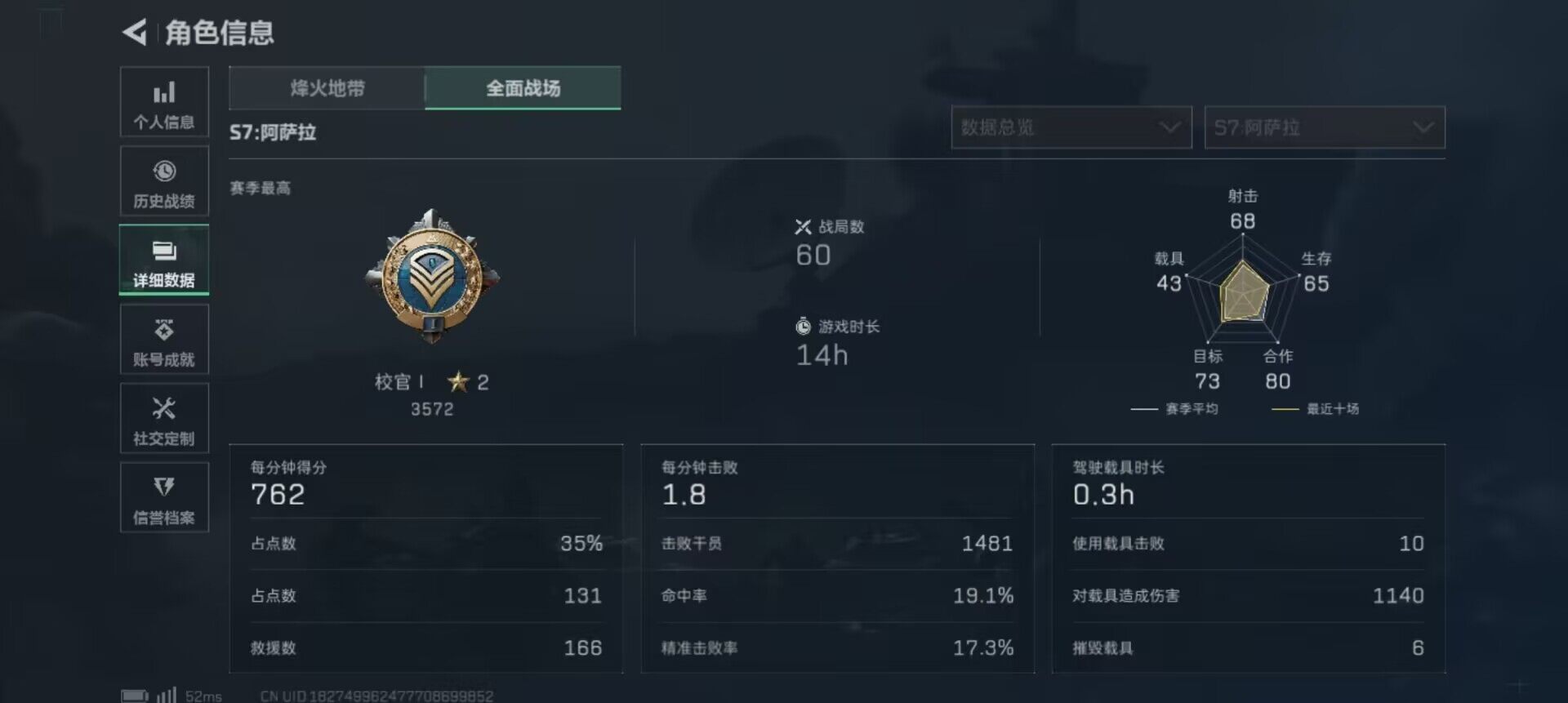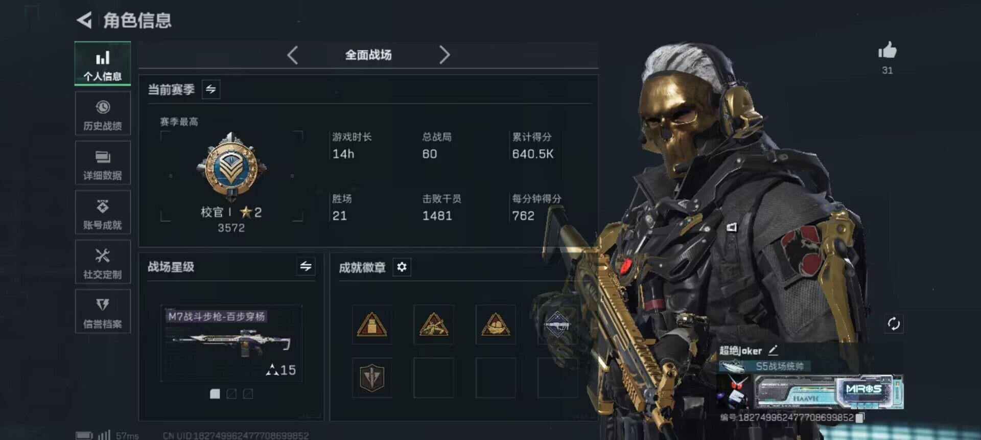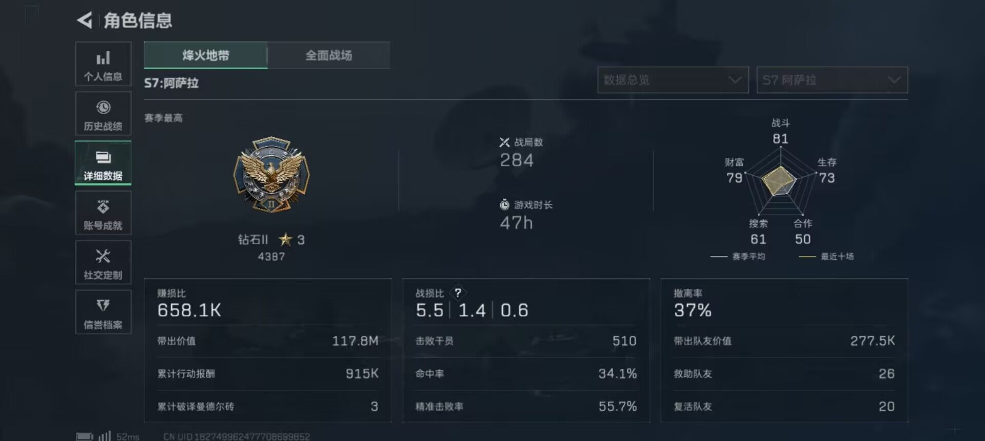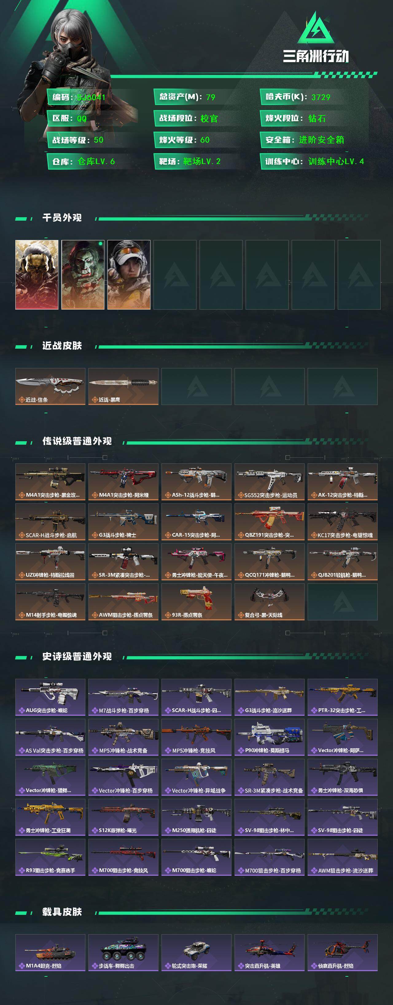 总资产(M):79M/哈夫币(K):3729K/哈夫币(K):3729K/全面战场等级:50_段位: