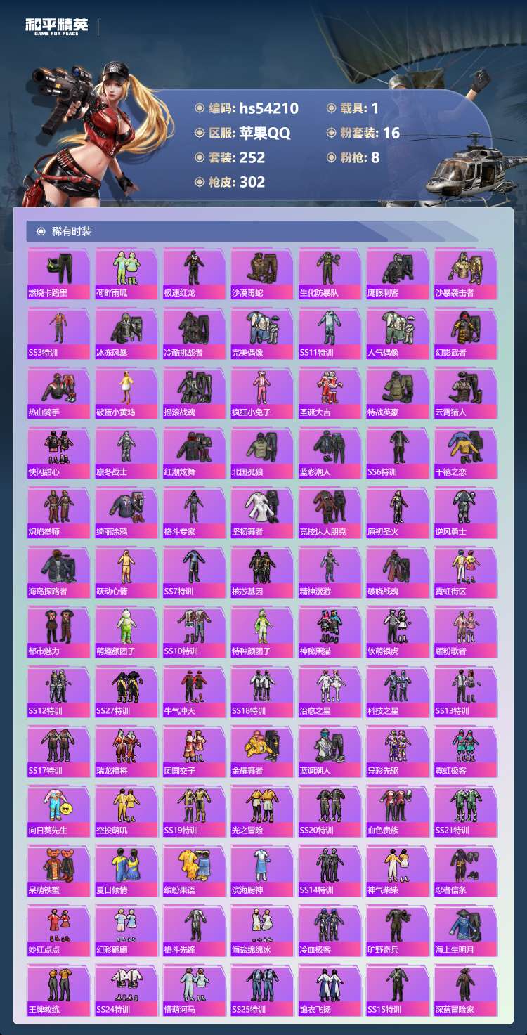 hs54210 苹果手Q-26王牌印记-有战神框-16粉装-8特效枪-1载具-98013热力值-25